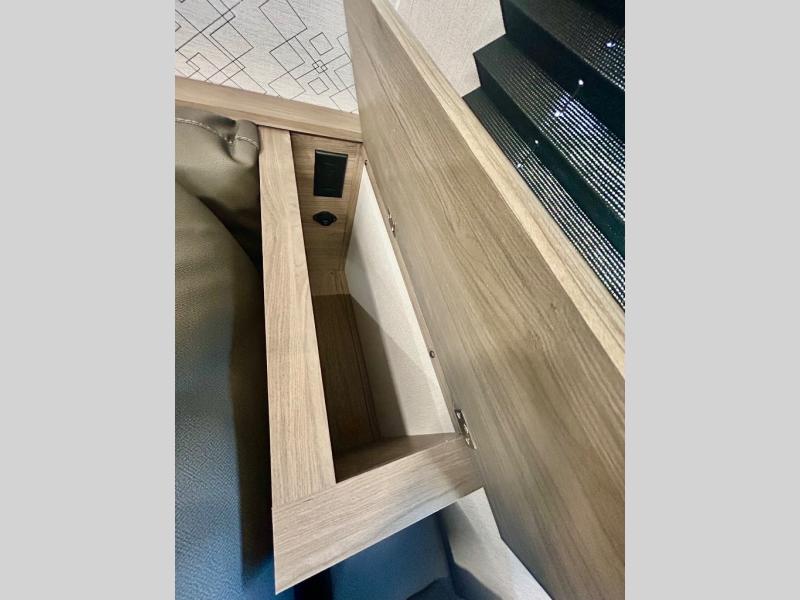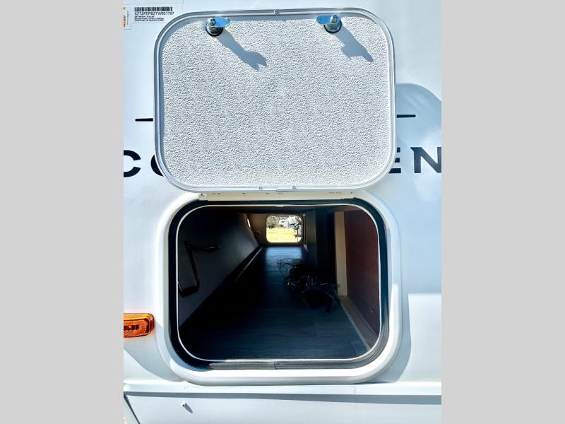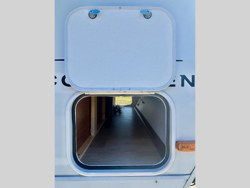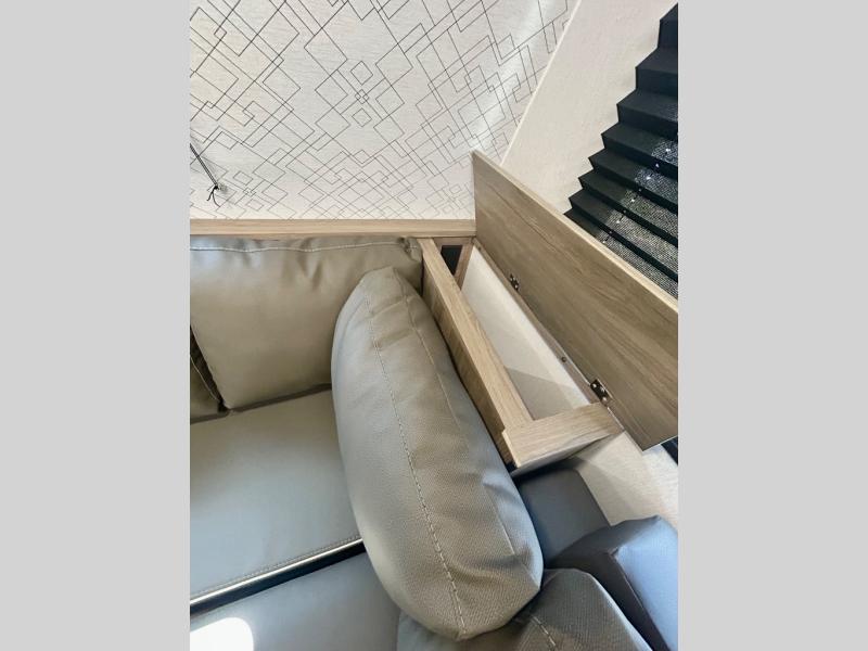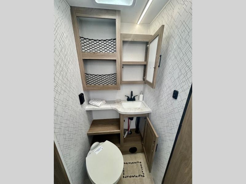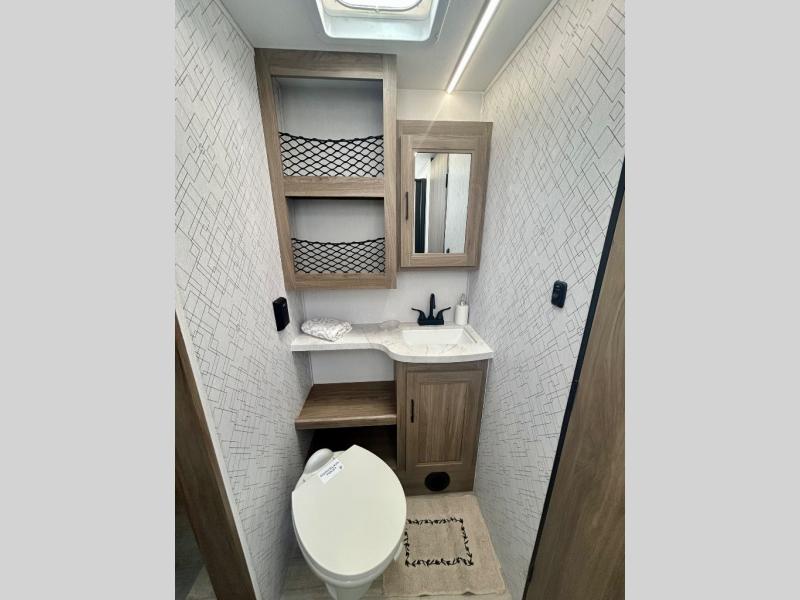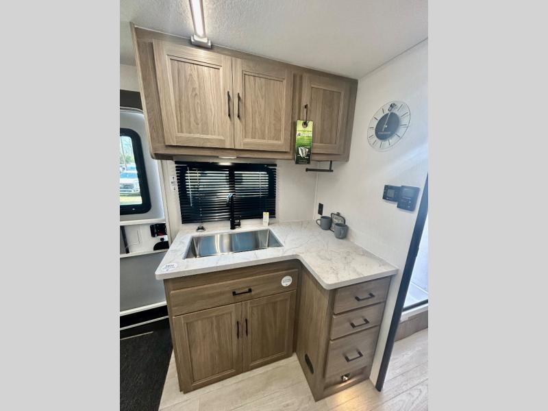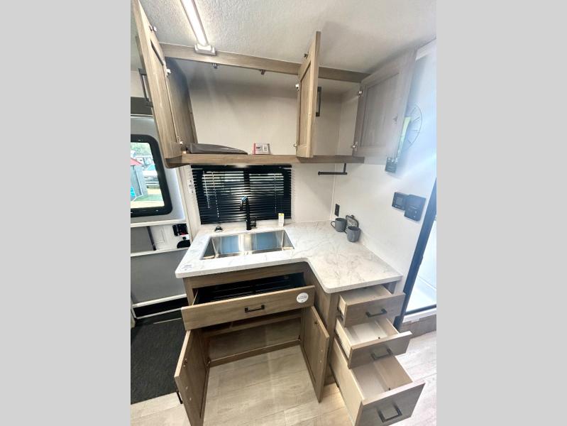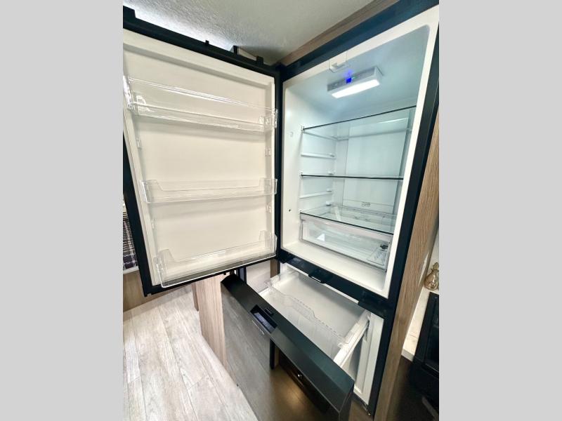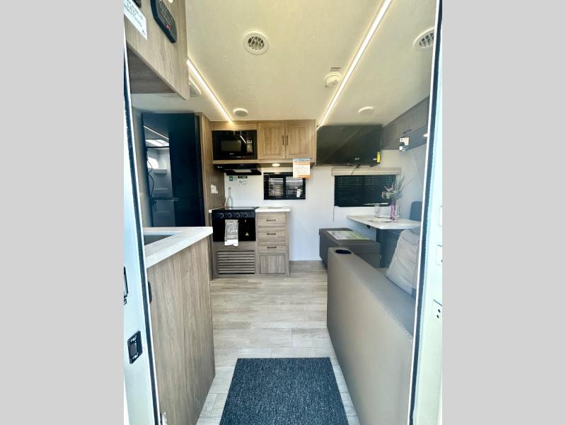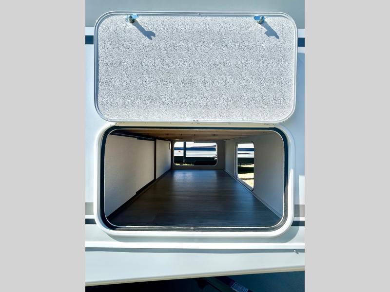Step inside this travel trailer and be welcomed by a spacious front living area featuring a full-width sofa, complemented by a cozy dinette, ottoman, and an entertainment center—perfect for relaxing, dining, or planning your day. The central kitchen is fully equipped for the chef, boasting a 10 cubic ft refrigerator, Magic Chef gas cooktop, microwave, and ample overhead storage. Moving forward, a convenient pass-through full bathroom offers practicality on the go. At the rear, the bedroom features a comfortable 60" x 80" queen bed, flanked by wardrobes on each side and additional overhead storage to keep all your essentials neatly organized.