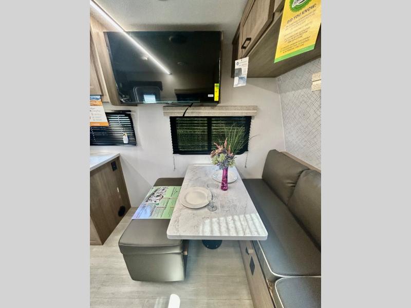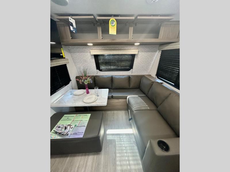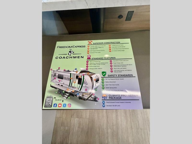 With any Freedom Express Select travel trailer by Coachmen you will find an alumicage construction and two-step vacuum bonded and pinch rolled sidewalls with Azdel interior and exterior for a trailer made to last. These Select value models come standard with a Bluetooth interior speaker, night shades, and wear-resistant vinyl flooring throughout. You will appreciate the power tongue jack, as well as the Dicor Tufflex PVC roof and heated and enclosed underbelly to help with protection and climate control. A GE 15K BTU roof A/C will keep you comfortable, and the suburban tankless water heater will provide endless hot showers!