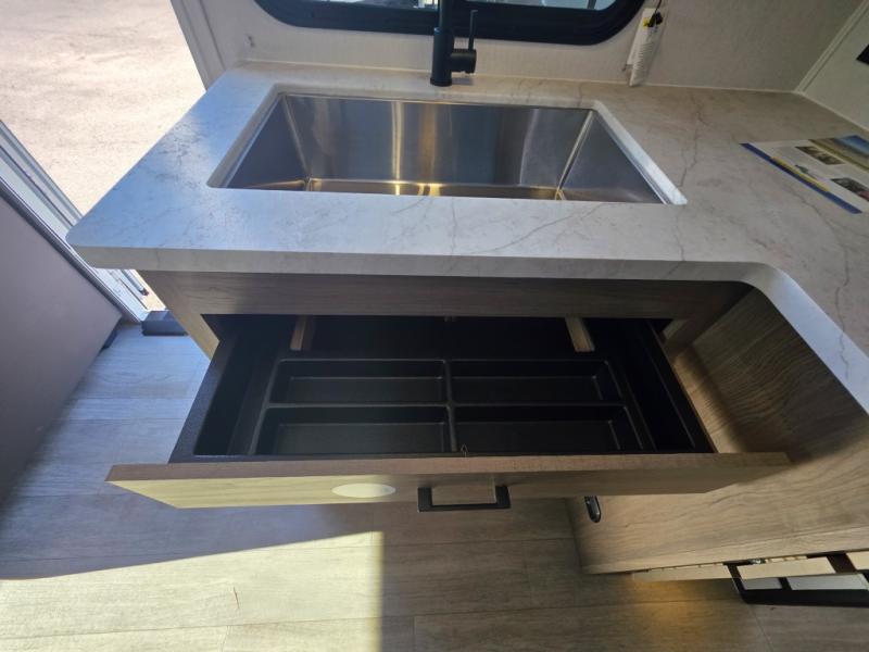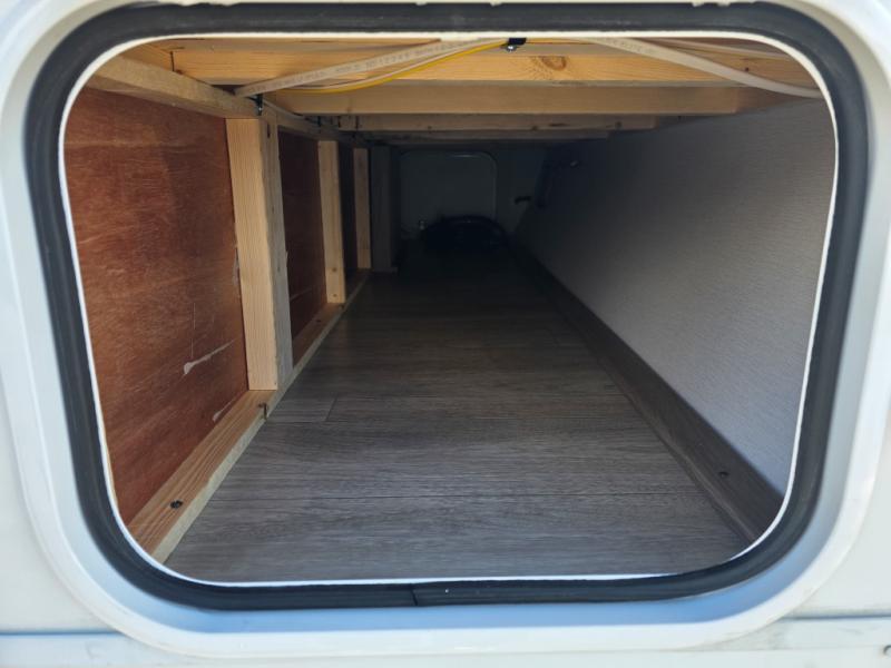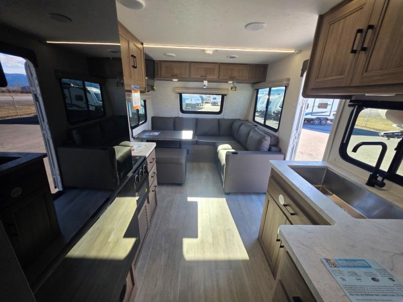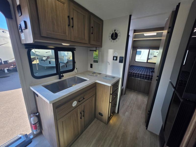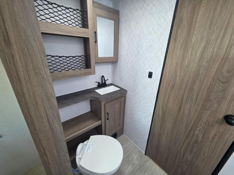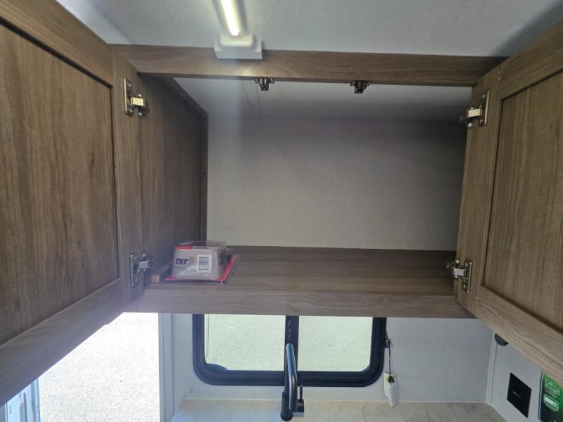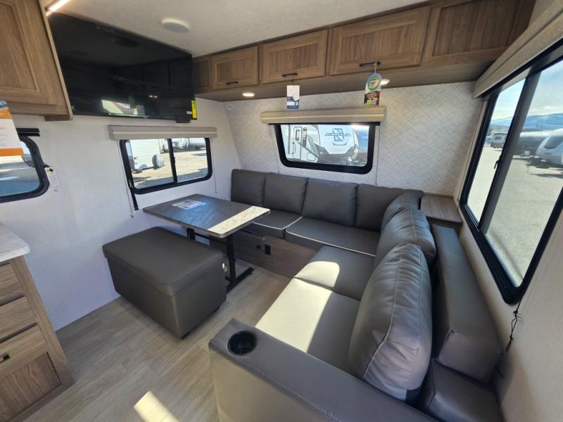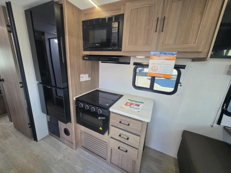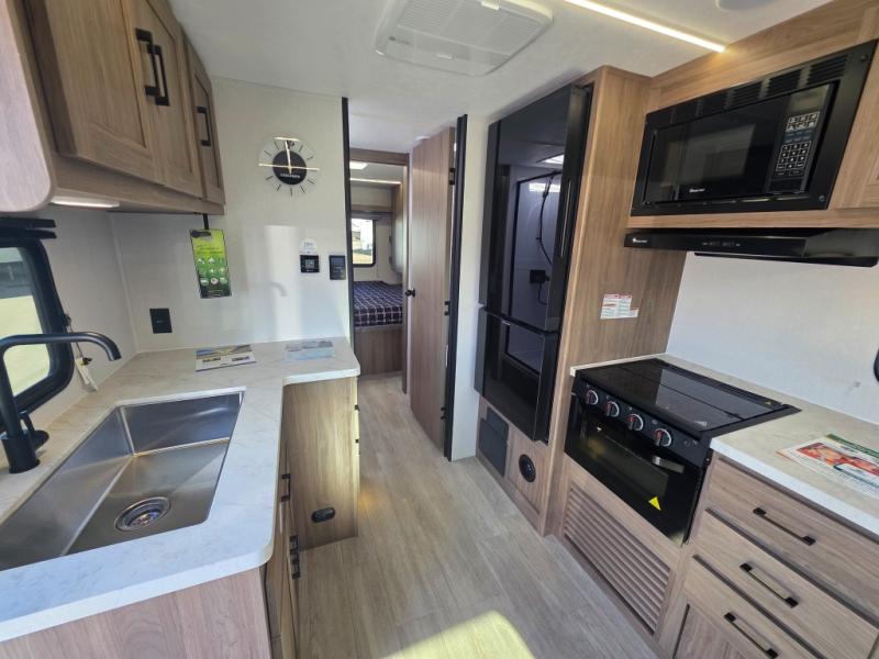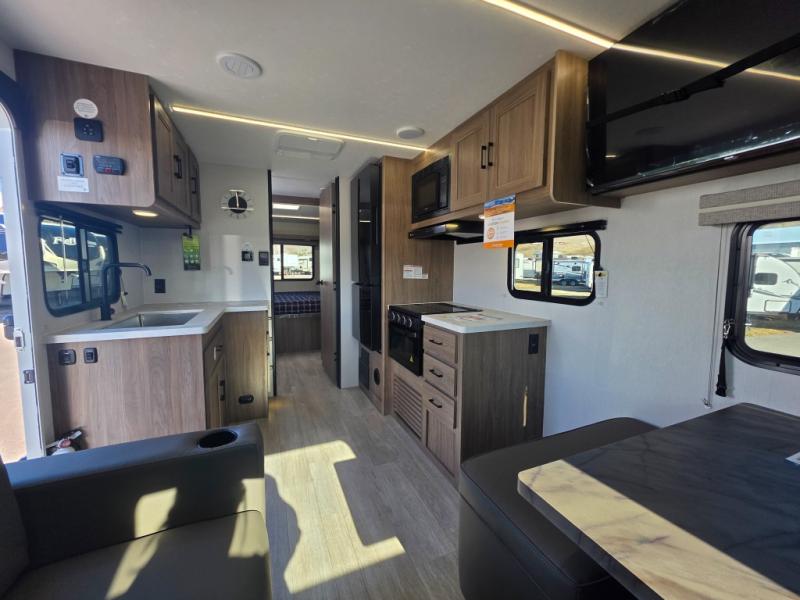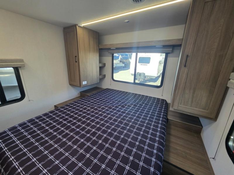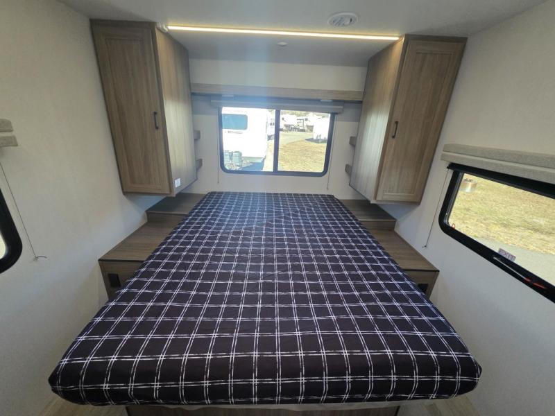 Step inside this travel trailer and be welcomed by a spacious front living area featuring a full-width sofa, complemented by a cozy dinette, ottoman, and an entertainment center—perfect for relaxing, dining, or planning your day. The central kitchen is fully equipped for the chef, boasting a 10 cubic ft refrigerator, Magic Chef gas cooktop, microwave, and ample overhead storage. Moving forward, a convenient pass-through full bathroom offers practicality on the go. At the rear, the bedroom features a comfortable 60" x 80" queen bed, flanked by wardrobes on each side and additional overhead storage to keep all your essentials neatly organized.