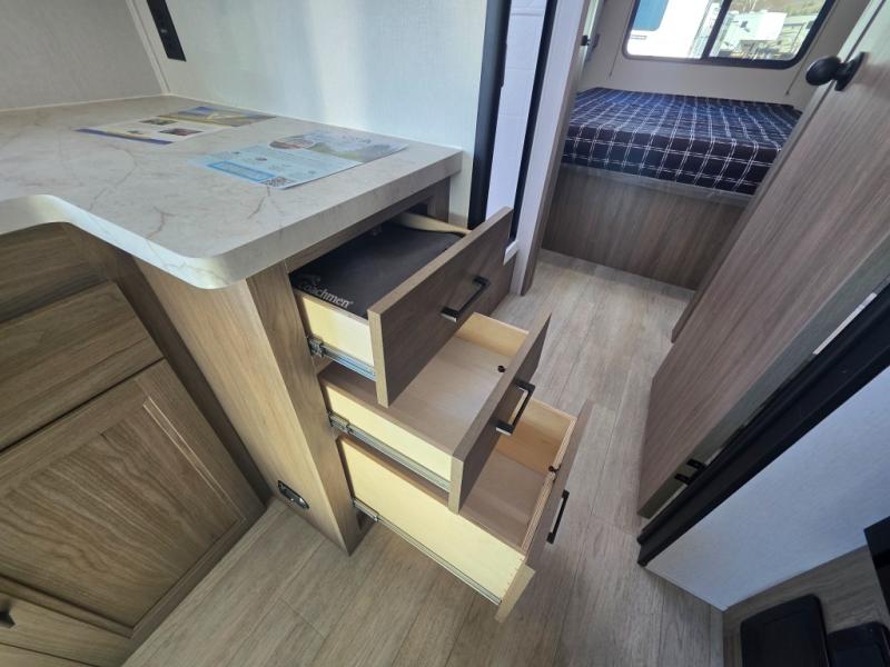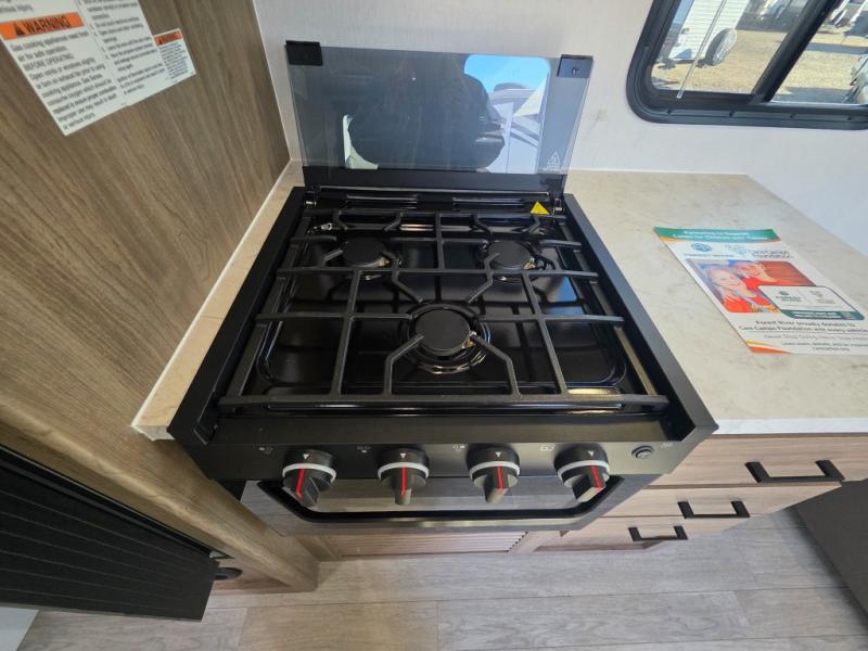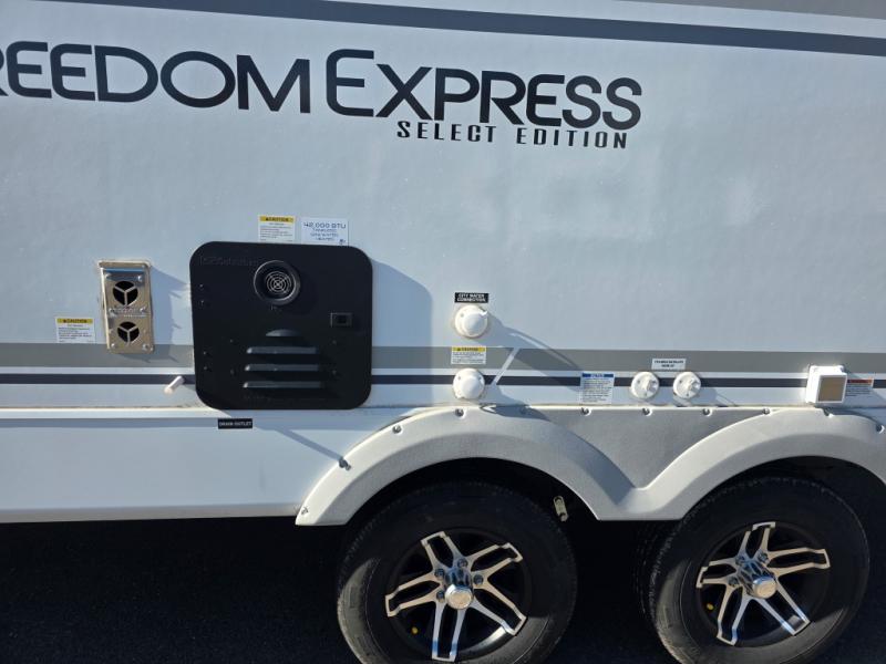 With any Freedom Express Select travel trailer by Coachmen you will find an alumicage construction and two-step vacuum bonded and pinch rolled sidewalls with Azdel interior and exterior for a trailer made to last. These Select value models come standard with a Bluetooth interior speaker, night shades, and wear-resistant vinyl flooring throughout. You will appreciate the power tongue jack, as well as the Dicor Tufflex PVC roof and heated and enclosed underbelly to help with protection and climate control. A GE 15K BTU roof A/C will keep you comfortable, and the suburban tankless water heater will provide endless hot showers!