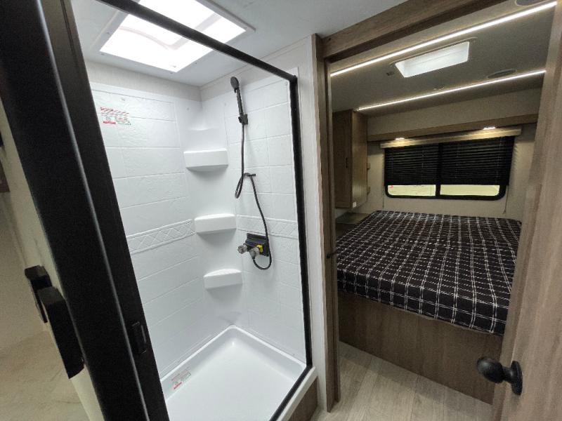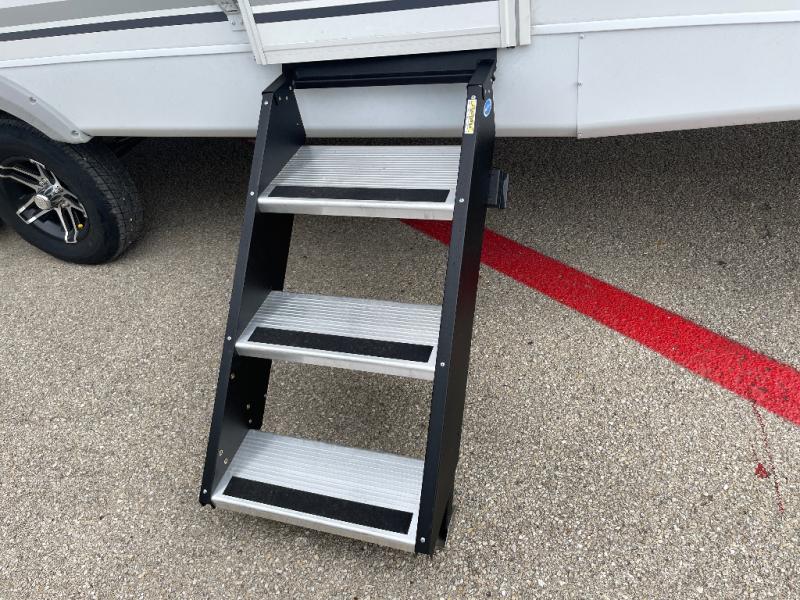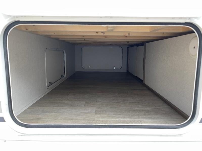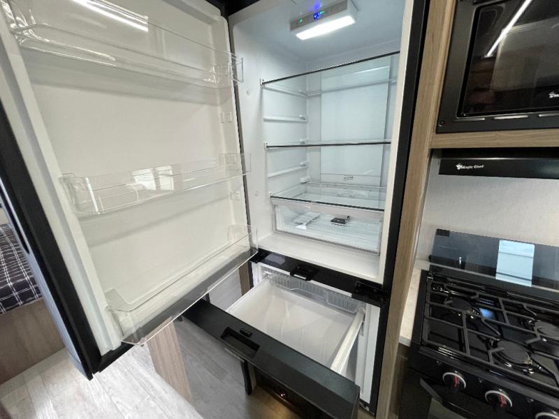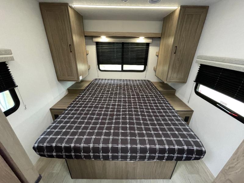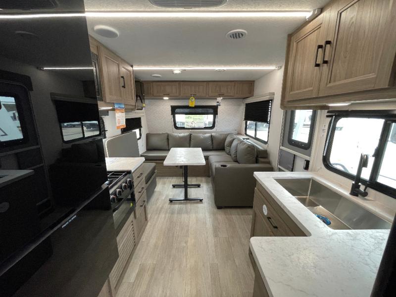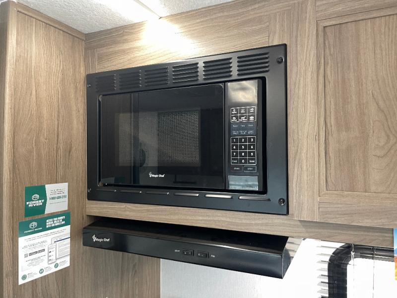 Step inside this travel trailer and be welcomed by a spacious front living area featuring a full-width sofa, complemented by a cozy dinette, ottoman, and an entertainment center—perfect for relaxing, dining, or planning your day. The central kitchen is fully equipped for the chef, boasting a 10 cubic ft refrigerator, Magic Chef gas cooktop, microwave, and ample overhead storage. Moving forward, a convenient pass-through full bathroom offers practicality on the go. At the rear, the bedroom features a comfortable 60" x 80" queen bed, flanked by wardrobes on each side and additional overhead storage to keep all your essentials neatly organized.
