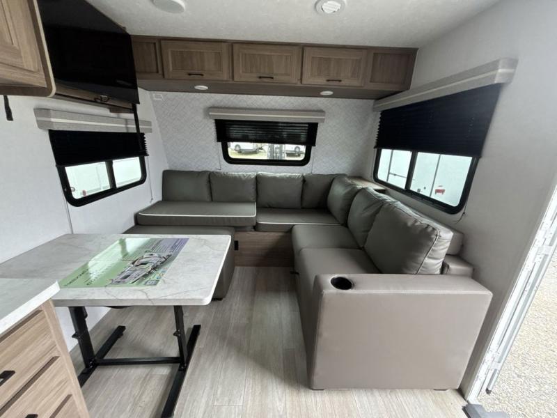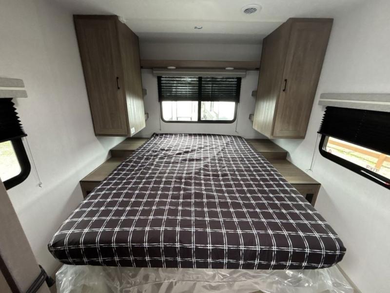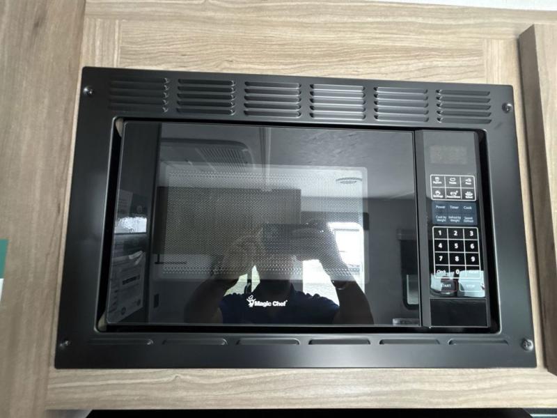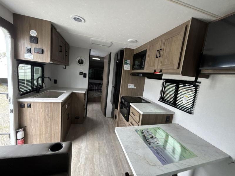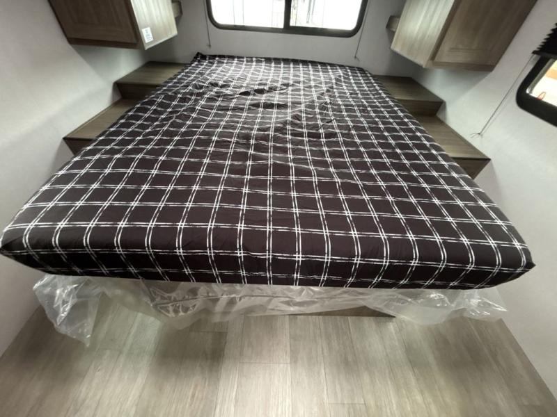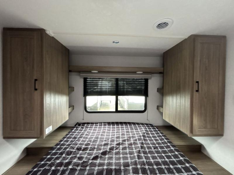 Step inside this travel trailer and be welcomed by a spacious front living area featuring a full-width sofa, complemented by a cozy dinette, ottoman, and an entertainment center—perfect for relaxing, dining, or planning your day. The central kitchen is fully equipped for the chef, boasting a 10 cubic ft refrigerator, Magic Chef gas cooktop, microwave, and ample overhead storage. Moving forward, a convenient pass-through full bathroom offers practicality on the go. At the rear, the bedroom features a comfortable 60" x 80" queen bed, flanked by wardrobes on each side and additional overhead storage to keep all your essentials neatly organized.
