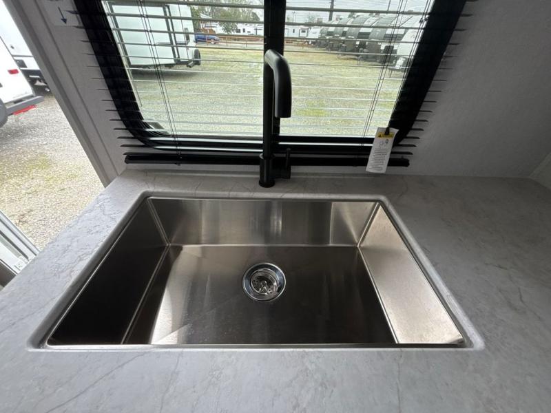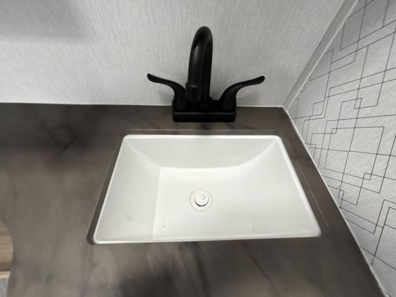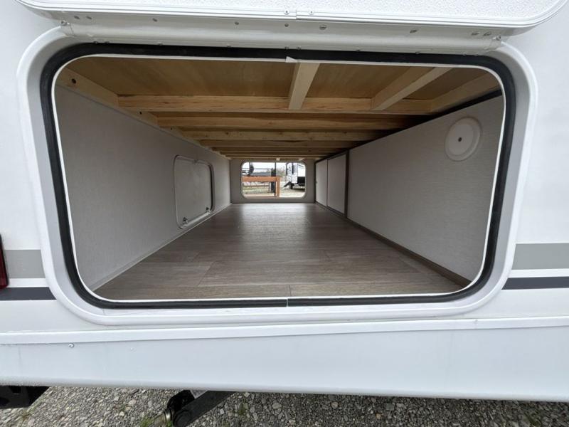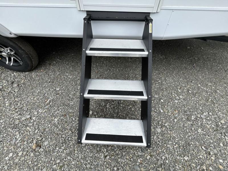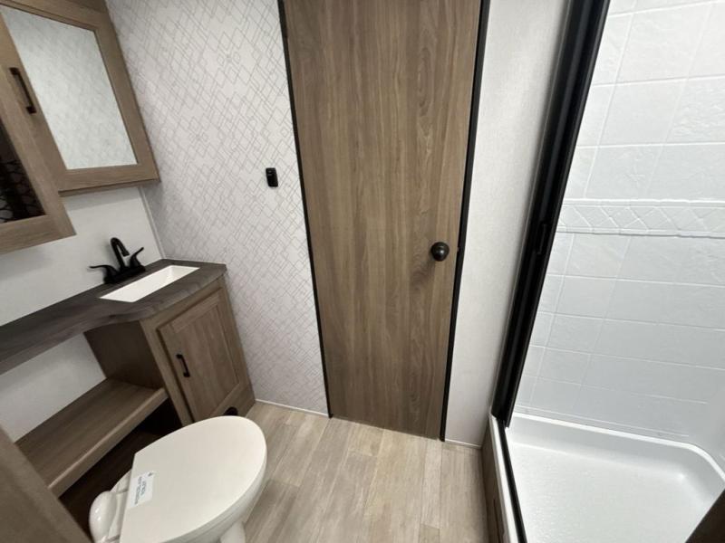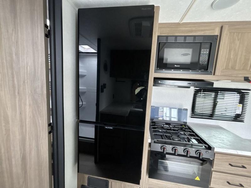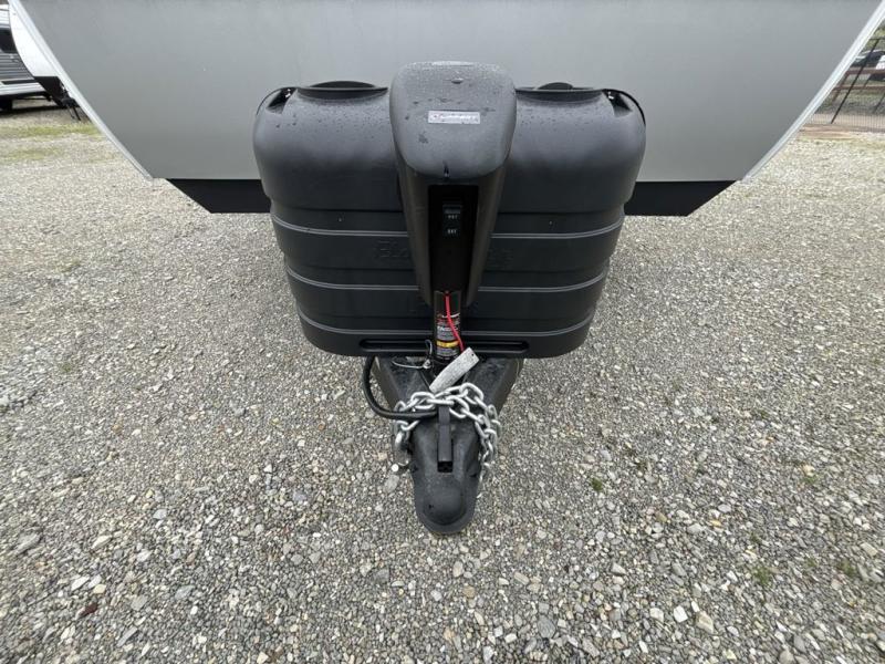 Step inside this travel trailer and be welcomed by a spacious front living area featuring a full-width sofa, complemented by a cozy dinette, ottoman, and an entertainment center—perfect for relaxing, dining, or planning your day. The central kitchen is fully equipped for the chef, boasting a 10 cubic ft refrigerator, Magic Chef gas cooktop, microwave, and ample overhead storage. Moving forward, a convenient pass-through full bathroom offers practicality on the go. At the rear, the bedroom features a comfortable 60" x 80" queen bed, flanked by wardrobes on each side and additional overhead storage to keep all your essentials neatly organized.