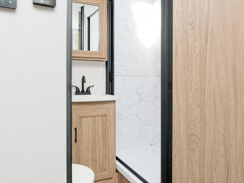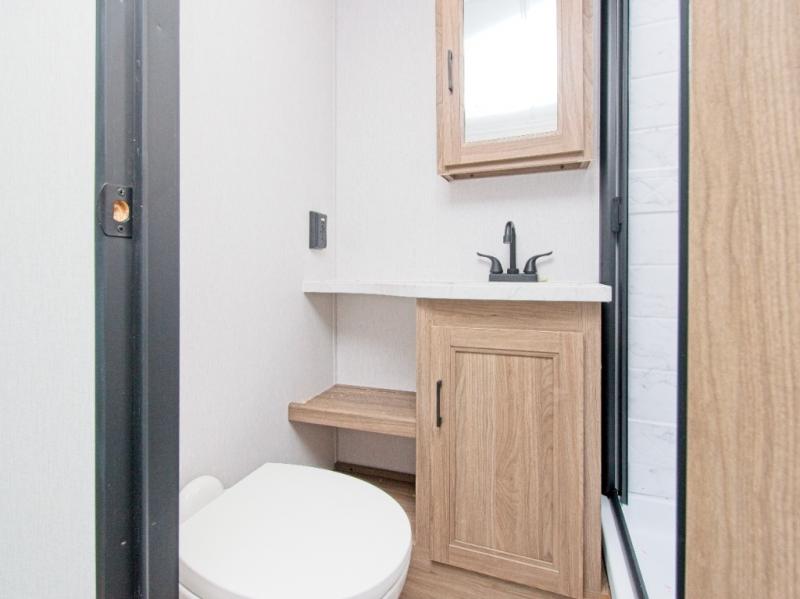 Includes a 30" x 36" shower, toilet, and sink—offering convenience and privacy wherever you camp. -