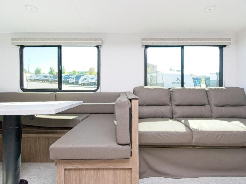 Enjoy meals, games, or relaxation around the large U-shaped dinette, which also converts into extra sleeping space. -