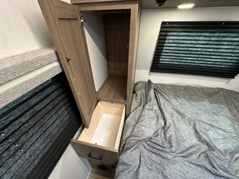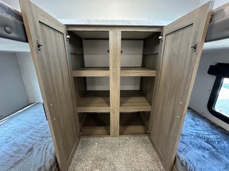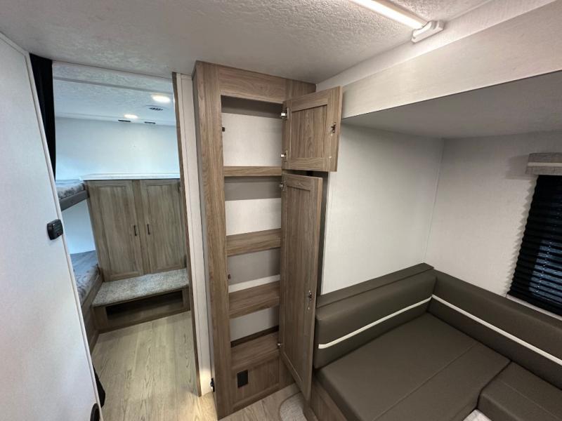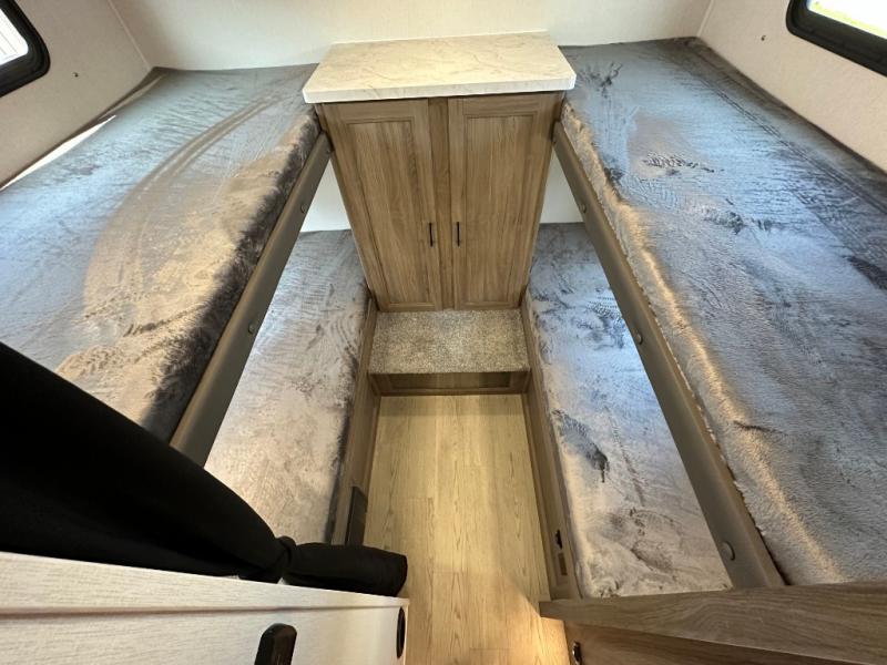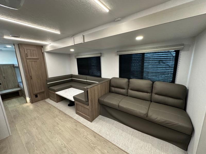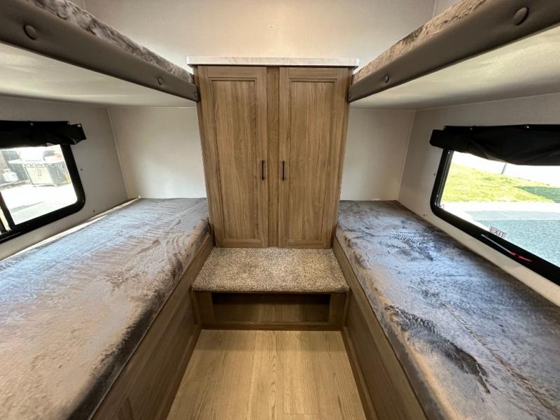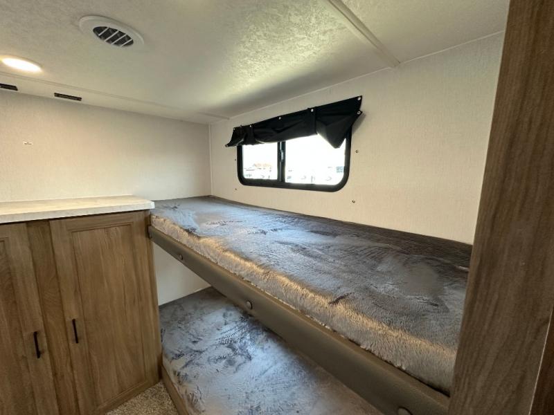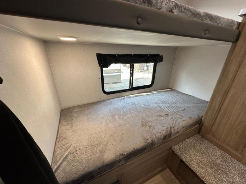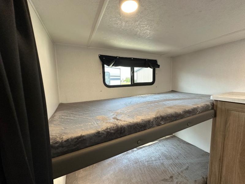 Whole-family fun is waiting for you in this spacious travel trailer. The kids or your guests will love the private bunkhouse with four bunks, plus a wardrobe with a countertop to keep their things. You will enjoy the front private bedroom with a walk-around queen bed and dual wardrobes, and if you have any other guests, they can sleep on the sofa or U-shaped dinette within the large slide out. The kitchen includes everything needed to prepare meals each day, including a microwave oven, a dual-burner cooktop, and a double door refrigerator. This model also includes a pass-through storage, plus additional exterior storage to bring along hiking gear, fishing poles, and camp chairs!