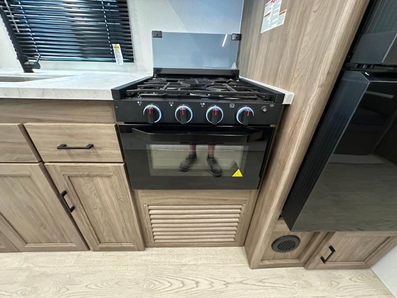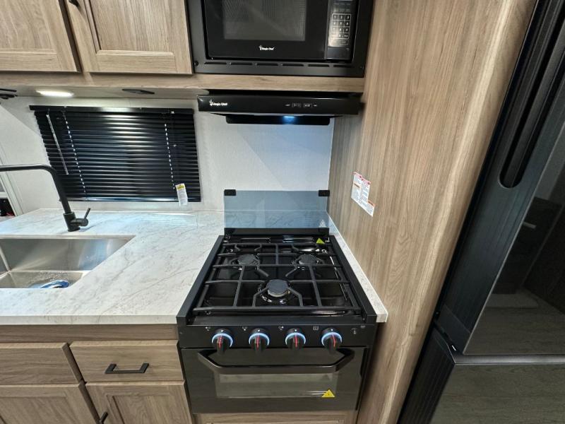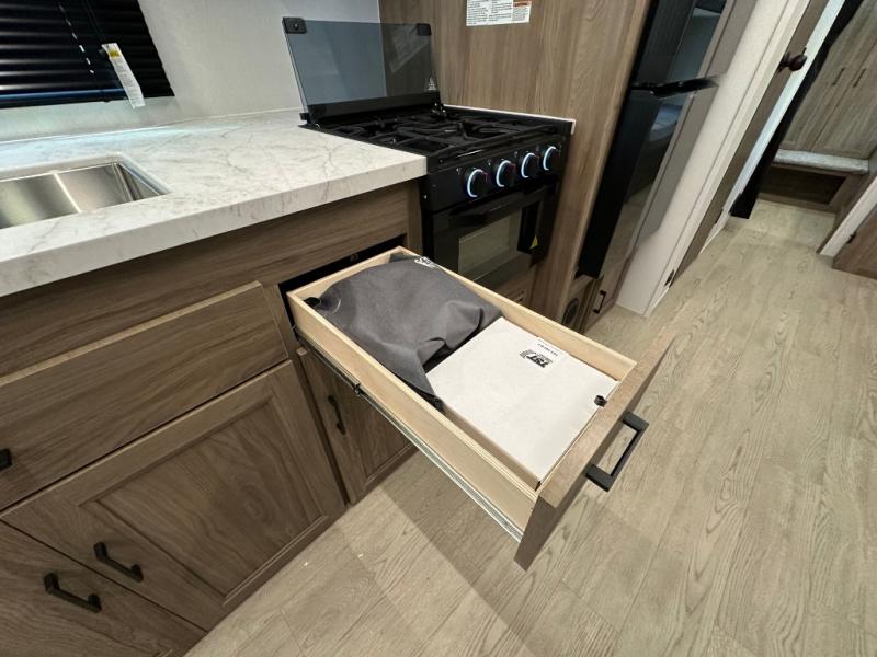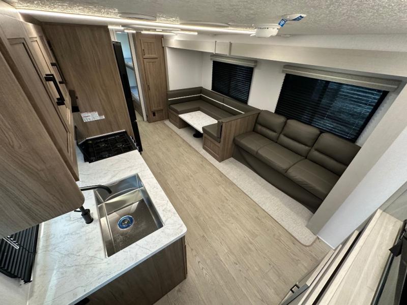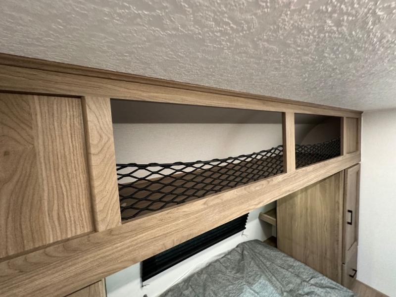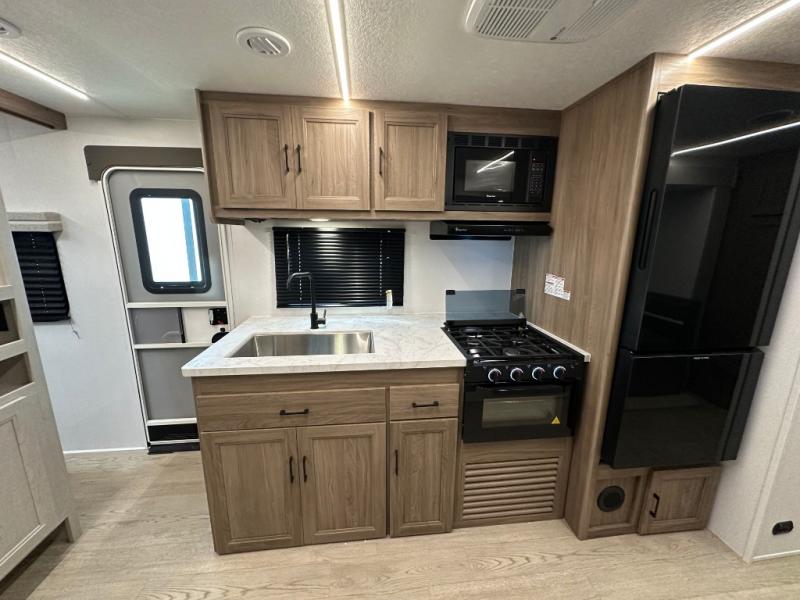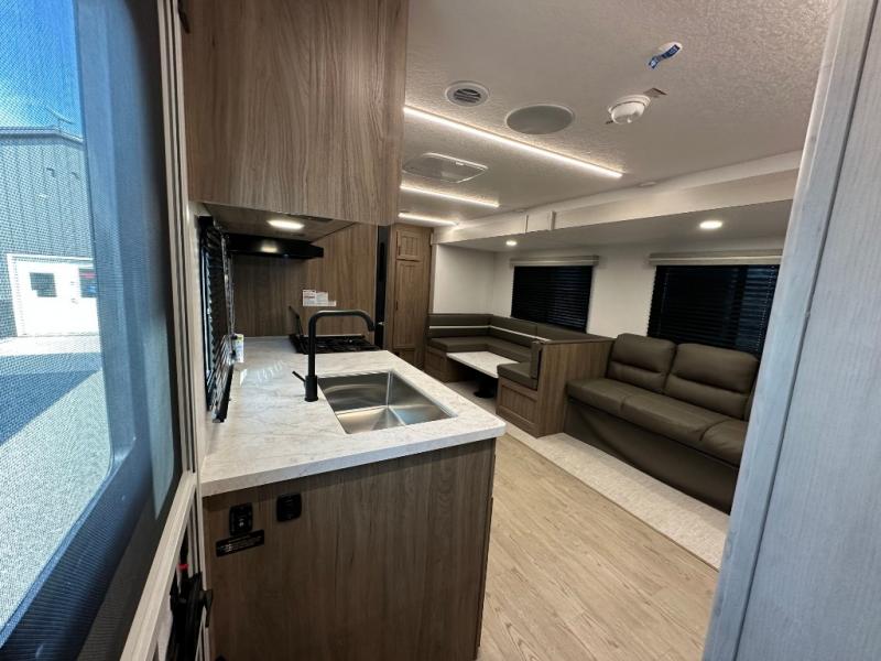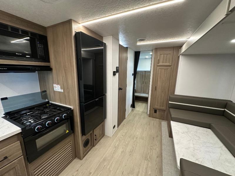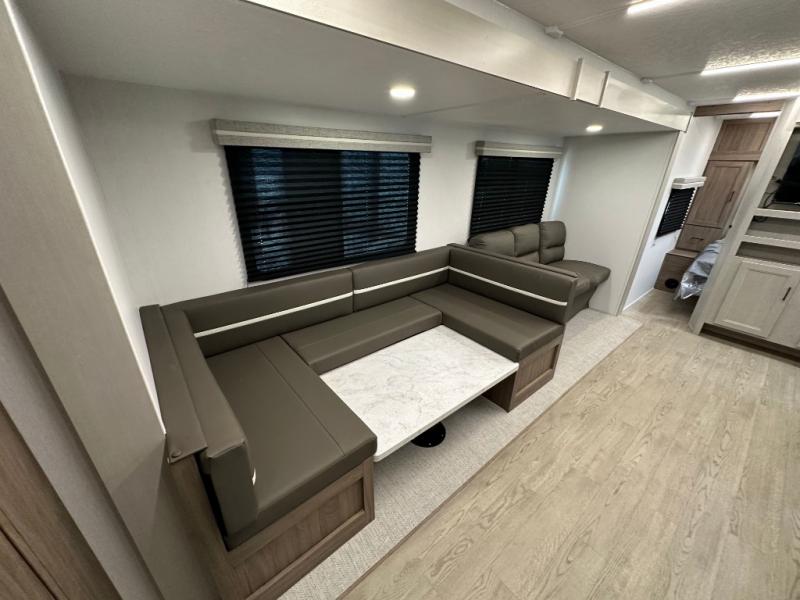 Whole-family fun is waiting for you in this spacious travel trailer. The kids or your guests will love the private bunkhouse with four bunks, plus a wardrobe with a countertop to keep their things. You will enjoy the front private bedroom with a walk-around queen bed and dual wardrobes, and if you have any other guests, they can sleep on the sofa or U-shaped dinette within the large slide out. The kitchen includes everything needed to prepare meals each day, including a microwave oven, a dual-burner cooktop, and a double door refrigerator. This model also includes a pass-through storage, plus additional exterior storage to bring along hiking gear, fishing poles, and camp chairs!