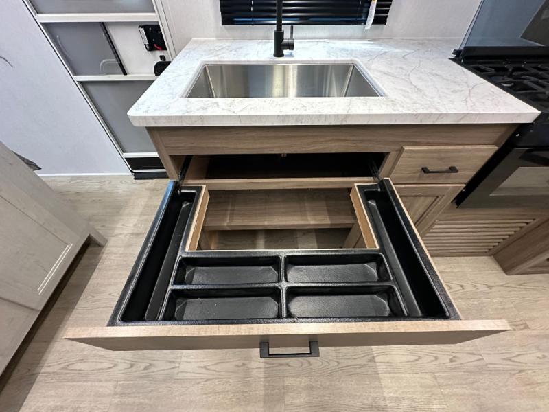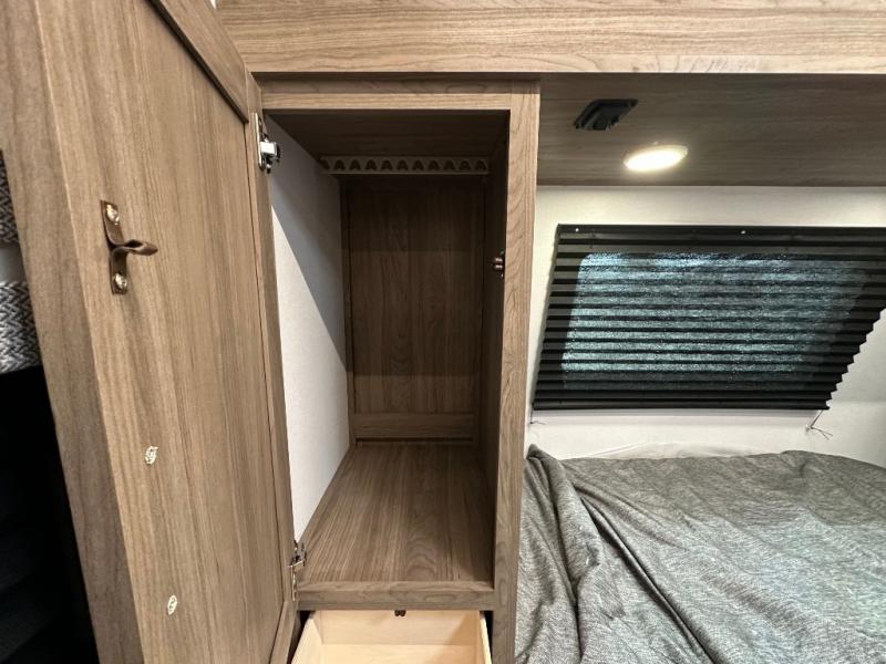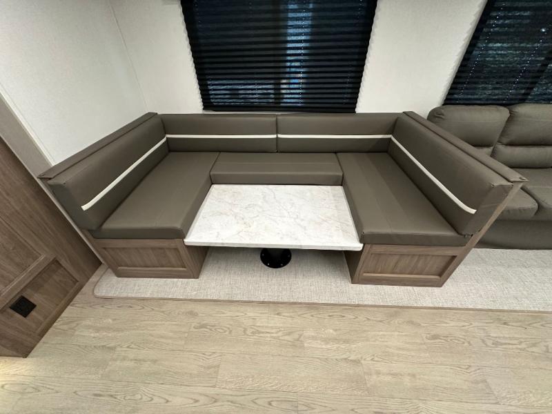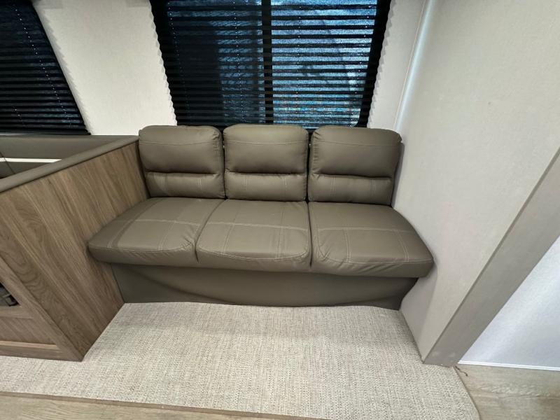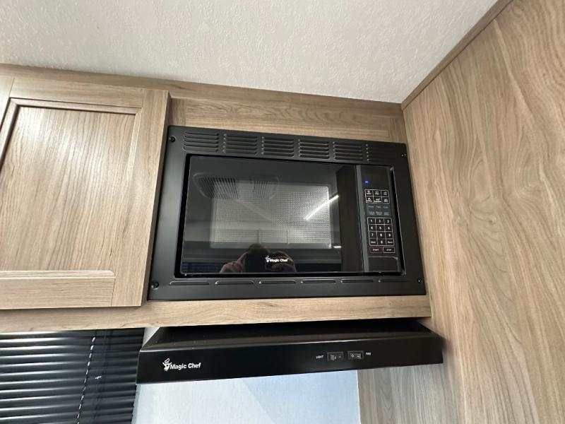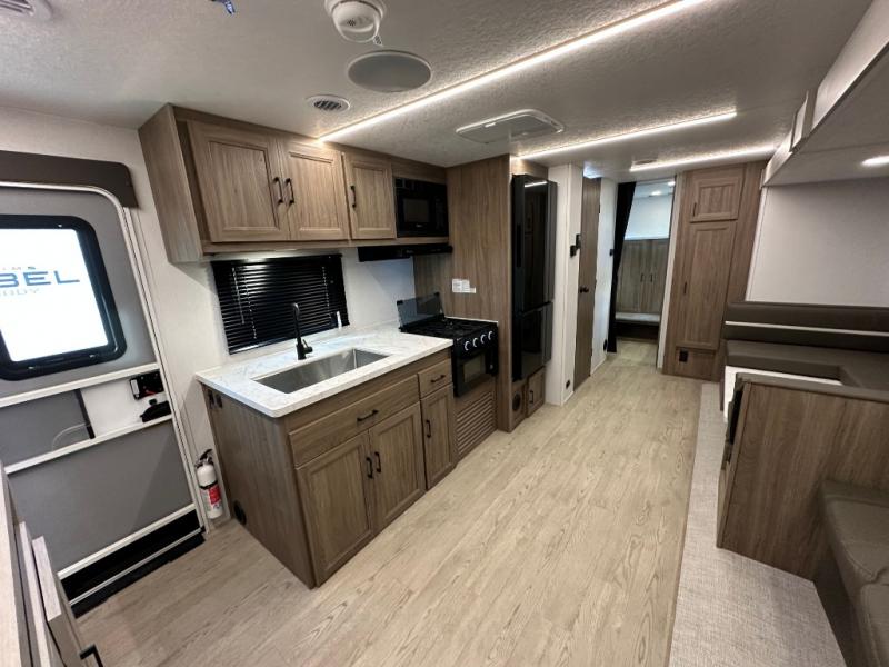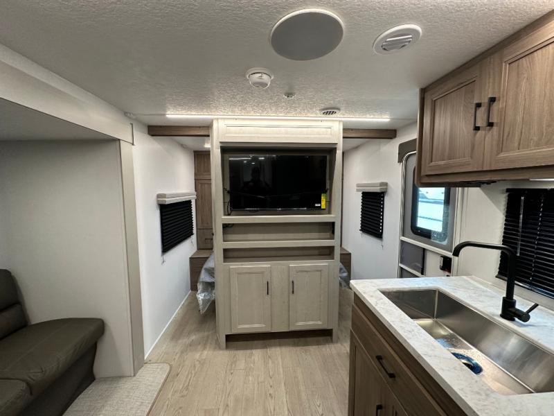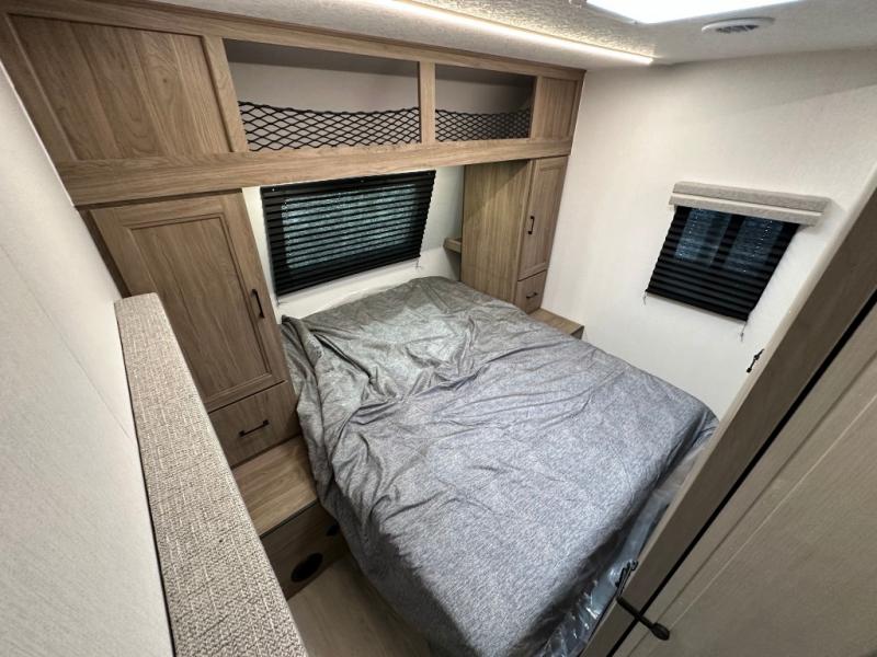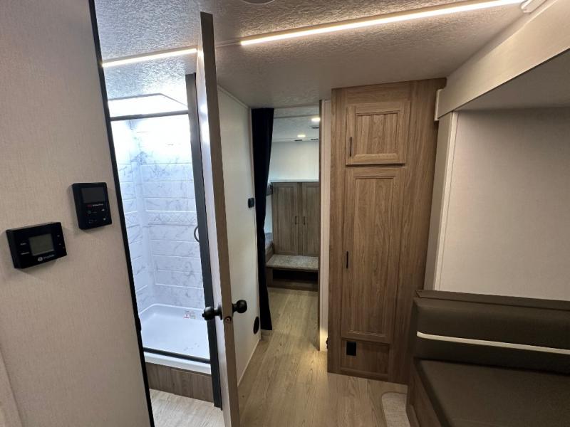 Whole-family fun is waiting for you in this spacious travel trailer. The kids or your guests will love the private bunkhouse with four bunks, plus a wardrobe with a countertop to keep their things. You will enjoy the front private bedroom with a walk-around queen bed and dual wardrobes, and if you have any other guests, they can sleep on the sofa or U-shaped dinette within the large slide out. The kitchen includes everything needed to prepare meals each day, including a microwave oven, a dual-burner cooktop, and a double door refrigerator. This model also includes a pass-through storage, plus additional exterior storage to bring along hiking gear, fishing poles, and camp chairs!