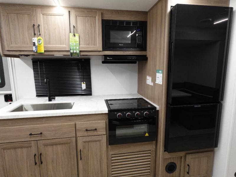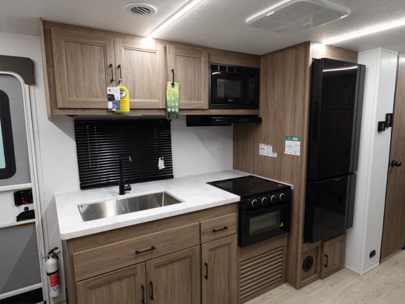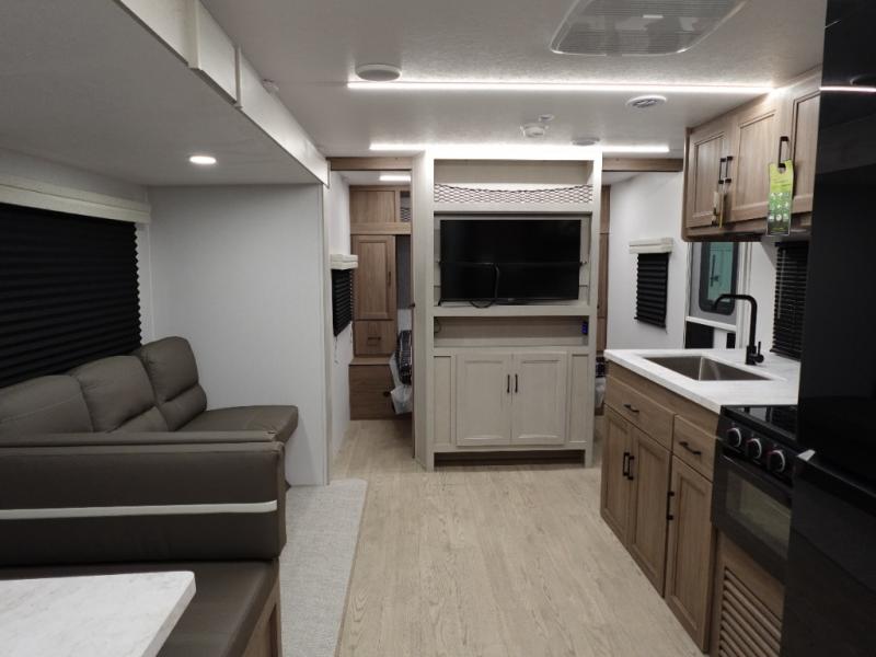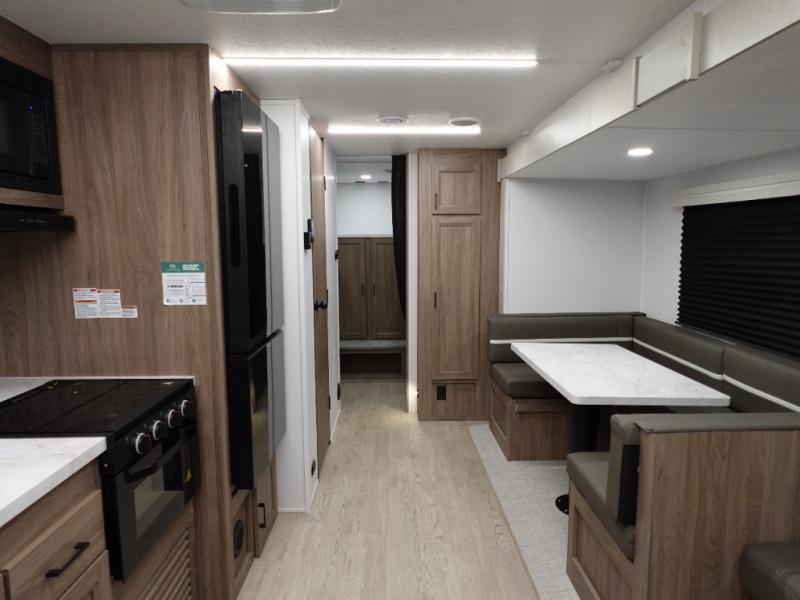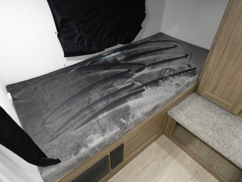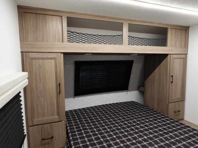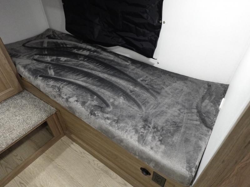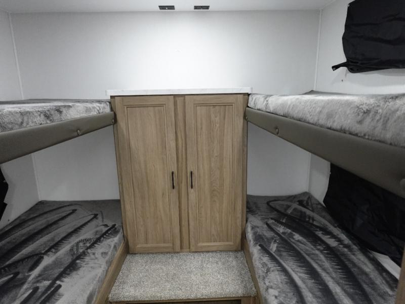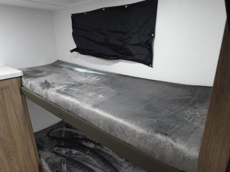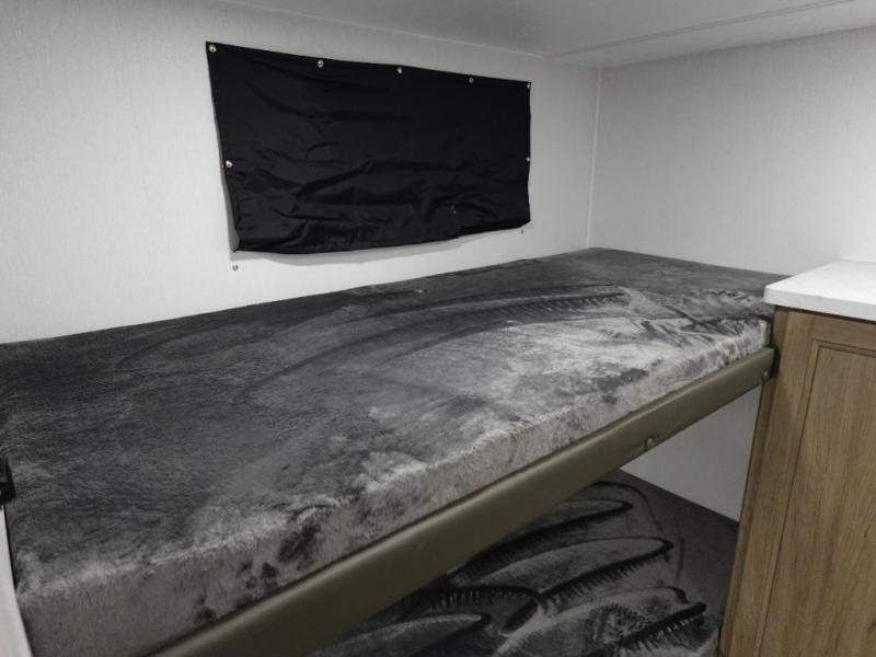 Whole-family fun is waiting for you in this spacious travel trailer. The kids or your guests will love the private bunkhouse with four bunks, plus a wardrobe with a countertop to keep their things. You will enjoy the front private bedroom with a walk-around queen bed and dual wardrobes, and if you have any other guests, they can sleep on the sofa or U-shaped dinette within the large slide out. The kitchen includes everything needed to prepare meals each day, including a microwave, a dual-burner cooktop, and a double door refrigerator. This model also includes a pass-through storage, plus additional exterior storage to bring along hiking gear, fishing poles, and camp chairs!