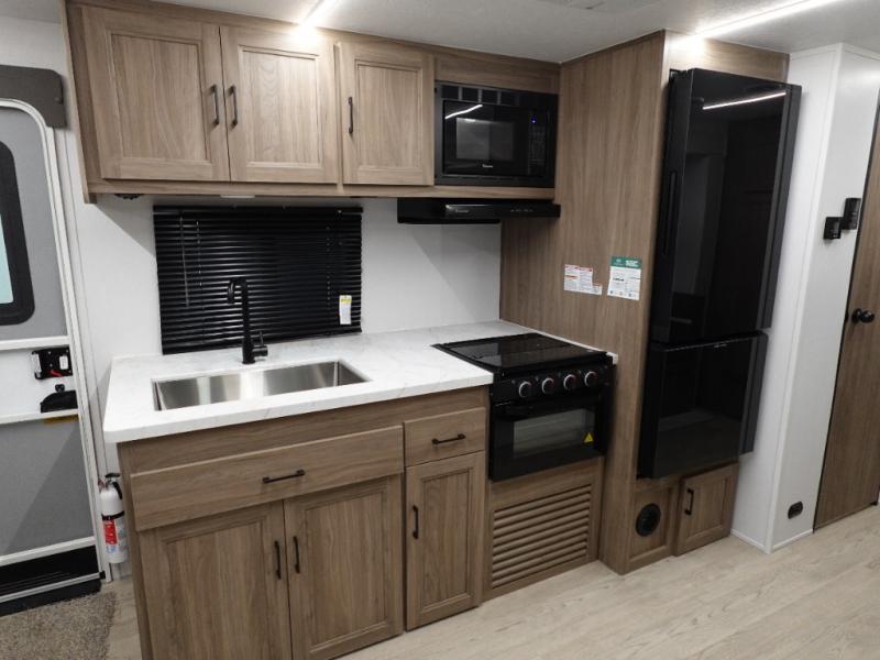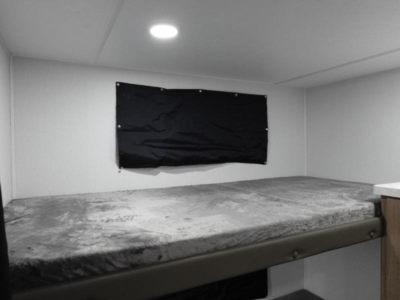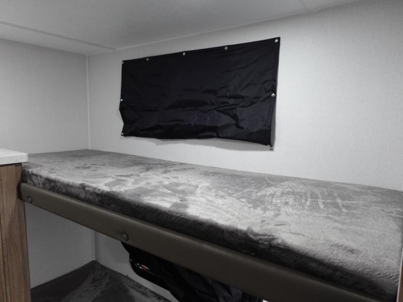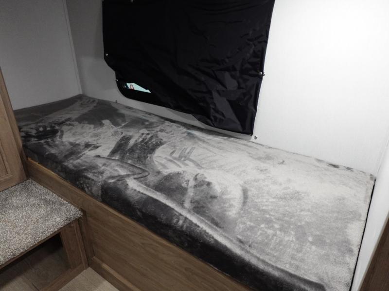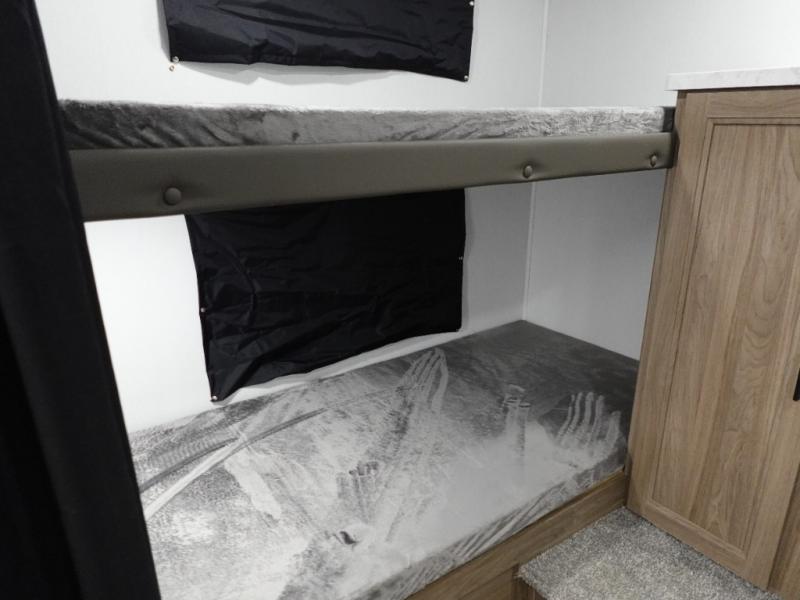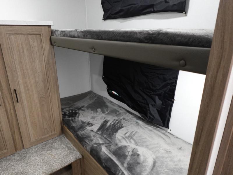 Whole-family fun is waiting for you in this spacious travel trailer. The kids or your guests will love the private bunkhouse with four bunks, plus a wardrobe with a countertop to keep their things. You will enjoy the front private bedroom with a walk-around queen bed and dual wardrobes, and if you have any other guests, they can sleep on the sofa or U-shaped dinette within the large slide out. The kitchen includes everything needed to prepare meals each day, including a microwave, a dual-burner cooktop, and a double door refrigerator. This model also includes a pass-through storage, plus additional exterior storage to bring along hiking gear, fishing poles, and camp chairs!