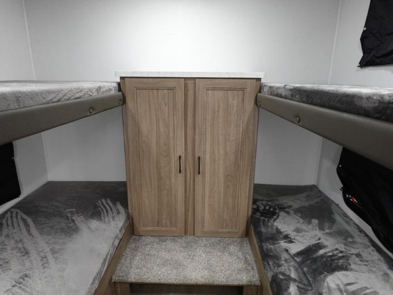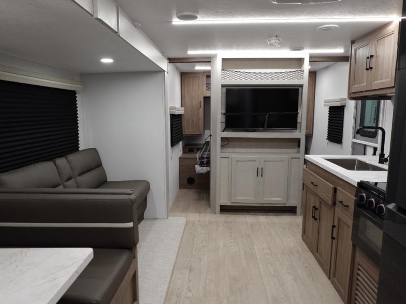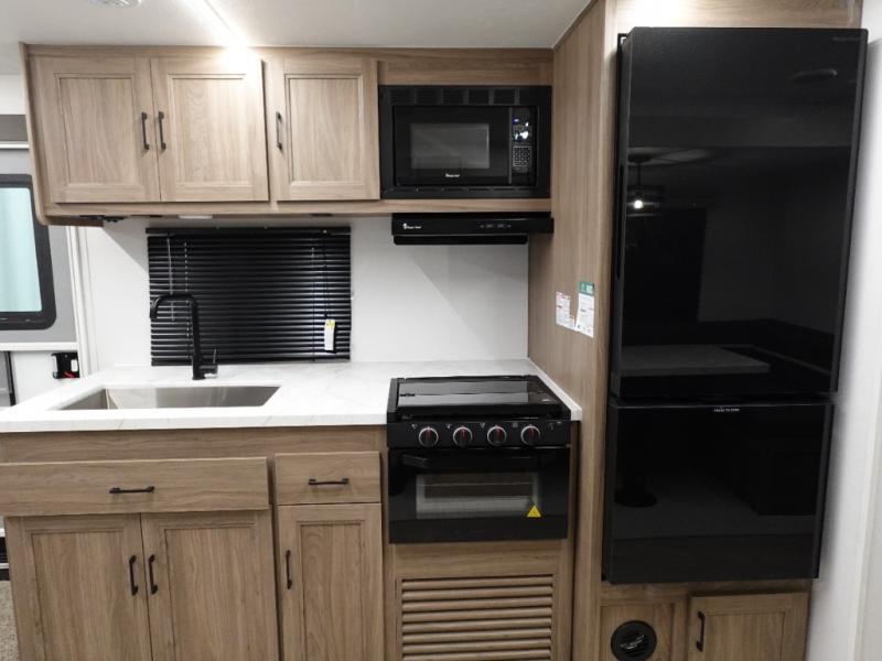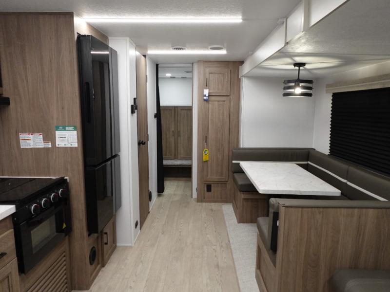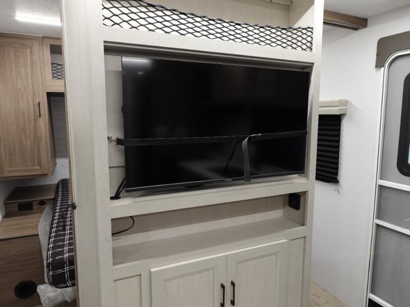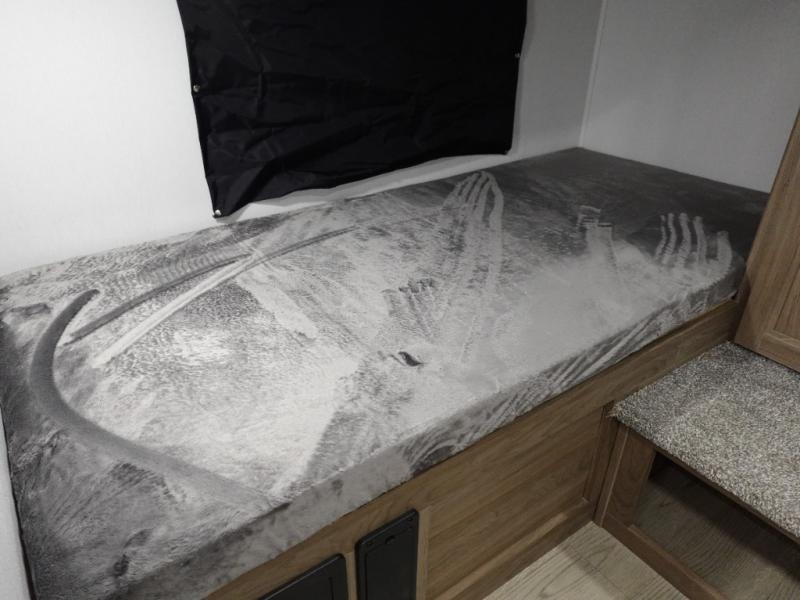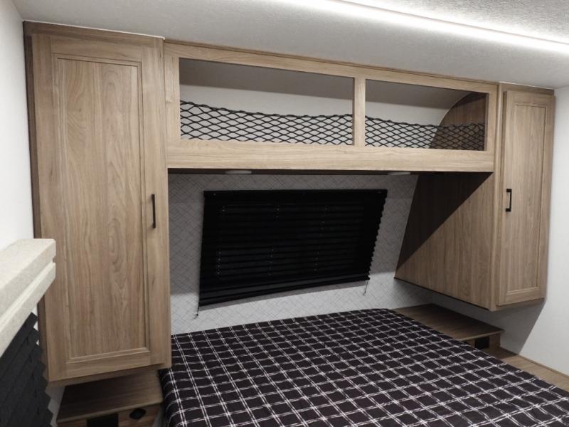 Whole-family fun is waiting for you in this spacious travel trailer. The kids or your guests will love the private bunkhouse with four bunks, plus a wardrobe with a countertop to keep their things. You will enjoy the front private bedroom with a walk-around queen bed and dual wardrobes, and if you have any other guests, they can sleep on the sofa or U-shaped dinette within the large slide out. The kitchen includes everything needed to prepare meals each day, including a microwave, a dual-burner cooktop, and a double door refrigerator. This model also includes a pass-through storage, plus additional exterior storage to bring along hiking gear, fishing poles, and camp chairs!