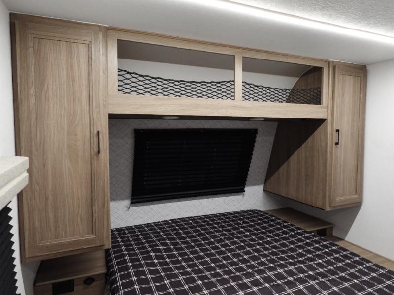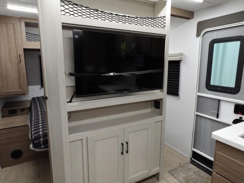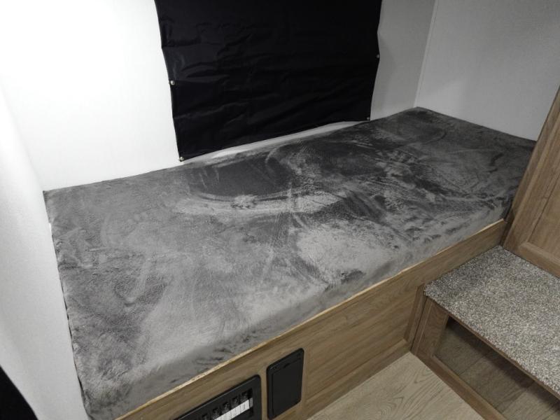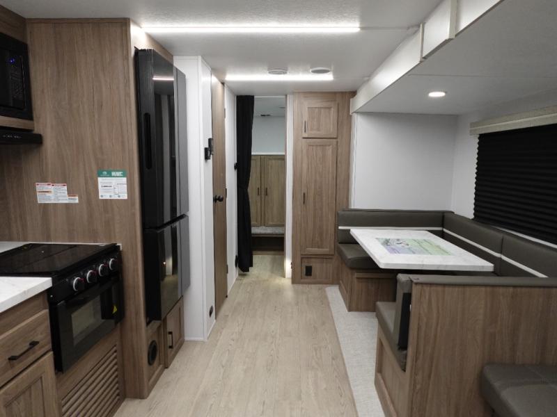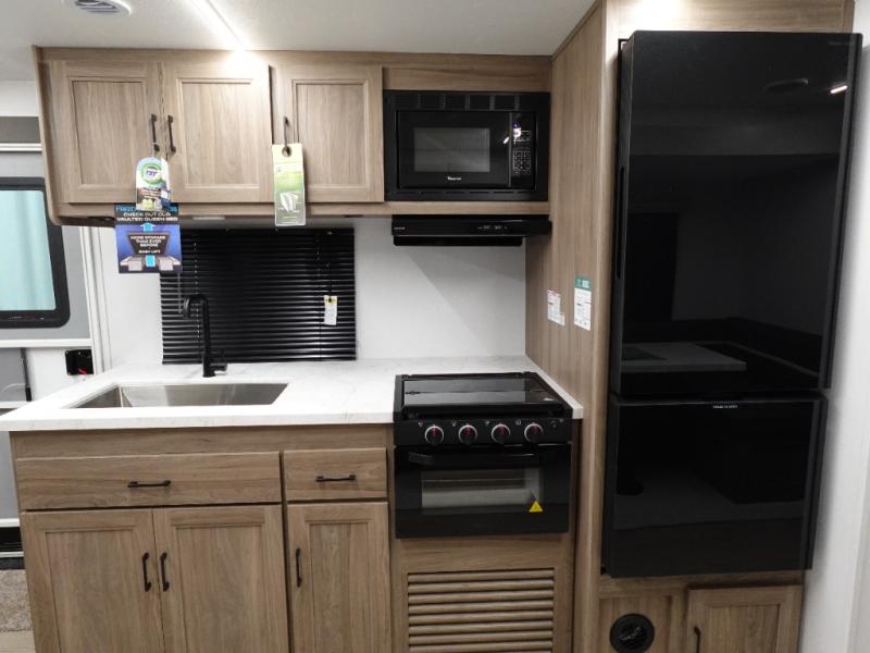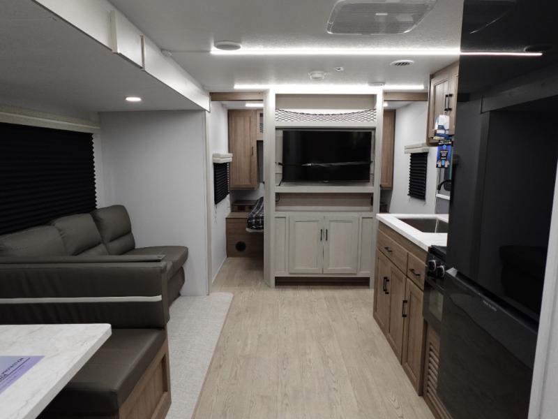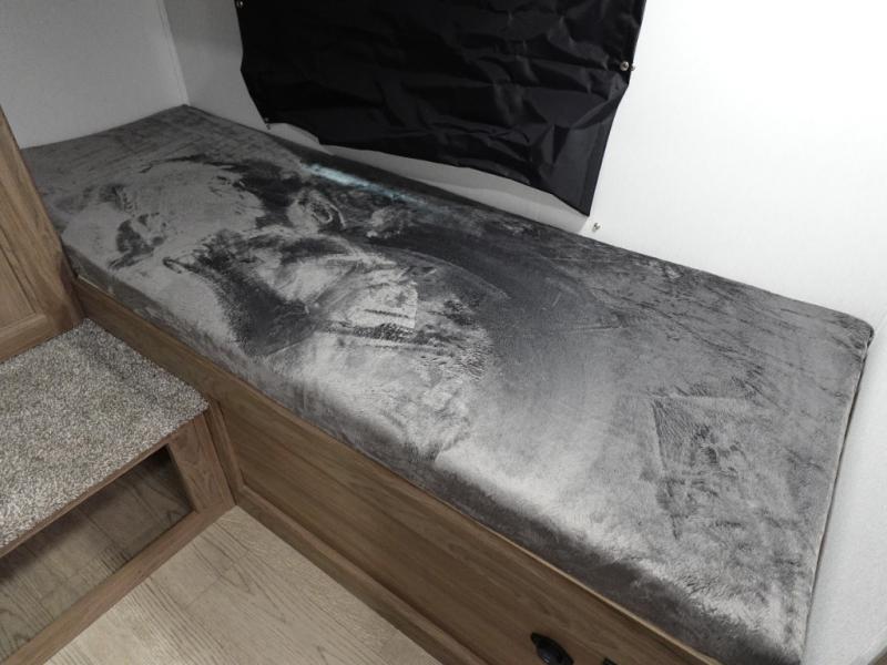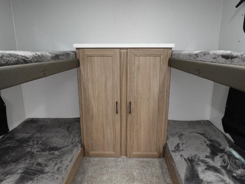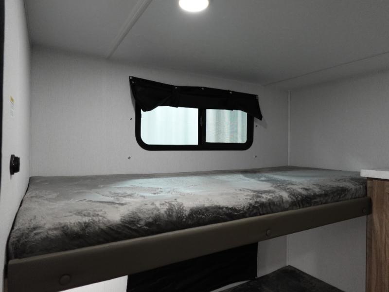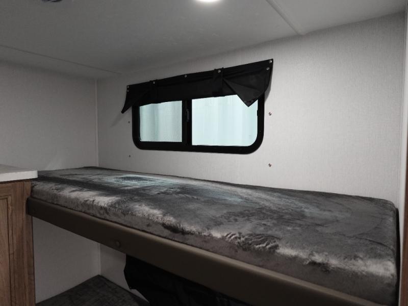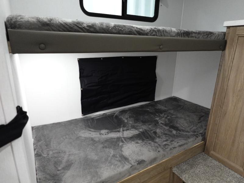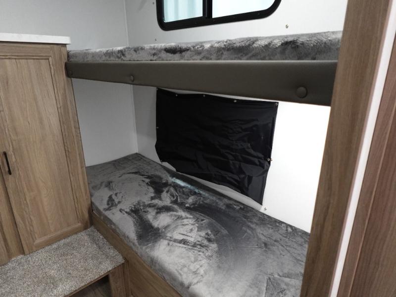 Whole-family fun is waiting for you in this spacious travel trailer. The kids or your guests will love the private bunkhouse with four bunks, plus a wardrobe with a countertop to keep their things. You will enjoy the front private bedroom with a walk-around queen bed and dual wardrobes, and if you have any other guests, they can sleep on the sofa or U-shaped dinette within the large slide out. The kitchen includes everything needed to prepare meals each day, including a microwave, a dual-burner cooktop, and a double door refrigerator. This model also includes a pass-through storage, plus additional exterior storage to bring along hiking gear, fishing poles, and camp chairs!