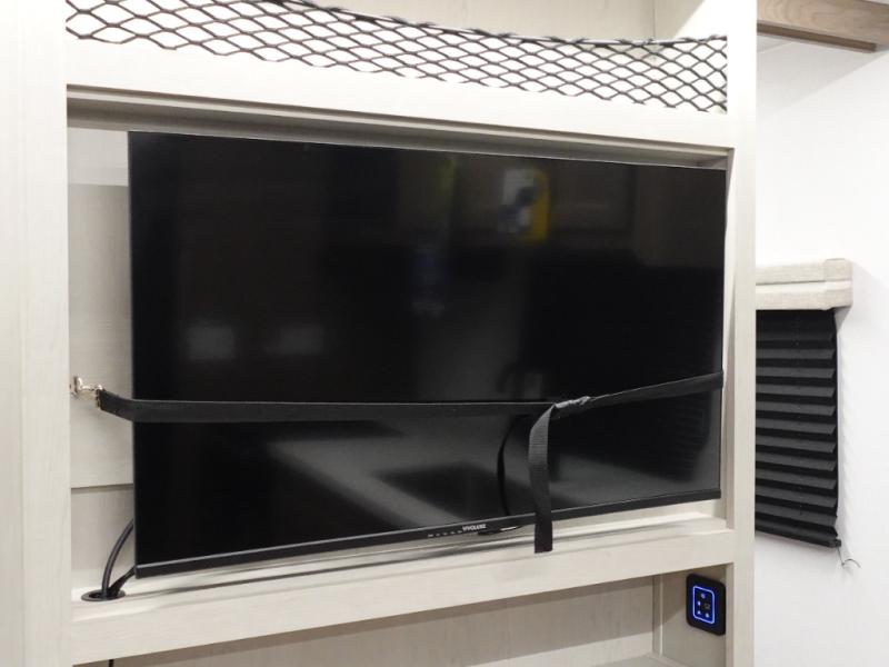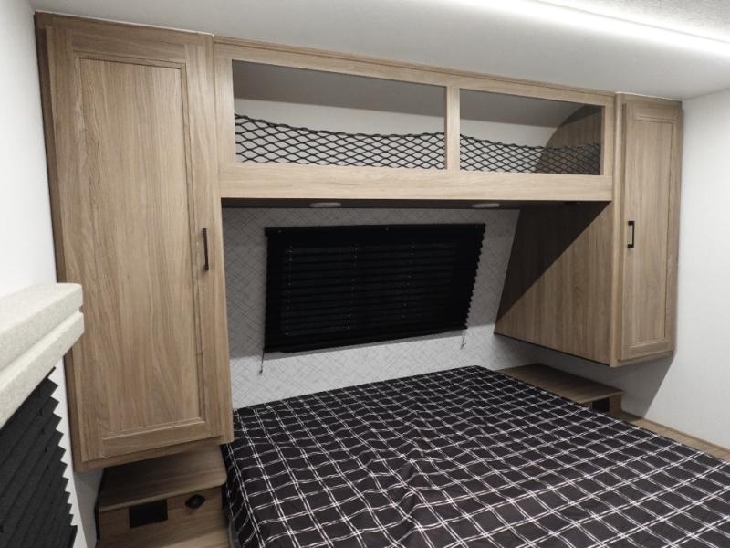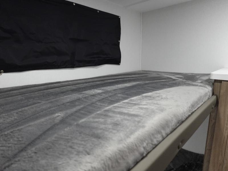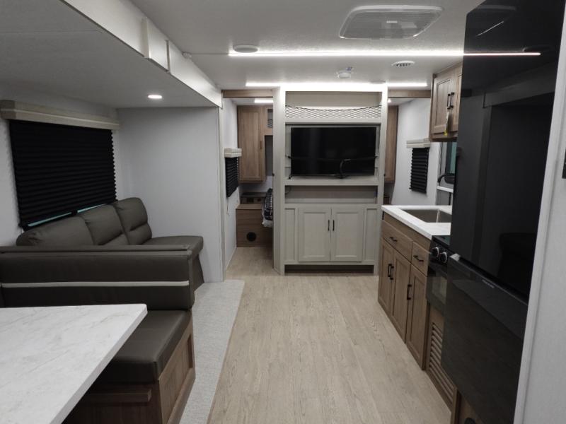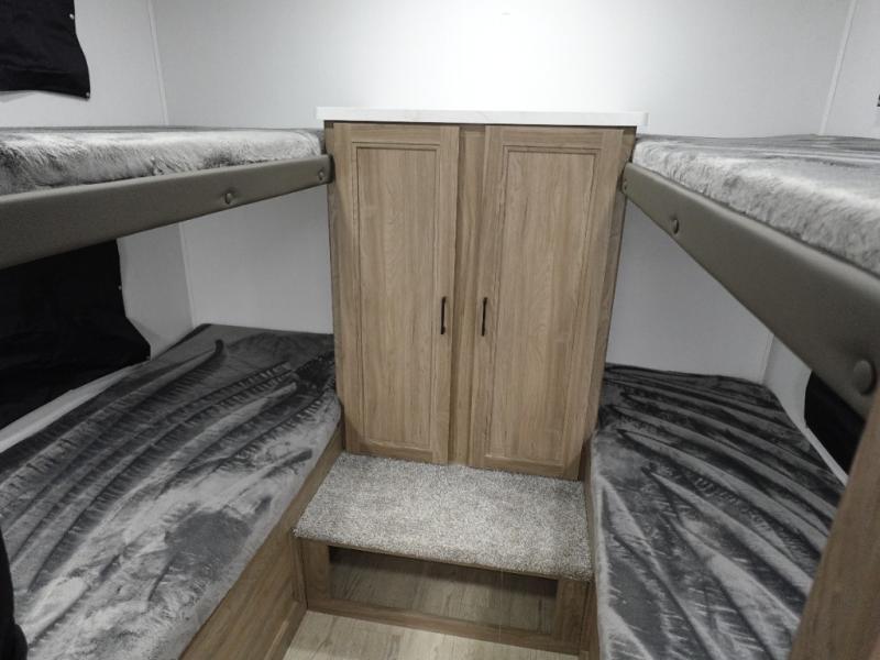 Whole-family fun is waiting for you in this spacious travel trailer. The kids or your guests will love the private bunkhouse with four bunks, plus a wardrobe with a countertop to keep their things. You will enjoy the front private bedroom with a walk-around queen bed and dual wardrobes, and if you have any other guests, they can sleep on the sofa or U-shaped dinette within the large slide out. The kitchen includes everything needed to prepare meals each day, including a microwave, a dual-burner cooktop, and a double door refrigerator. This model also includes a pass-through storage, plus additional exterior storage to bring along hiking gear, fishing poles, and camp chairs!