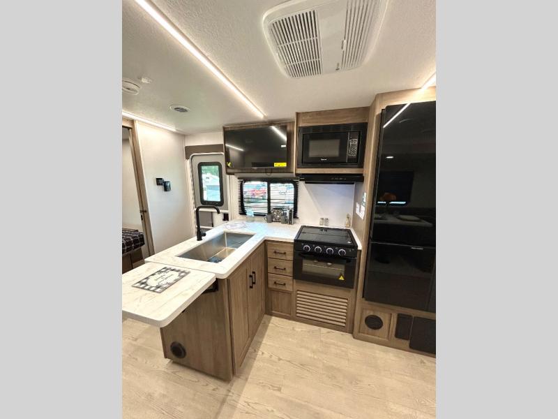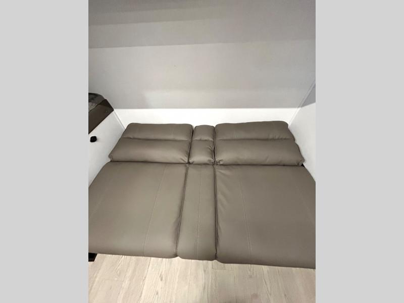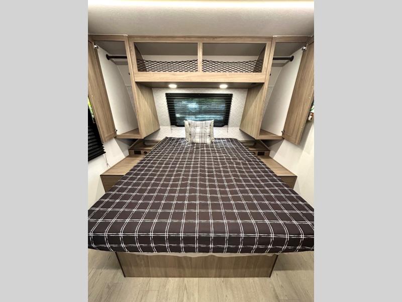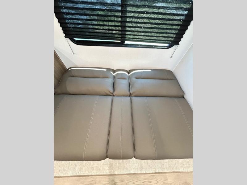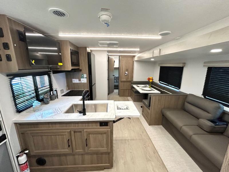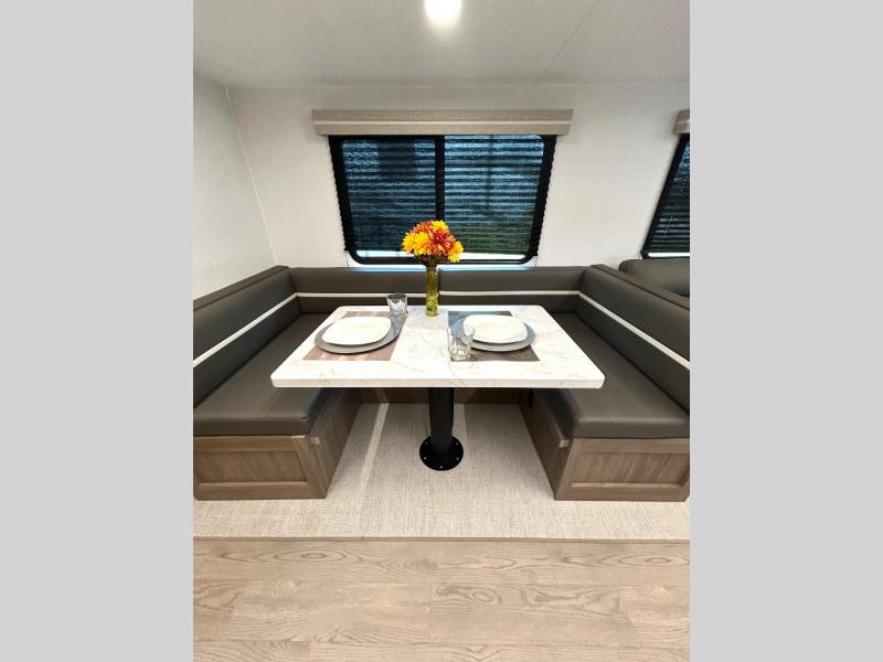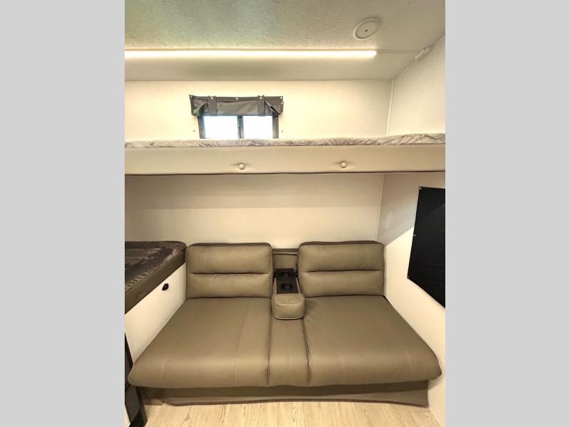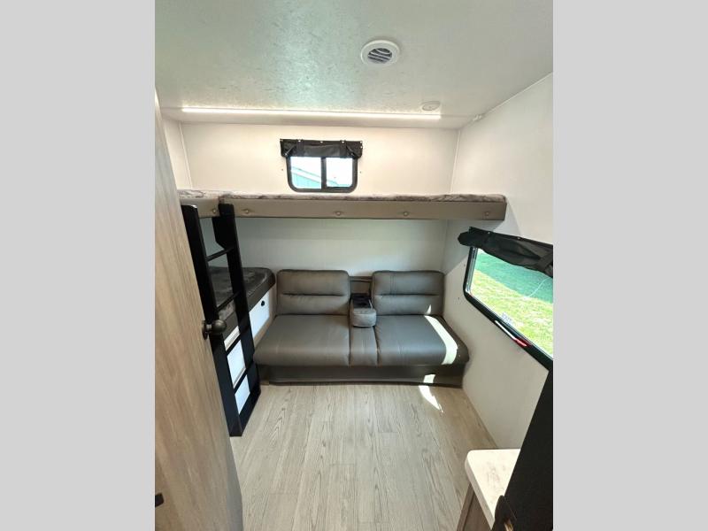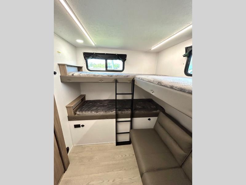 As you step into this trailer, you'll find the main bedroom at the front, featuring a spacious 60" x 80" queen bed with a wardrobe on each side for your clothes and essentials. At the center, the living area offers a large slide-out that holds a roomy U-shaped dinette perfect for meals or game nights beside it a comfortable sofa for extra seating. Opposite the slide, the L-shaped kitchen comes fully equipped with a 10-cu. ft. refrigerator, Magic Chef microwave and gas cooktop, plus a flip-up countertop for added prep space. Toward the rear, a full bathroom includes a large shower and generous counter space, and at the very back, the bunkhouse provides sleeping room for up to five, features a double bunk, bunk above sofa and trundle mat, making it easy to bring the whole crew along for the adventure.