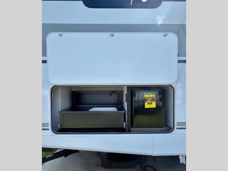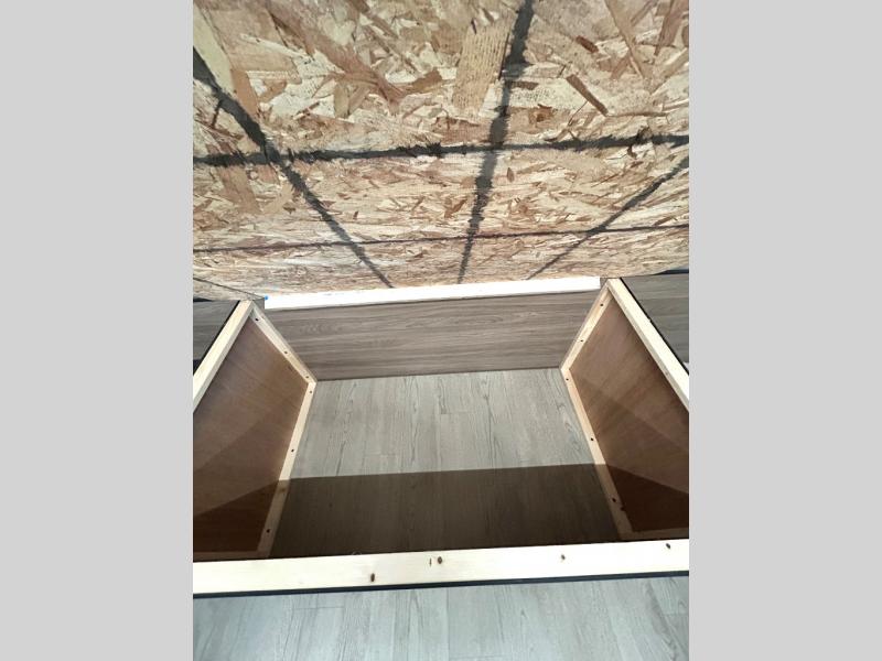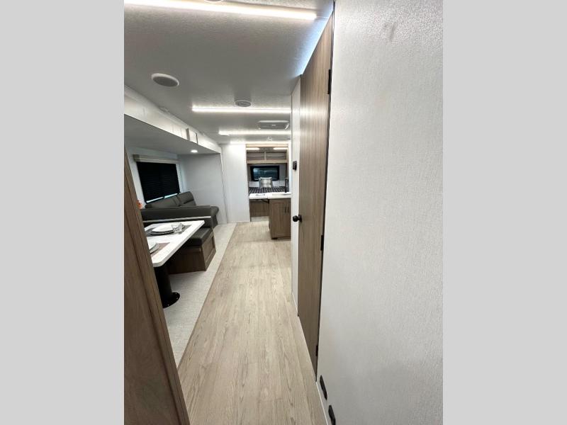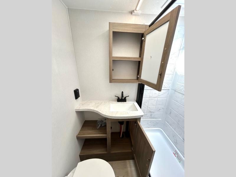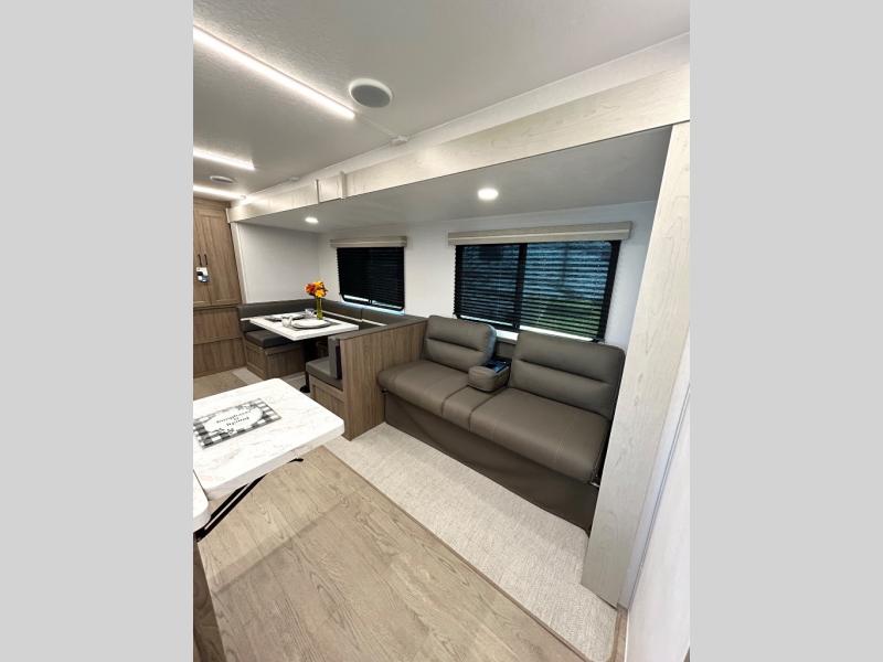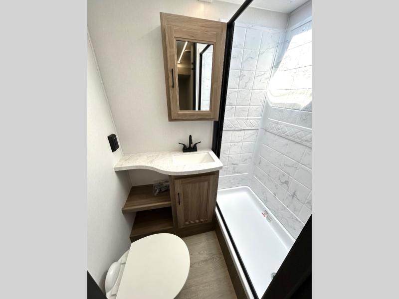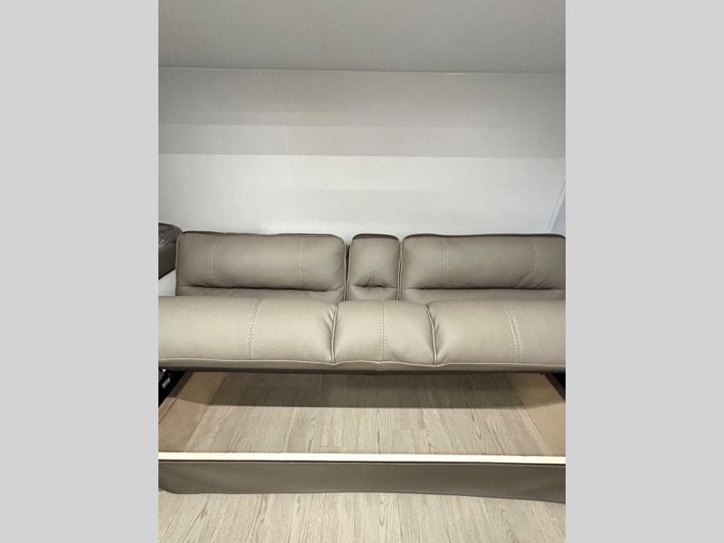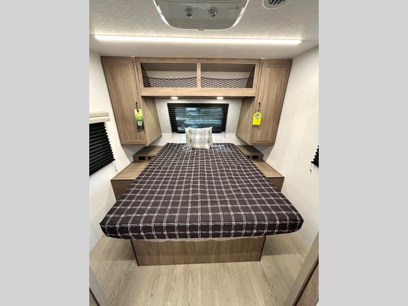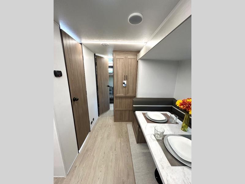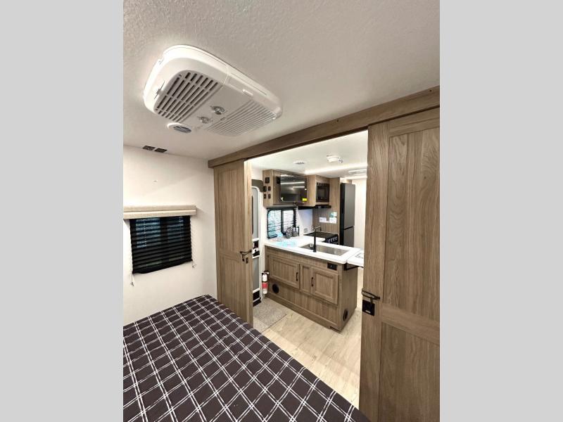 As you step into this trailer, you'll find the main bedroom at the front, featuring a spacious 60" x 80" queen bed with a wardrobe on each side for your clothes and essentials. At the center, the living area offers a large slide-out that holds a roomy U-shaped dinette perfect for meals or game nights beside it a comfortable sofa for extra seating. Opposite the slide, the L-shaped kitchen comes fully equipped with a 10-cu. ft. refrigerator, Magic Chef microwave and gas cooktop, plus a flip-up countertop for added prep space. Toward the rear, a full bathroom includes a large shower and generous counter space, and at the very back, the bunkhouse provides sleeping room for up to five, features a double bunk, bunk above sofa and trundle mat, making it easy to bring the whole crew along for the adventure.