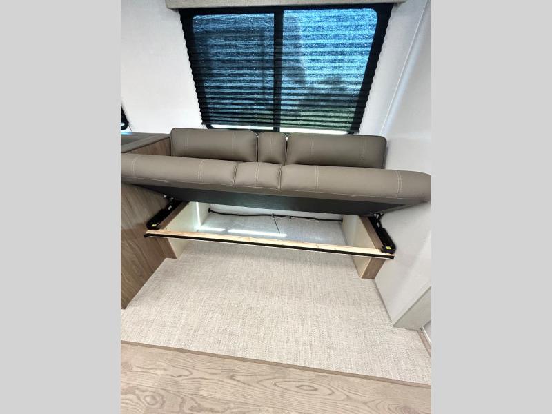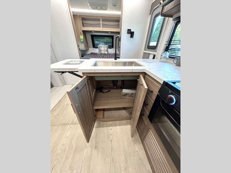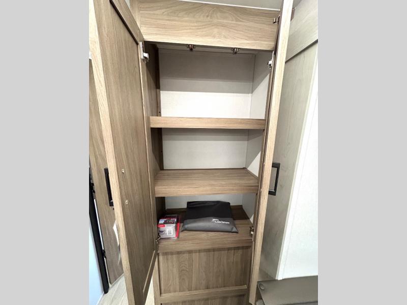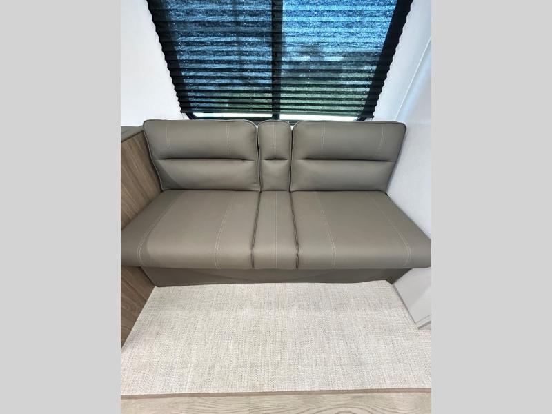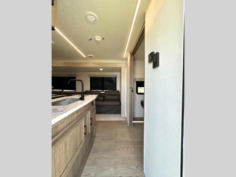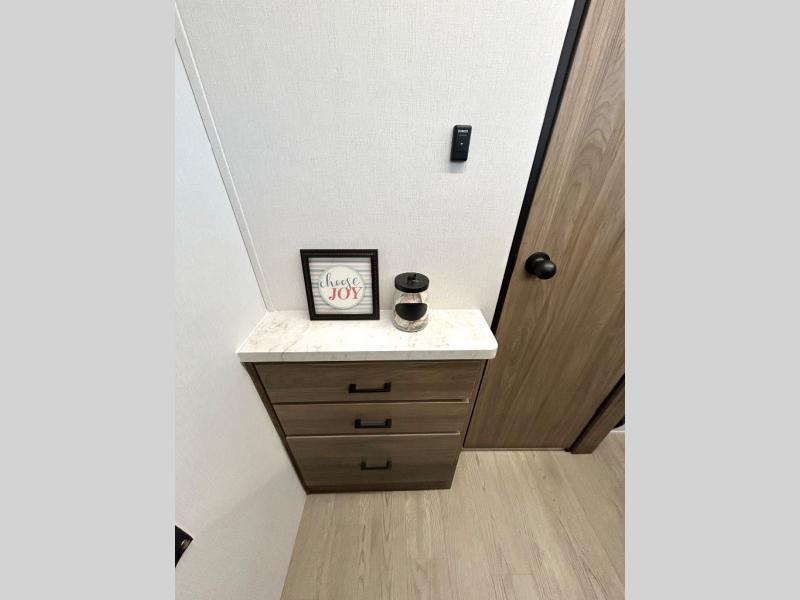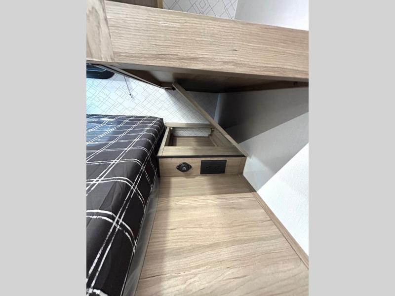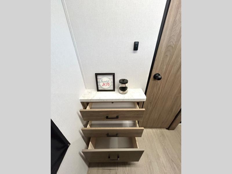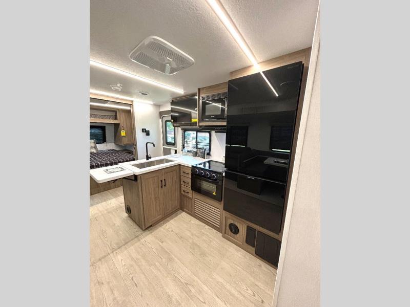 As you step into this trailer, you'll find the main bedroom at the front, featuring a spacious 60" x 80" queen bed with a wardrobe on each side for your clothes and essentials. At the center, the living area offers a large slide-out that holds a roomy U-shaped dinette perfect for meals or game nights beside it a comfortable sofa for extra seating. Opposite the slide, the L-shaped kitchen comes fully equipped with a 10-cu. ft. refrigerator, Magic Chef microwave and gas cooktop, plus a flip-up countertop for added prep space. Toward the rear, a full bathroom includes a large shower and generous counter space, and at the very back, the bunkhouse provides sleeping room for up to five, features a double bunk, bunk above sofa and trundle mat, making it easy to bring the whole crew along for the adventure.