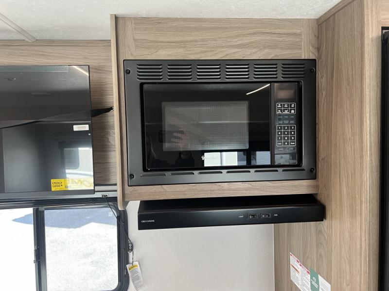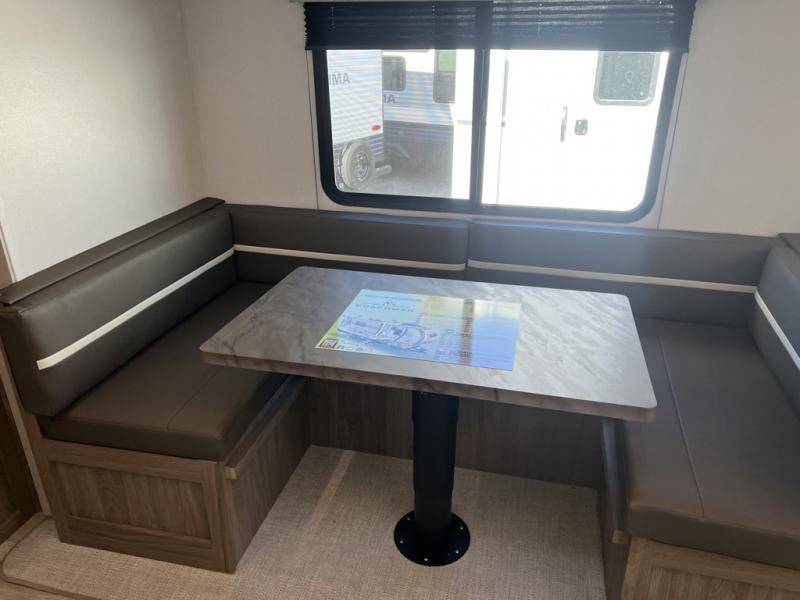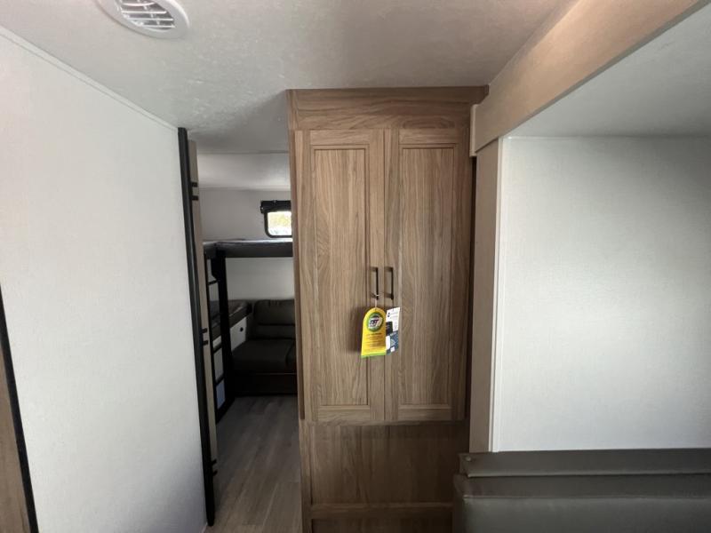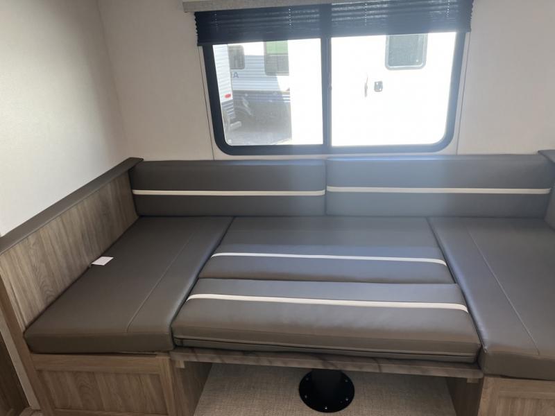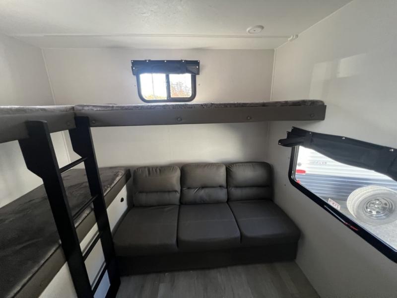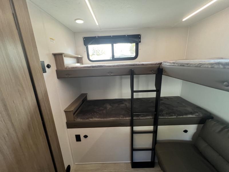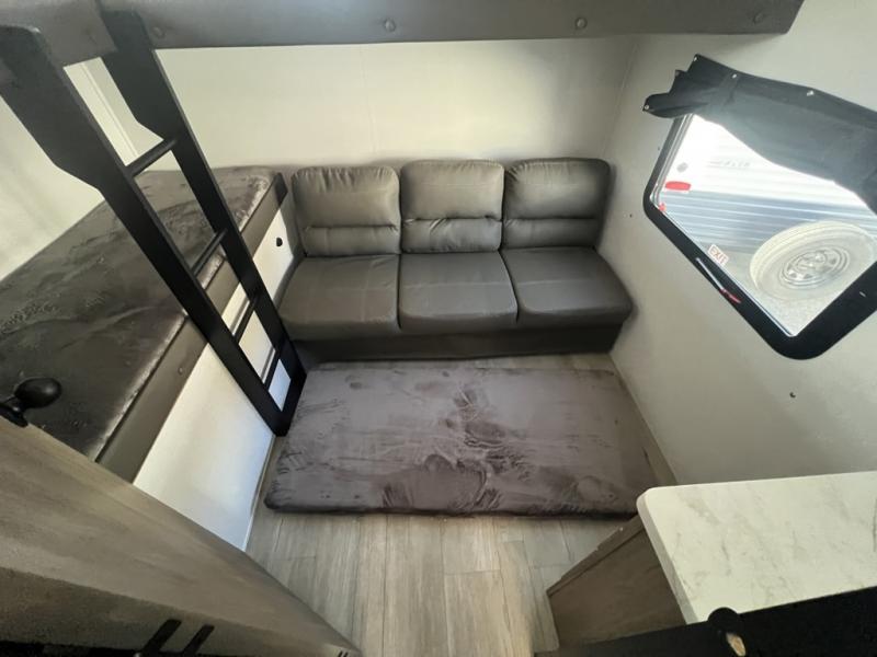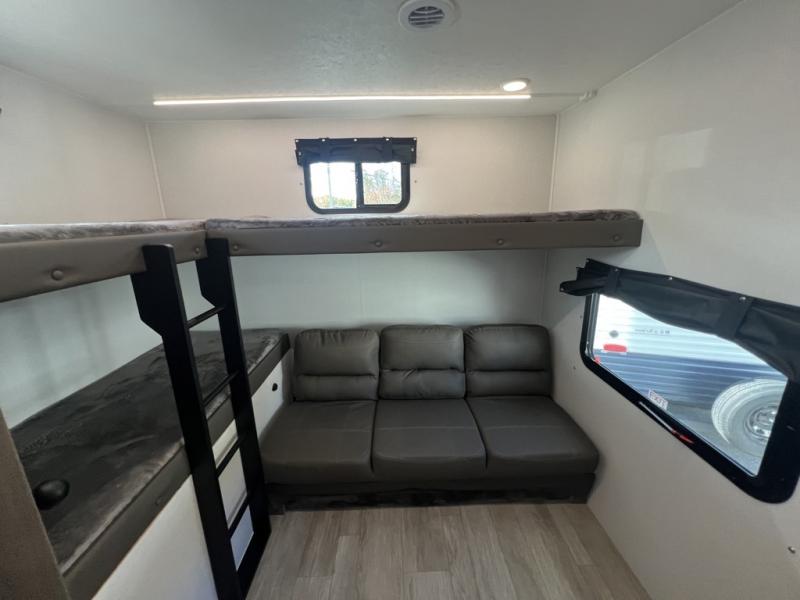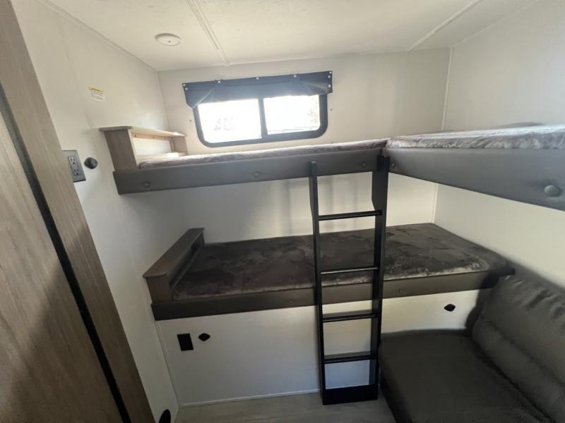 As you step into this trailer, you'll find the main bedroom at the front, featuring a spacious 60" x 80" queen bed with a wardrobe on each side for your clothes and essentials. At the center, the living area offers a large slide-out that holds a roomy U-shaped dinette perfect for meals or game nights beside it a comfortable sofa for extra seating. Opposite the slide, the L-shaped kitchen comes fully equipped with a 10-cu. ft. refrigerator, Magic Chef microwave and gas cooktop, plus a flip-up countertop for added prep space. Toward the rear, a full bathroom includes a large shower and generous counter space, and at the very back, the bunkhouse provides sleeping room for up to five, features a double bunk, bunk above sofa and trundle mat, making it easy to bring the whole crew along for the adventure.
