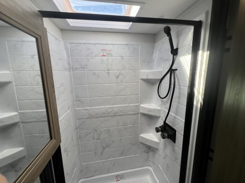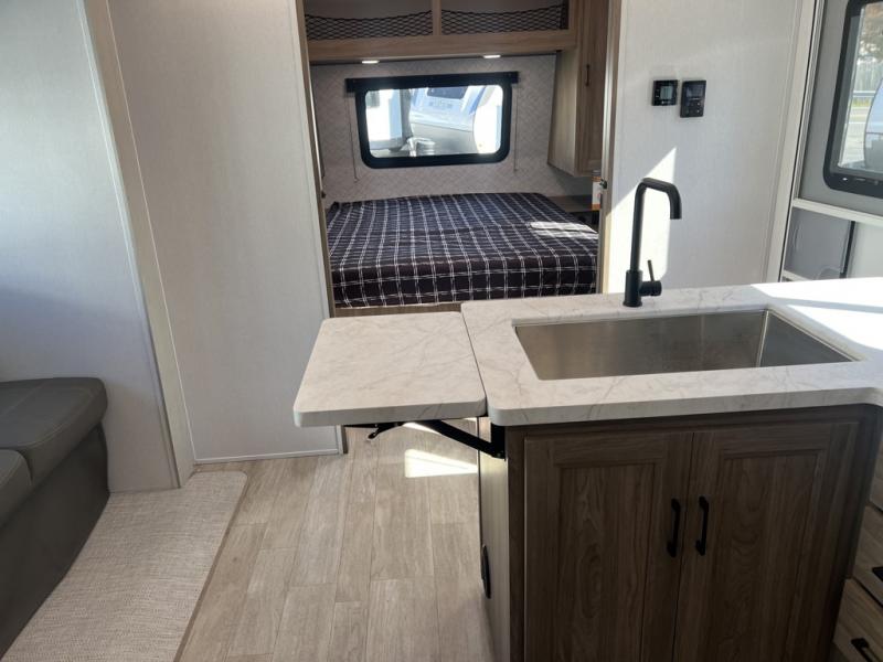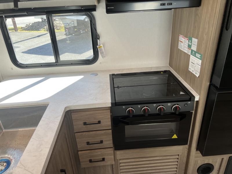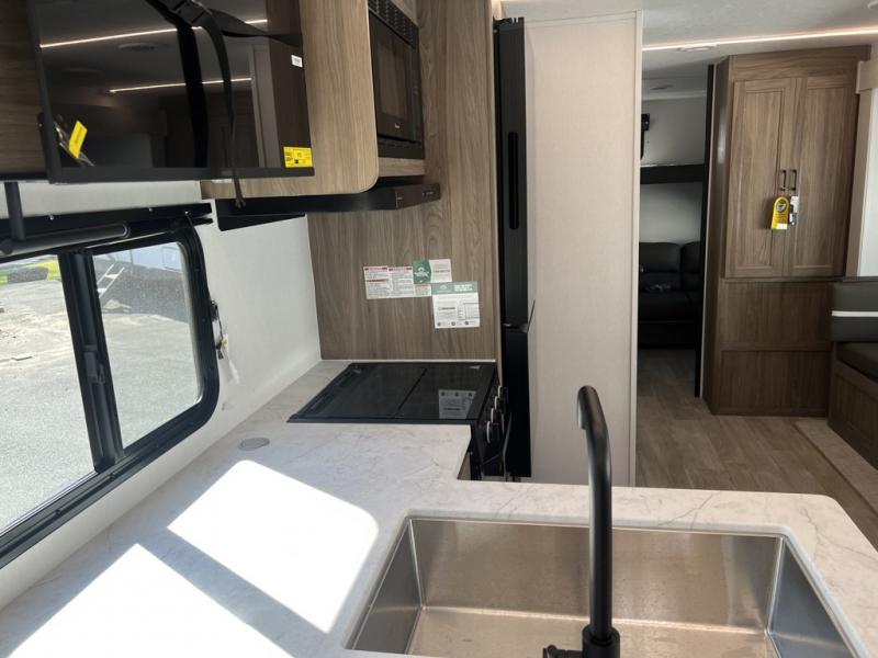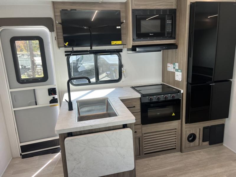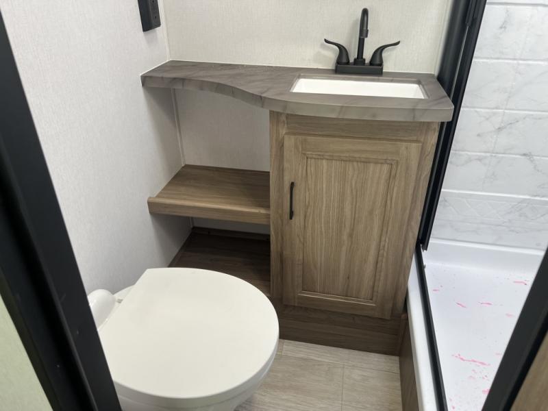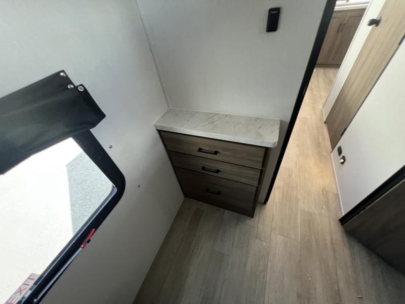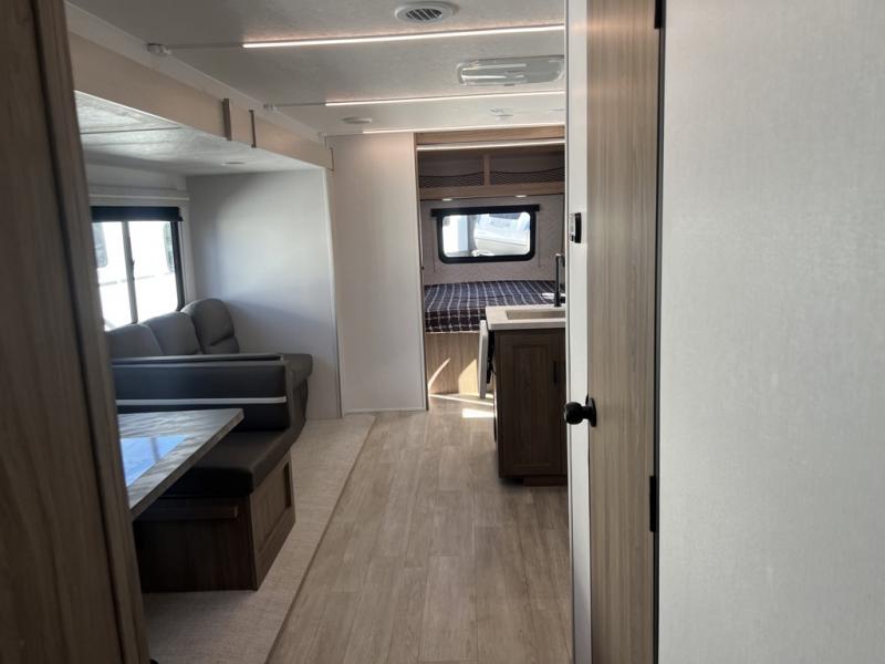 As you step into this trailer, you'll find the main bedroom at the front, featuring a spacious 60" x 80" queen bed with a wardrobe on each side for your clothes and essentials. At the center, the living area offers a large slide-out that holds a roomy U-shaped dinette perfect for meals or game nights beside it a comfortable sofa for extra seating. Opposite the slide, the L-shaped kitchen comes fully equipped with a 10-cu. ft. refrigerator, Magic Chef microwave and gas cooktop, plus a flip-up countertop for added prep space. Toward the rear, a full bathroom includes a large shower and generous counter space, and at the very back, the bunkhouse provides sleeping room for up to five, features a double bunk, bunk above sofa and trundle mat, making it easy to bring the whole crew along for the adventure.