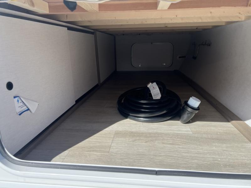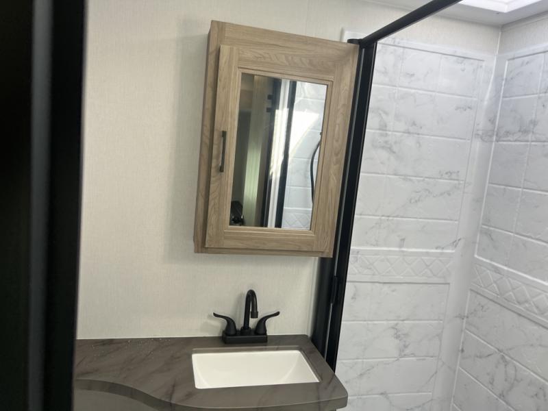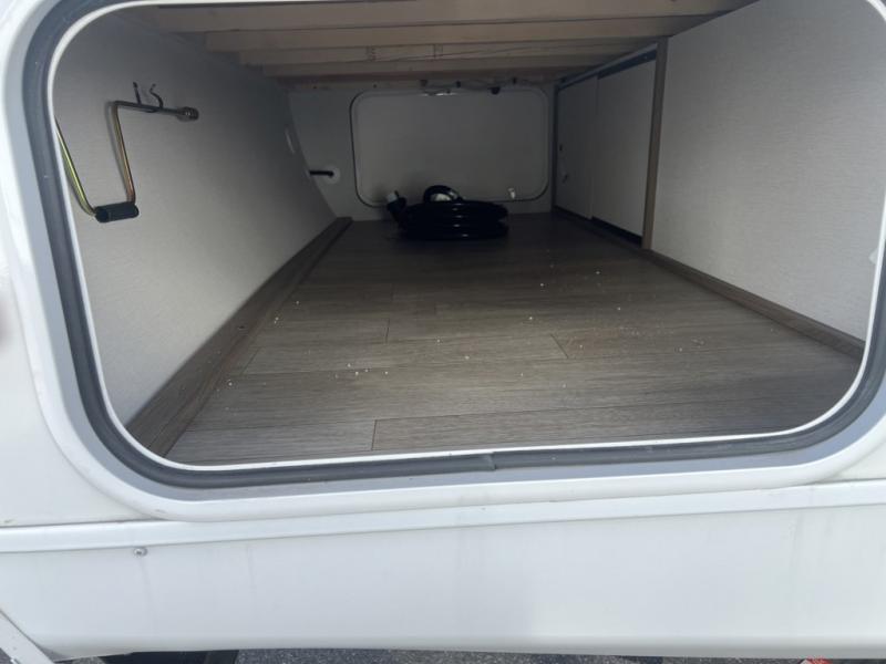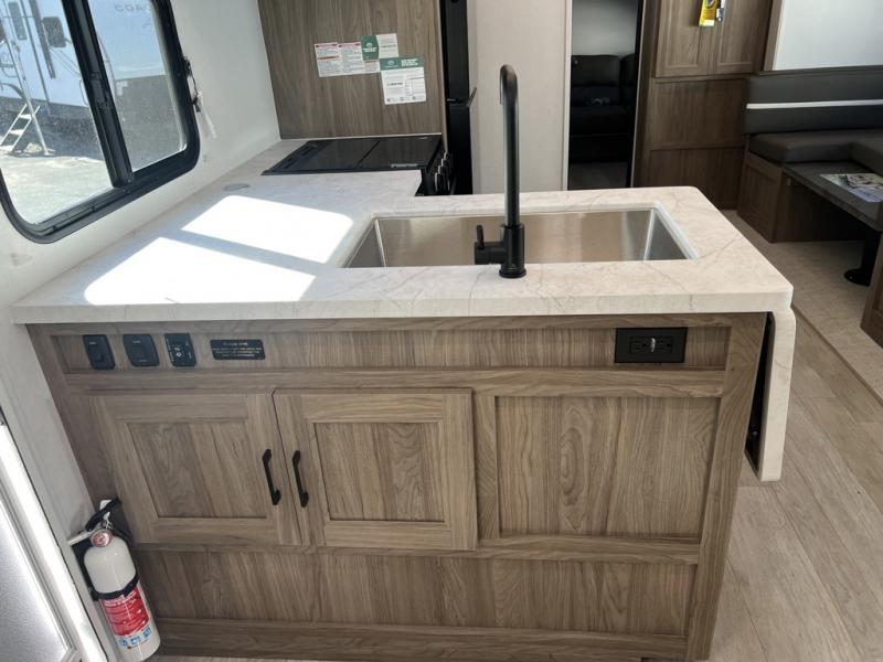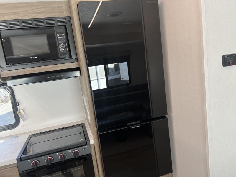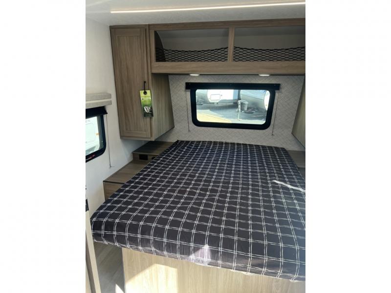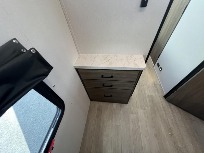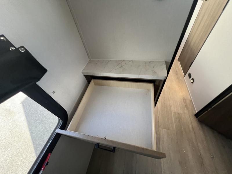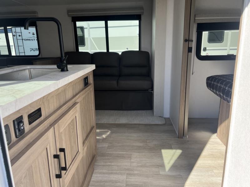 As you step into this trailer, you'll find the main bedroom at the front, featuring a spacious 60" x 80" queen bed with a wardrobe on each side for your clothes and essentials. At the center, the living area offers a large slide-out that holds a roomy U-shaped dinette perfect for meals or game nights beside it a comfortable sofa for extra seating. Opposite the slide, the L-shaped kitchen comes fully equipped with a 10-cu. ft. refrigerator, Magic Chef microwave and gas cooktop, plus a flip-up countertop for added prep space. Toward the rear, a full bathroom includes a large shower and generous counter space, and at the very back, the bunkhouse provides sleeping room for up to five, features a double bunk, bunk above sofa and trundle mat, making it easy to bring the whole crew along for the adventure.