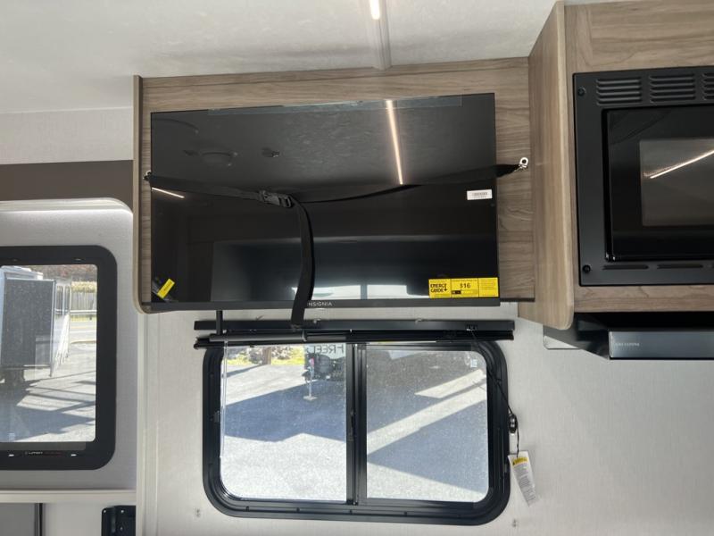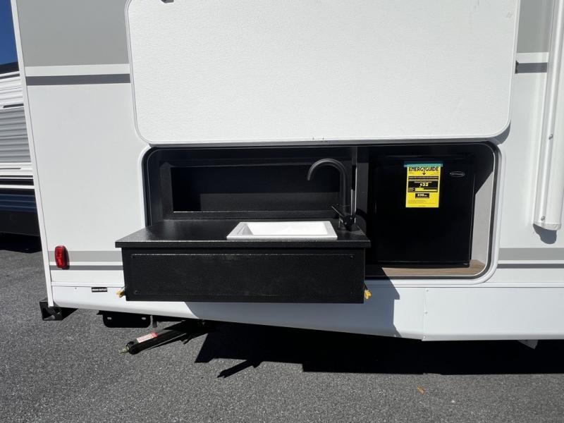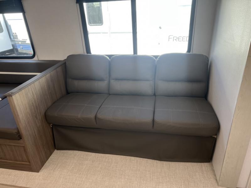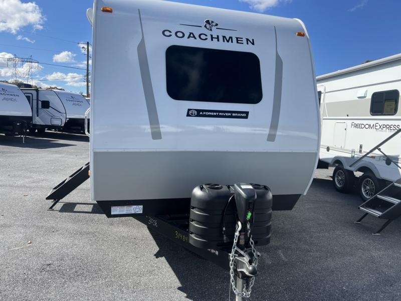 With any Freedom Express Select travel trailer by Coachmen you will find an alumicage construction and two-step vacuum bonded and pinch rolled sidewalls with Azdel interior and exterior for a trailer made to last. These Select value models come standard with a Bluetooth interior speaker, night shades, and wear-resistant vinyl flooring throughout. You will appreciate the power tongue jack, as well as the Dicor Tufflex PVC roof and heated and enclosed underbelly to help with protection and climate control. A GE 15K BTU roof A/C will keep you comfortable, and the suburban tankless water heater will provide endless hot showers!