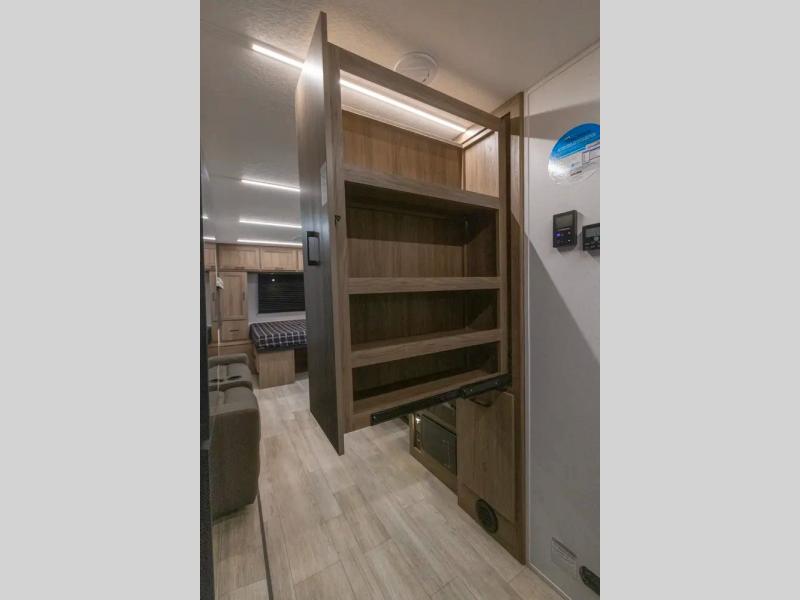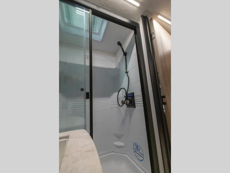 This is the perfect couple's trailer to take to the lake every other weekend. You will enjoy your own queen bed up front that includes vaulted under-bed storage for your luggage. The sofa slide out with a free-standing table provides a place to relax and dine together, and if you have an overnight guest, they can sleep here. The chef can prepare meals on the three burner cooktop or in the microwave oven, and there is a stainless steel sink for easy clean up. This model also includes a full bath with a linen closet for clean towels, and a 32" radius shower with a skylight for more standing space.