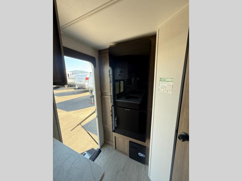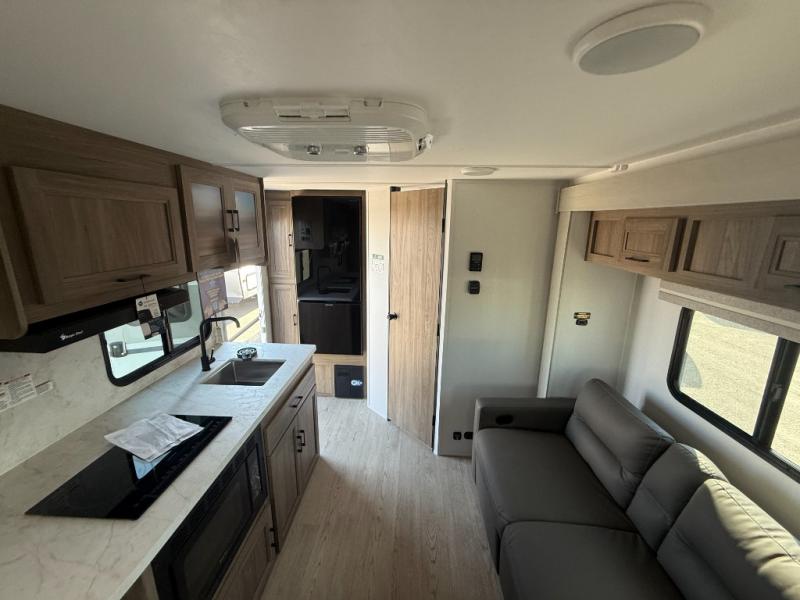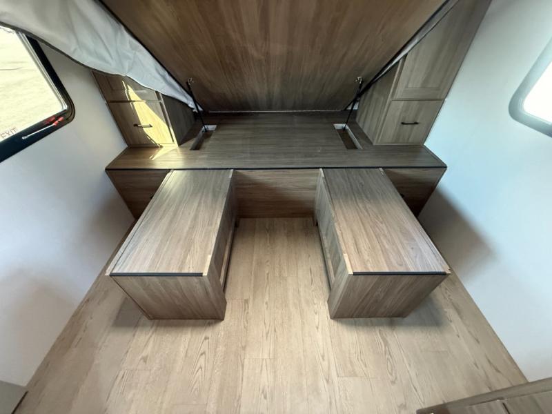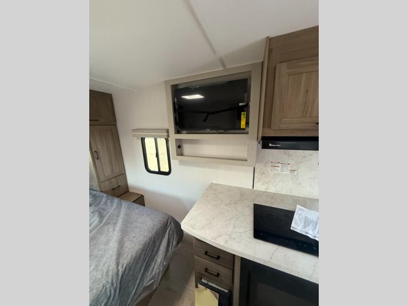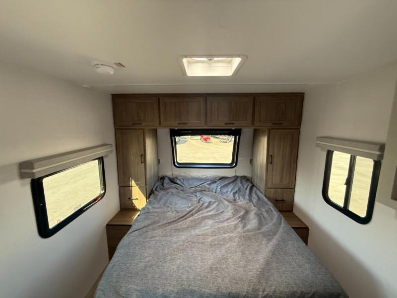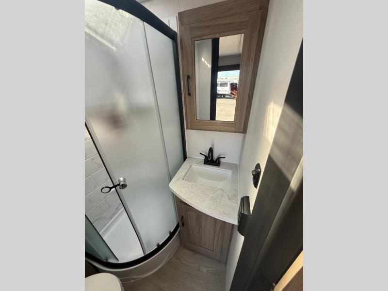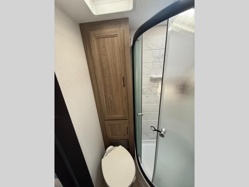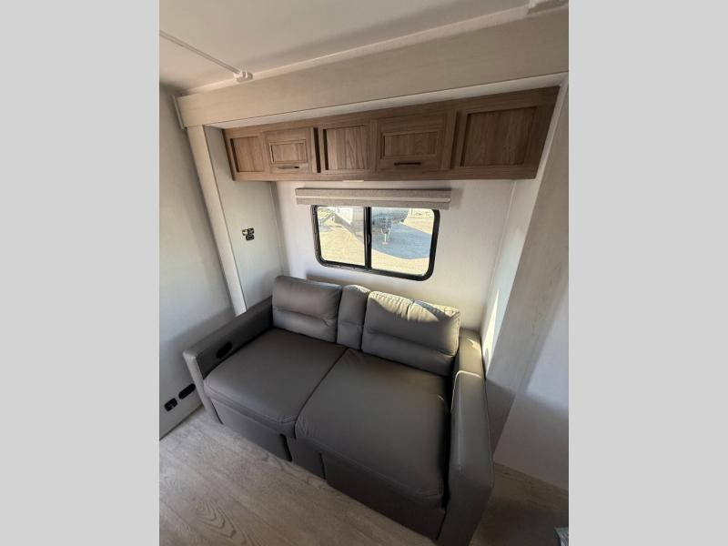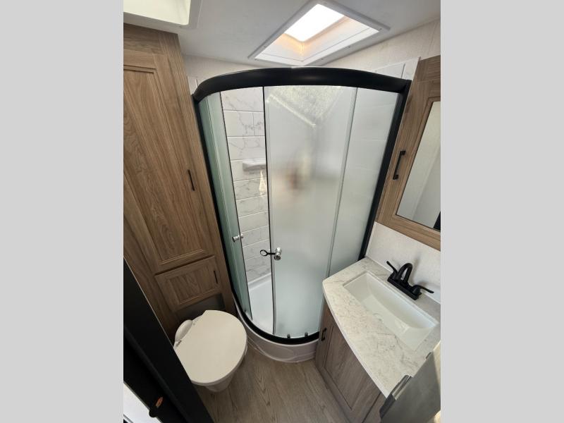This is the perfect couple's trailer to take to the lake every other weekend. You will enjoy your own queen bed up front that includes vaulted under-bed storage for your luggage. The sofa slide out with a free-standing table provides a place to relax and dine together, and if you have an overnight guest, they can sleep here. The chef can prepare meals on the three burner cooktop or in the microwave oven, and there is a stainless steel sink for easy clean up. This model also includes a full bath with a linen closet for clean towels, and a 32" radius shower with a skylight for more standing space.