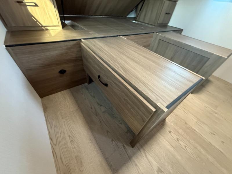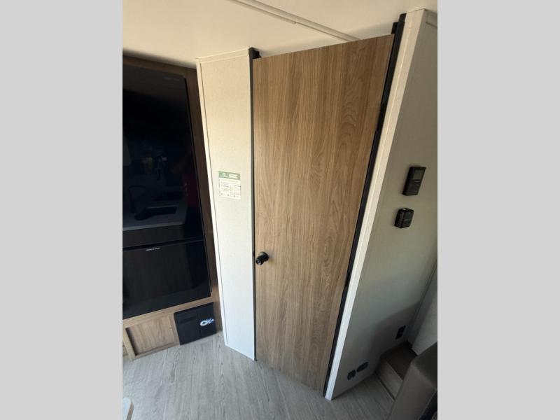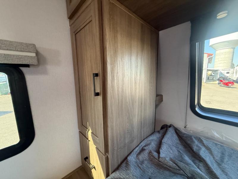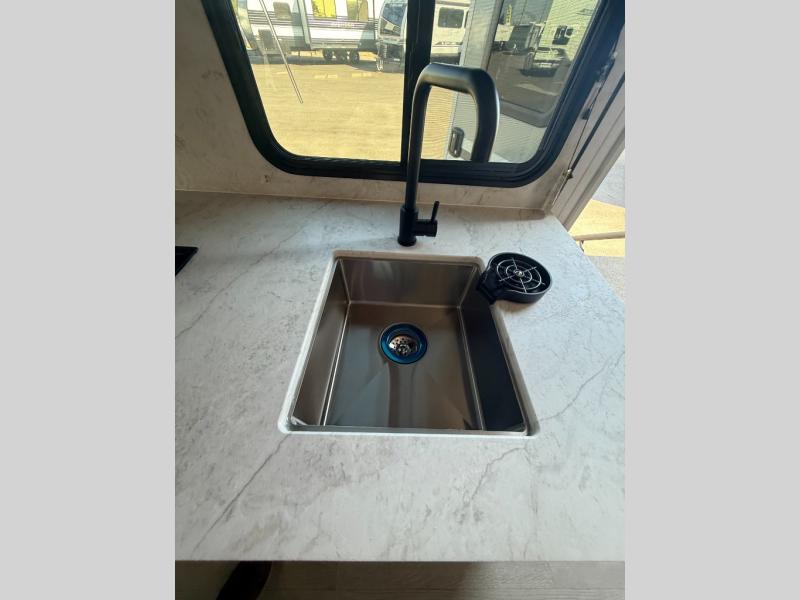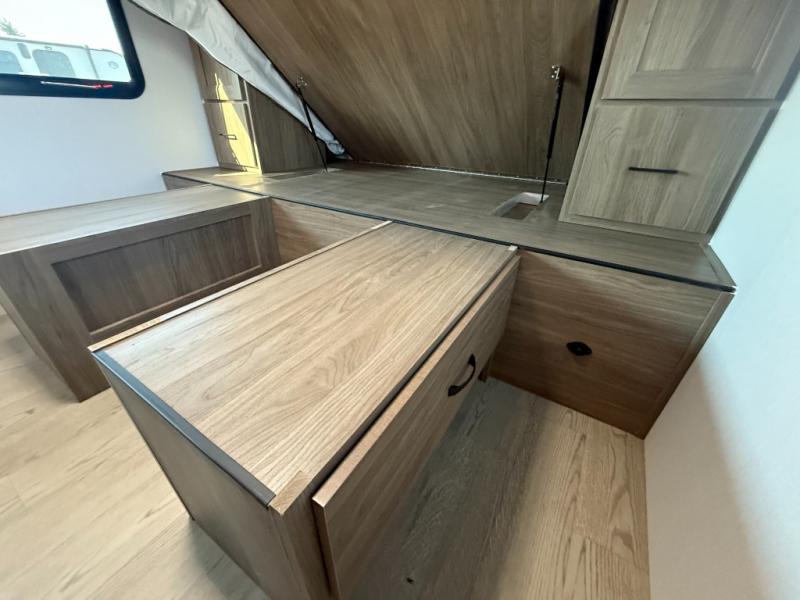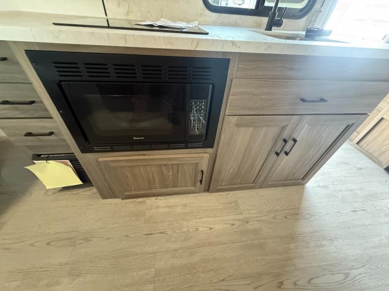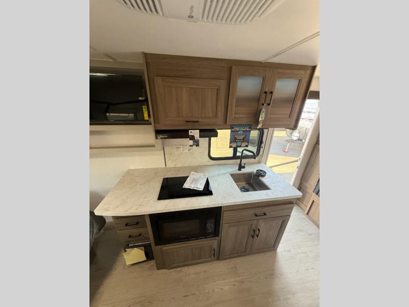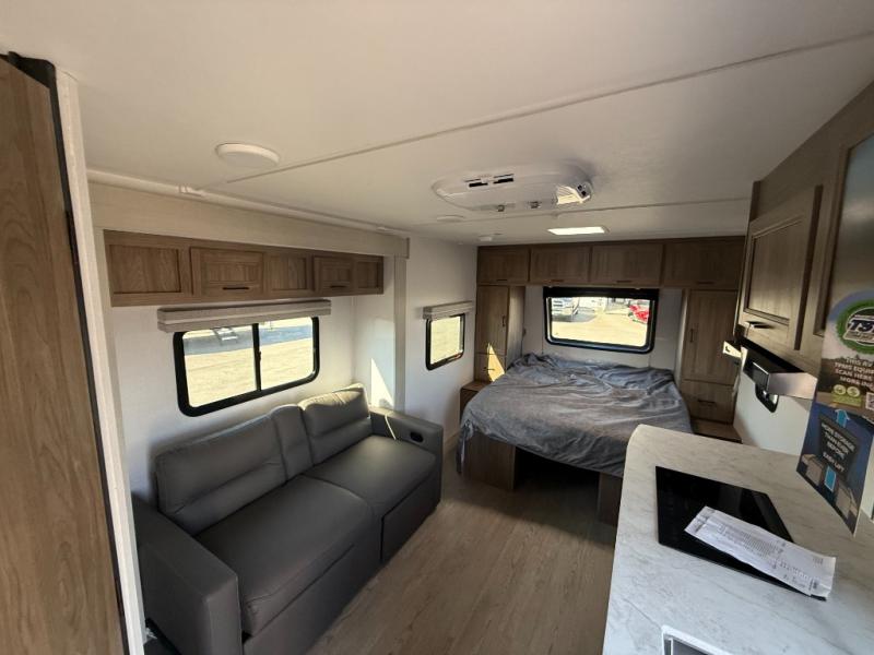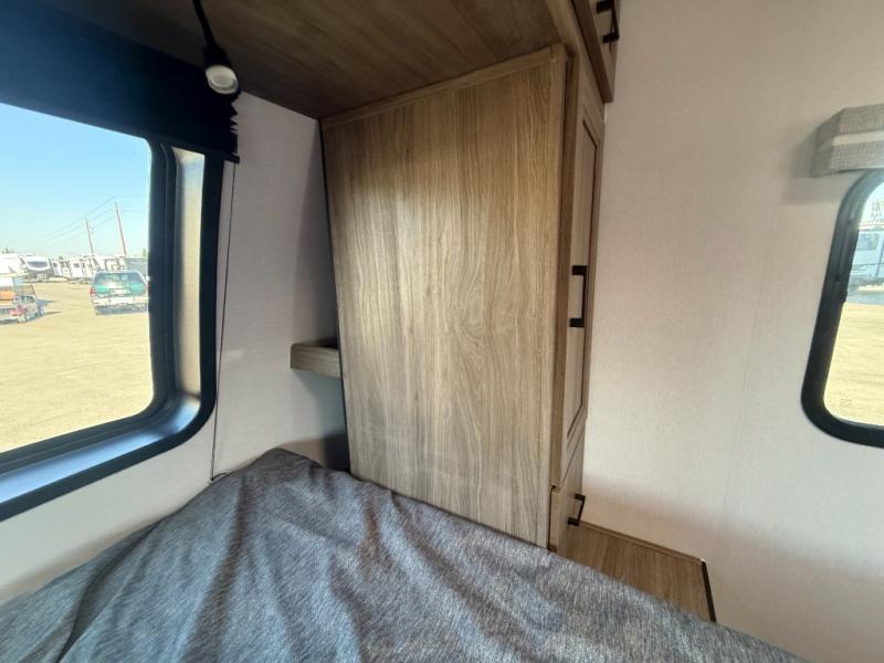 This is the perfect couple's trailer to take to the lake every other weekend. You will enjoy your own queen bed up front that includes vaulted under-bed storage for your luggage. The sofa slide out with a free-standing table provides a place to relax and dine together, and if you have an overnight guest, they can sleep here. The chef can prepare meals on the three burner cooktop or in the microwave oven, and there is a stainless steel sink for easy clean up. This model also includes a full bath with a linen closet for clean towels, and a 32" radius shower with a skylight for more standing space.