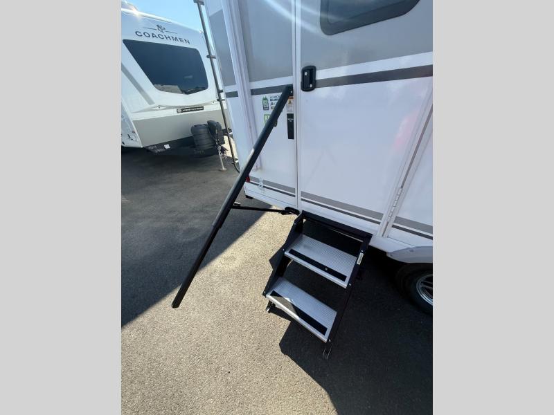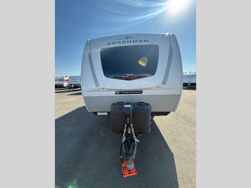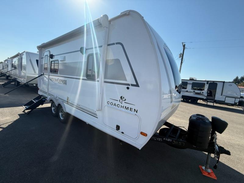 With any Freedom Express Ultra Lite travel trailer by Coachmen you will appreciate quality construction materials, such as vacuum bonded walls with Azdel composite, a 3/4 gel coated fiberglass cap with an automotive glass windshield, and a heated enclosed underbelly. Each model also features Tufflex PVC roofing, front rock guard, and E-Z Lube axles for smooth towing. Inside, you'll find kitchen backsplash, hidden hinge cabinetry, and wear-resistant vinyl flooring throughout. The power tongue jack included with the Ultra Lite Express Package will make set-up a breeze, and each model includes back-up camera prep and they are Freedom solar ready if you plan to go off-grid. Enjoy lightweight camping with a Freedom Express Ultra Lite travel trailer today!