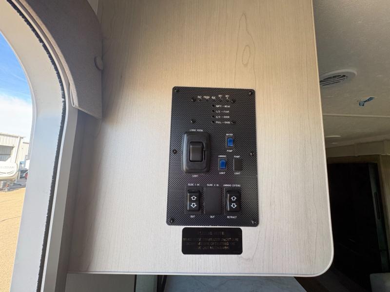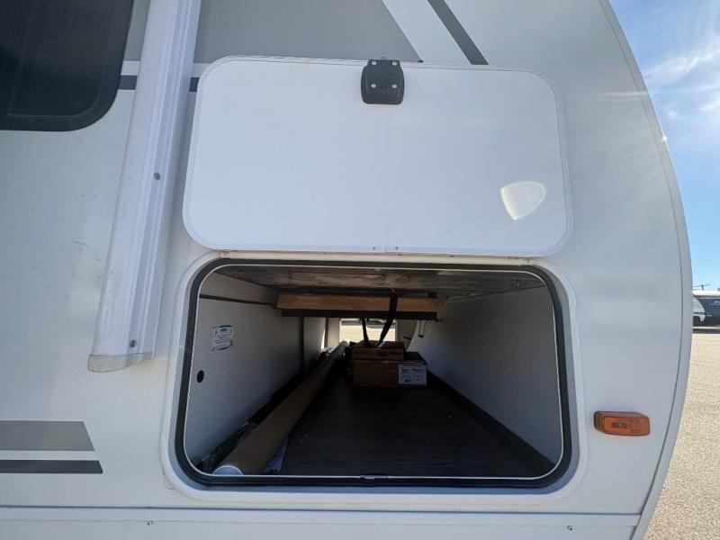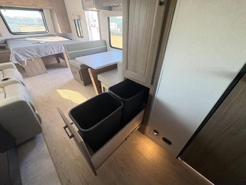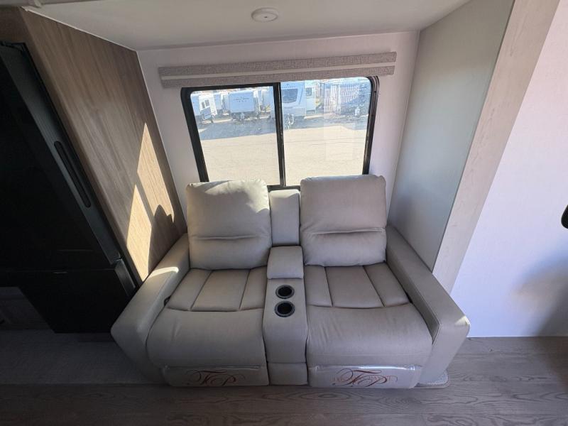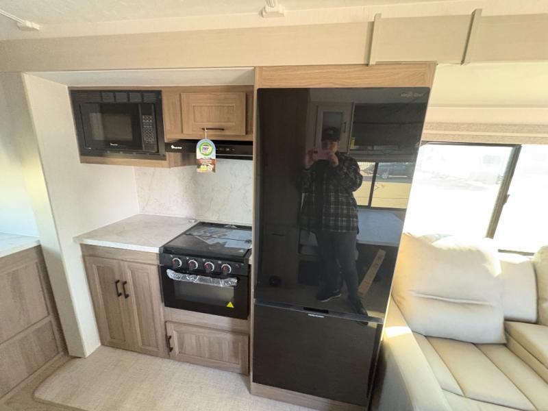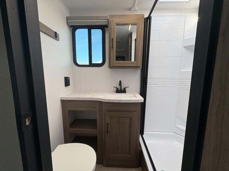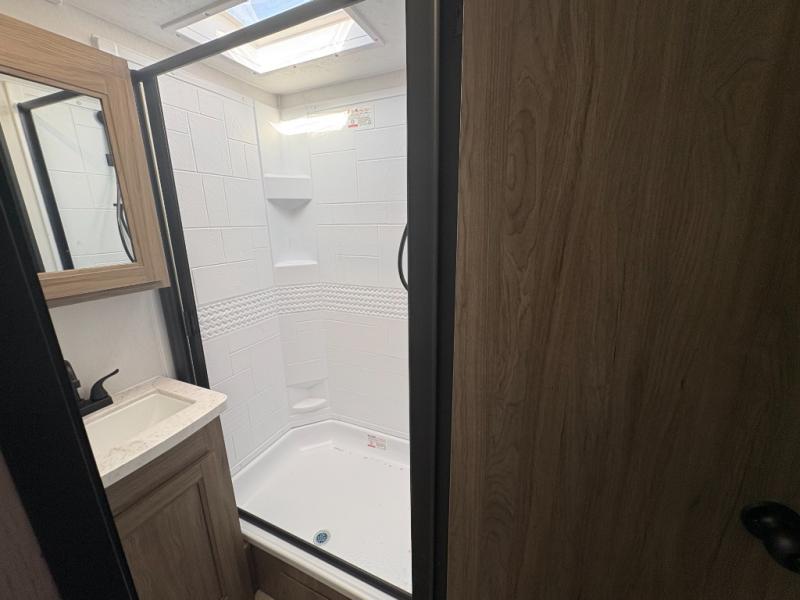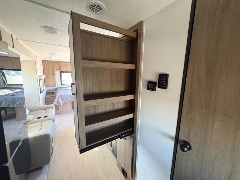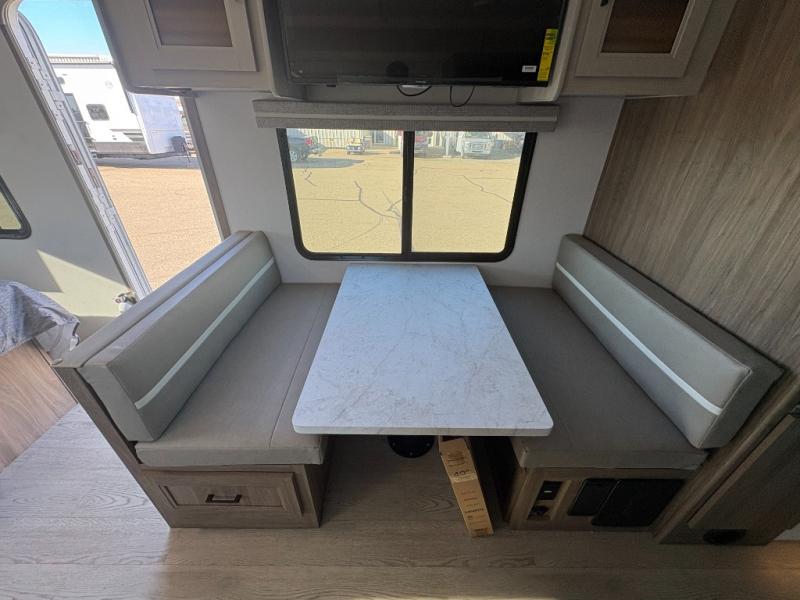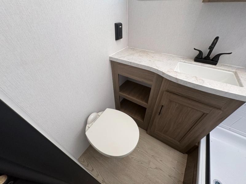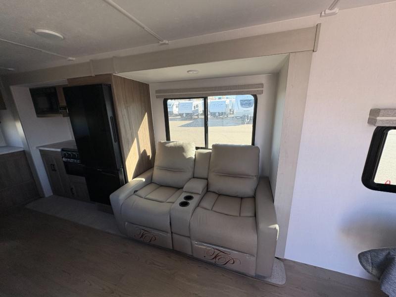 This trailer provides the perfect blend of utility and comfort. You will enjoy your own queen bed up front that includes vaulted under-bed storage for your luggage. A pair of theater seats provides a great spot to watch the flatscreen smart TV, and you can enjoy meals at the U-dinette. The chef will enjoy the well-equipped kitchen which includes a three burner cooktop, microwave, and stainless steel sink. Additional storage can be found in the overhead consoles plus a pantry/wardrobe closet.