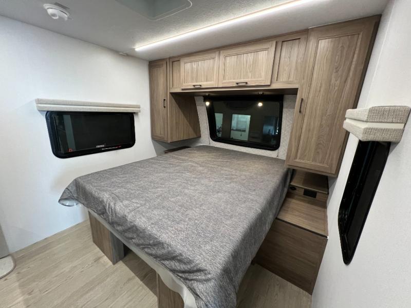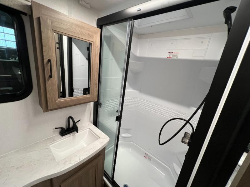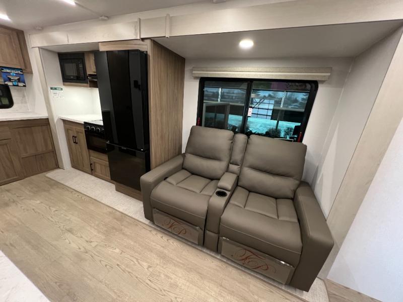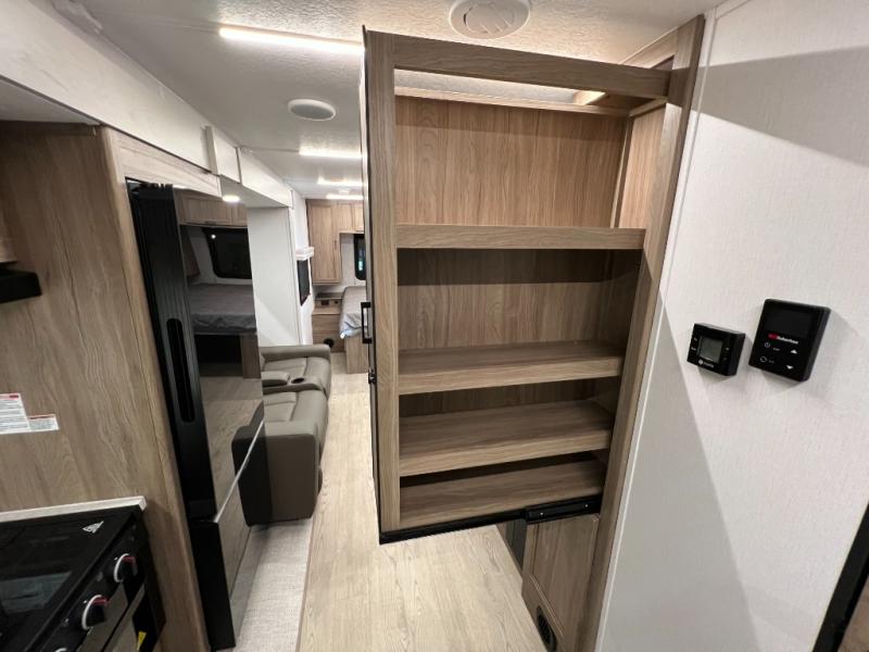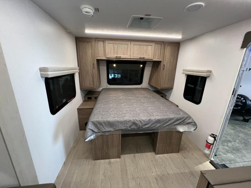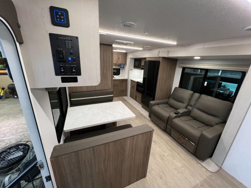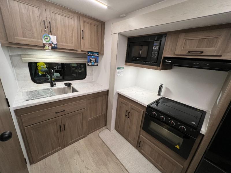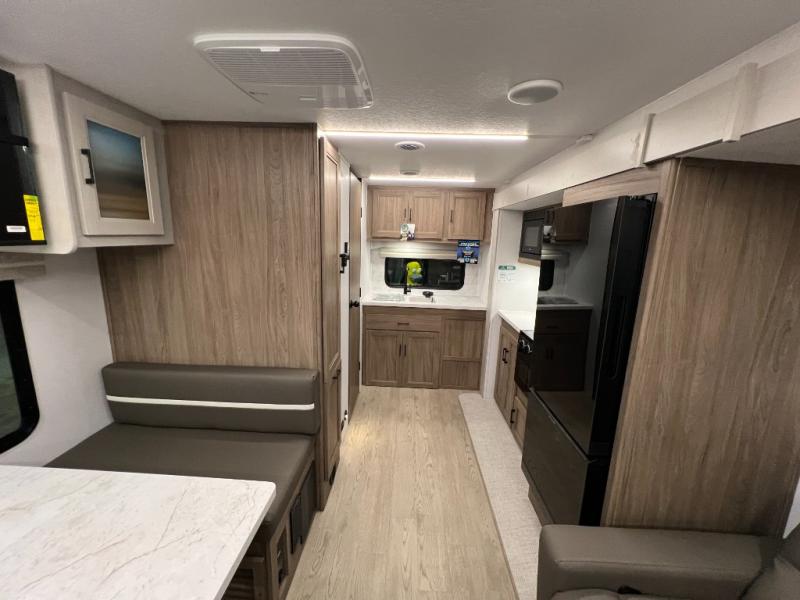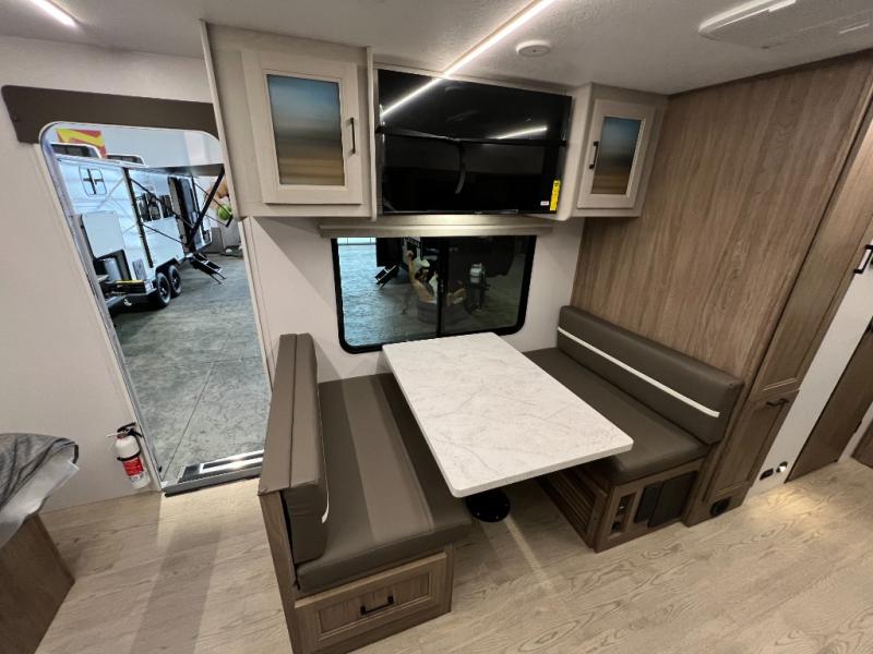This trailer provides the perfect blend of utility and comfort. You will enjoy your own queen bed up front that includes vaulted under-bed storage for your luggage. Theater seating provides a great spot to watch any show on the smart TV, and you can enjoy meals at the booth dinette. The chef will enjoy the well-equipped kitchen which includes a three burner cooktop, microwave, and stainless steel sink. Additional storage can be found in the overhead consoles plus a pantry/wardrobe closet.