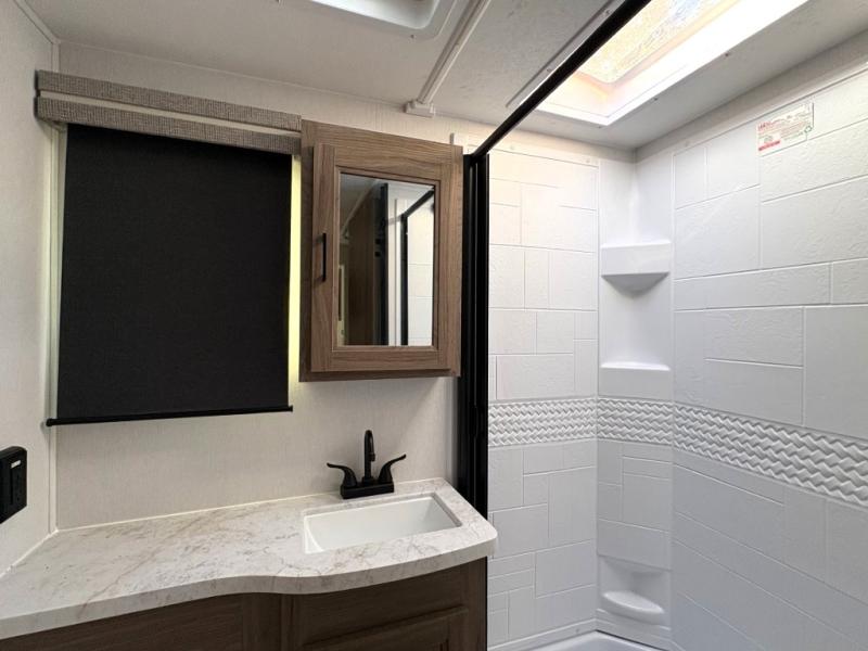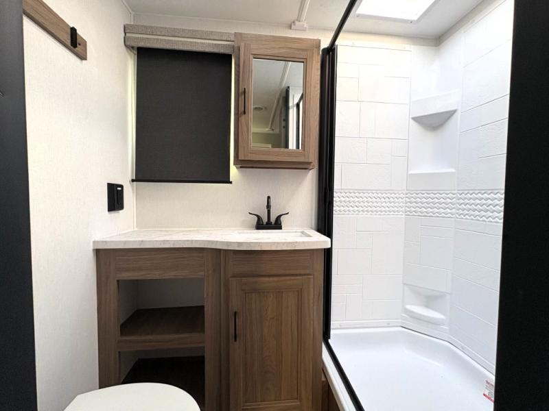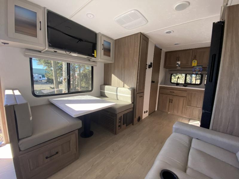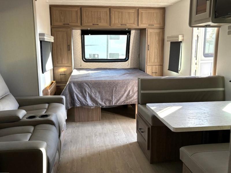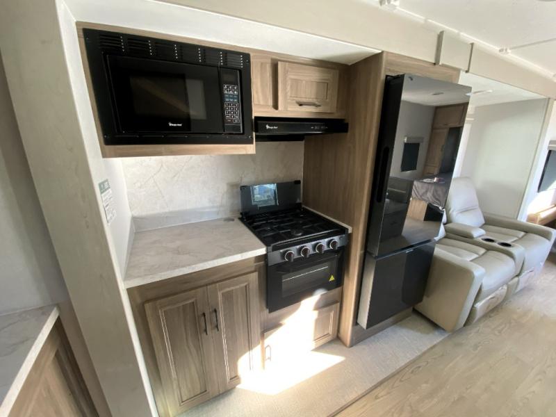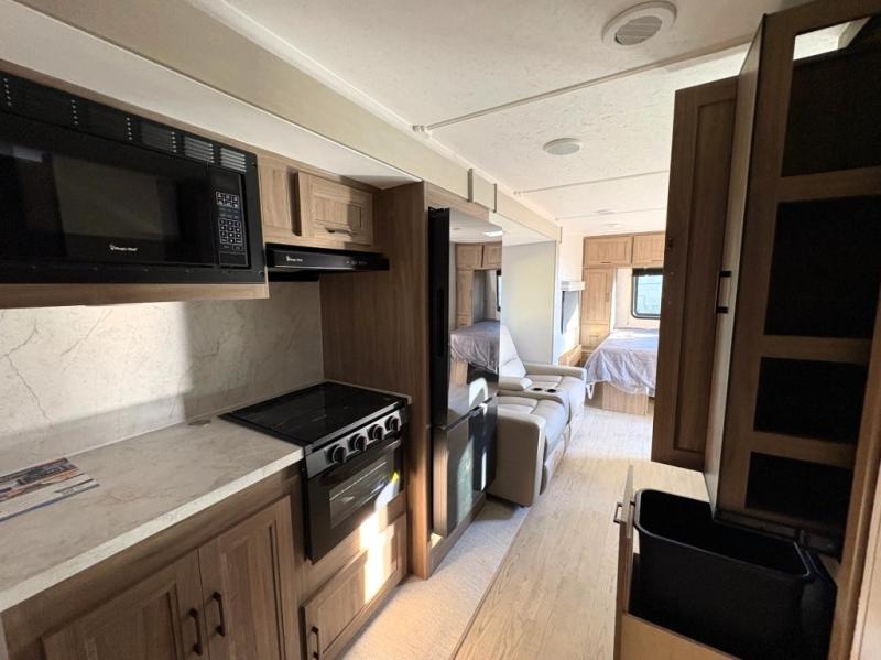 This trailer provides the perfect blend of utility and comfort. You will enjoy your own queen bed up front that includes vaulted under-bed storage for your luggage. A pair of theater seats provides a great spot to watch the flatscreen smart TV, and you can enjoy meals at the U-dinette. The chef will enjoy the well-equipped kitchen which includes a three burner cooktop, microwave, and stainless steel sink. Additional storage can be found in the overhead consoles plus a pantry/wardrobe closet.