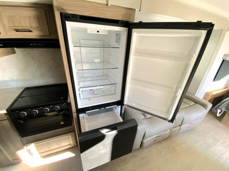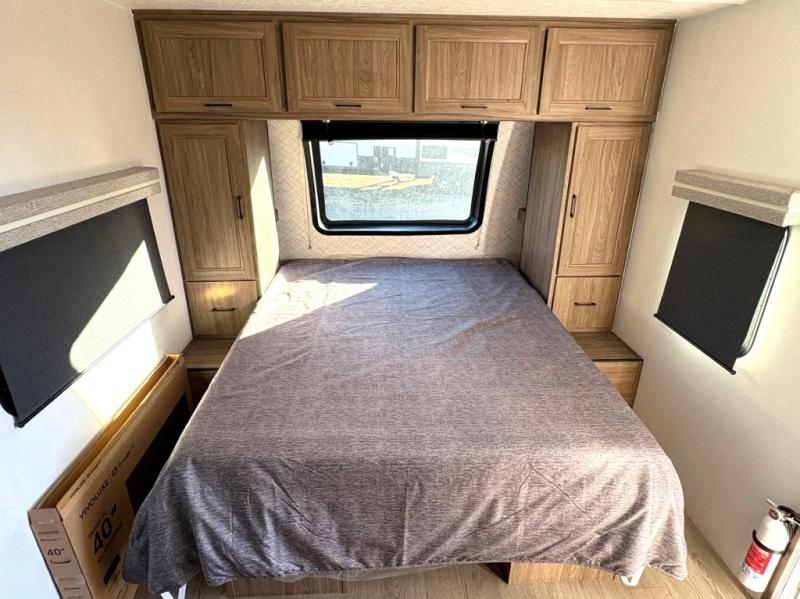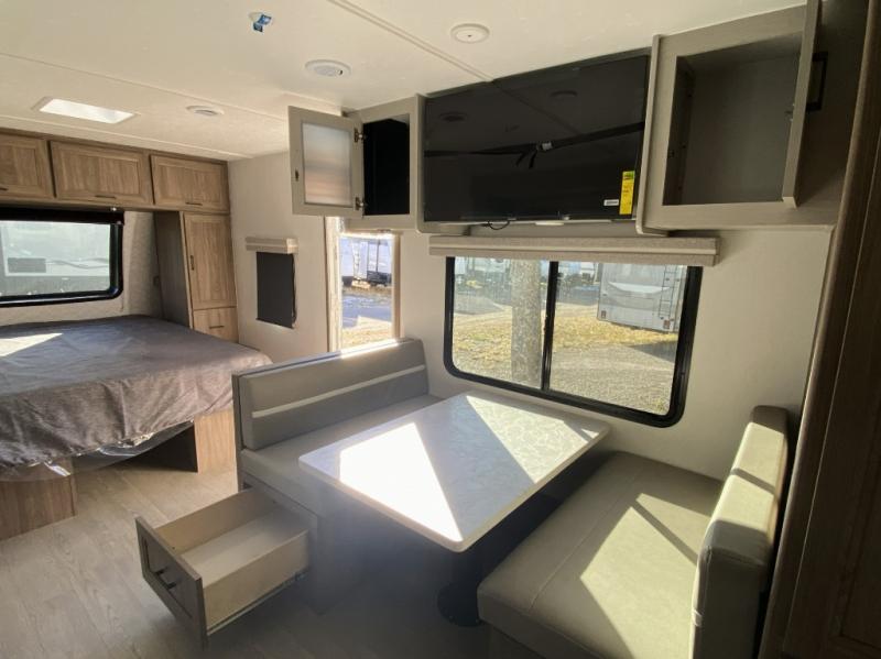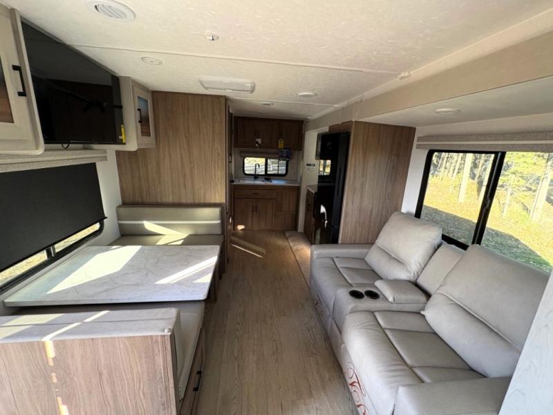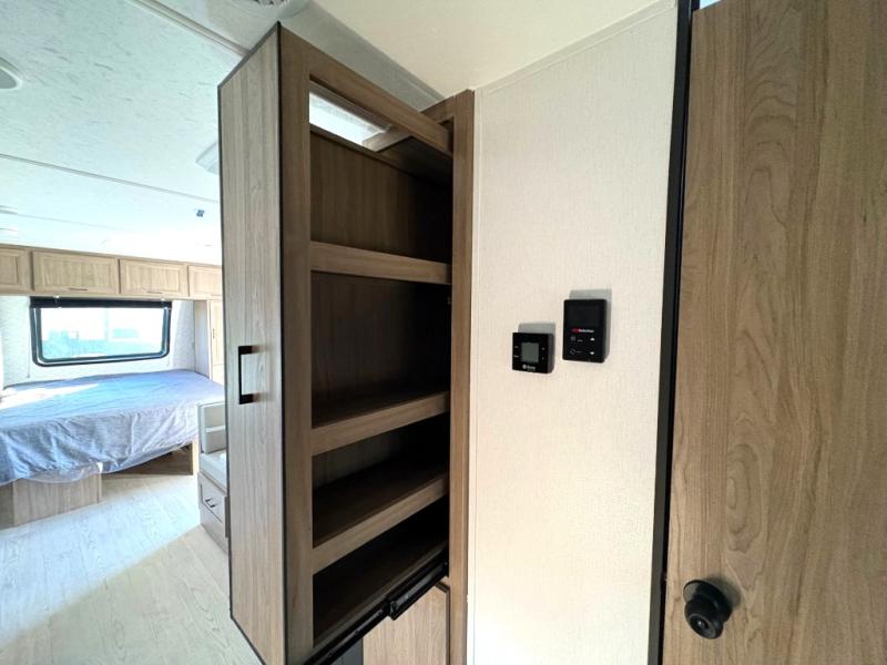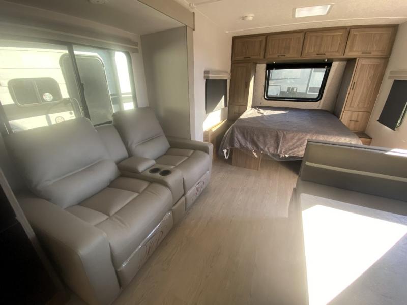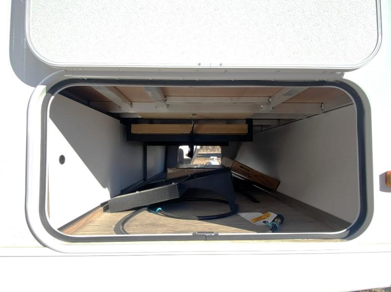 This trailer provides the perfect blend of utility and comfort. You will enjoy your own queen bed up front that includes vaulted under-bed storage for your luggage. A pair of theater seats provides a great spot to watch the flatscreen smart TV, and you can enjoy meals at the U-dinette. The chef will enjoy the well-equipped kitchen which includes a three burner cooktop, microwave, and stainless steel sink. Additional storage can be found in the overhead consoles plus a pantry/wardrobe closet.