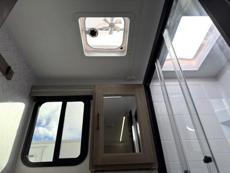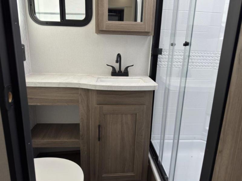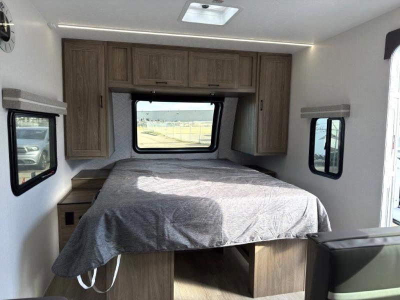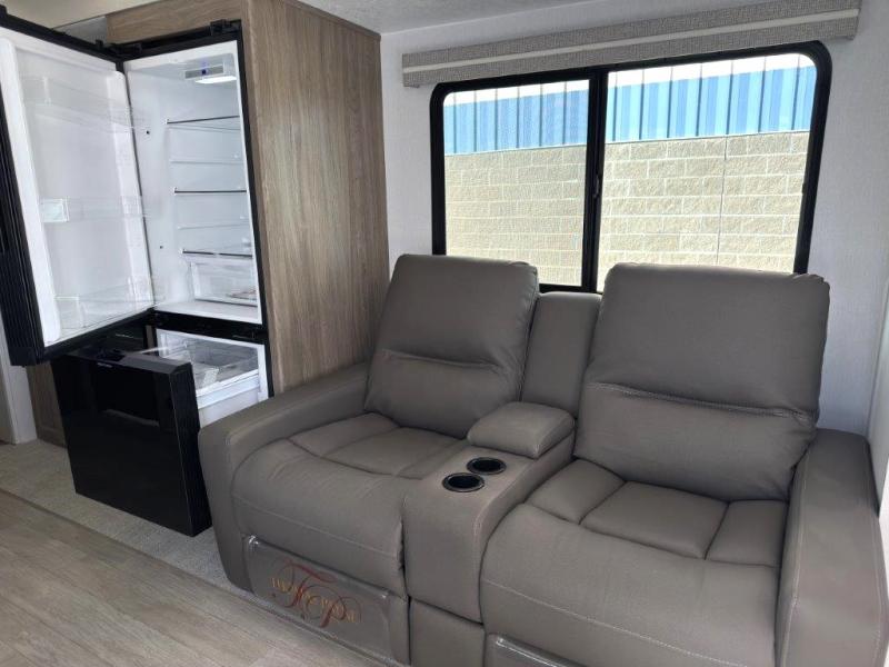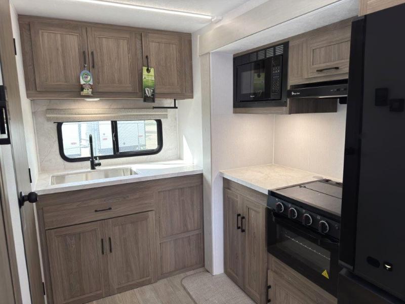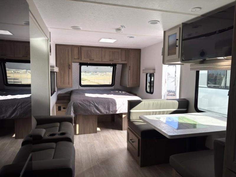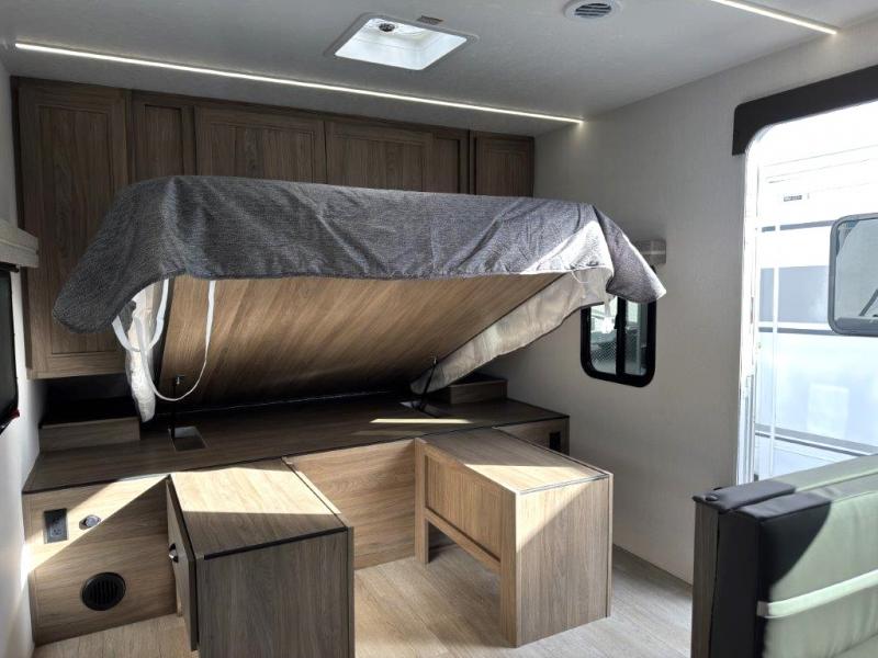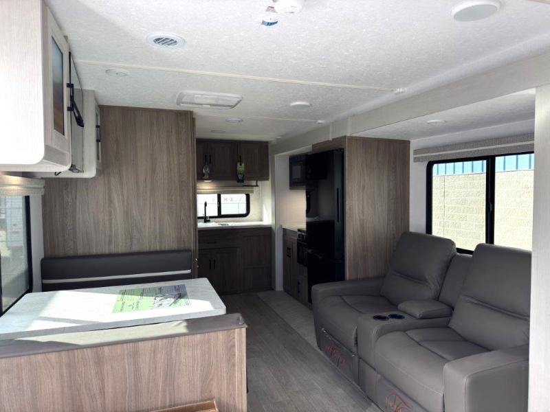 This trailer provides the perfect blend of utility and comfort. You will enjoy your own queen bed up front that includes vaulted under-bed storage for your luggage. Theater seating provides a great spot to watch any show on the smart TV, and you can enjoy meals at the booth dinette. The chef will enjoy the well-equipped kitchen which includes a three burner cooktop, microwave, and stainless steel sink. Additional storage can be found in the overhead consoles plus a pantry/wardrobe closet.