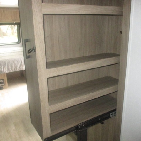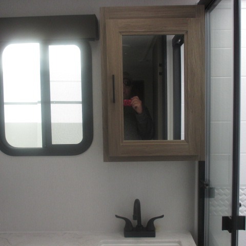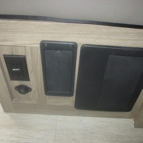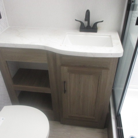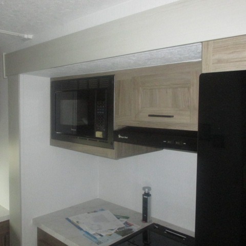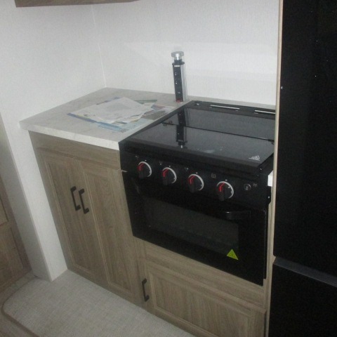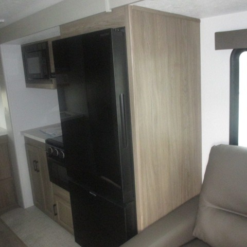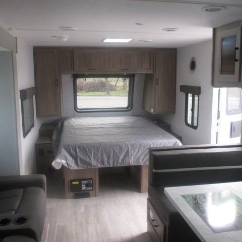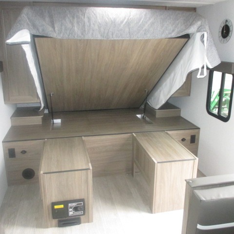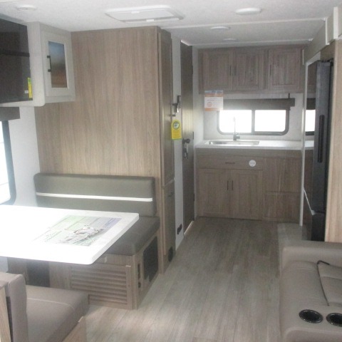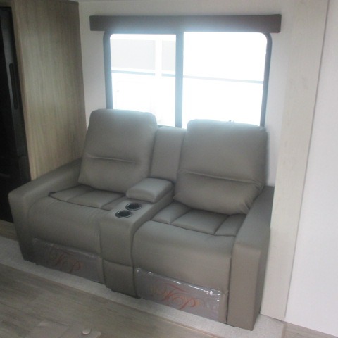This trailer provides the perfect blend of utility and comfort. You will enjoy your own queen bed up front that includes vaulted under-bed storage for your luggage. Theater seating provides a great spot to watch any show on the smart TV, and you can enjoy meals at the booth dinette. The chef will enjoy the well-equipped kitchen which includes a three burner cooktop, microwave, and stainless steel sink. Additional storage can be found in the overhead consoles plus a pantry/wardrobe closet.