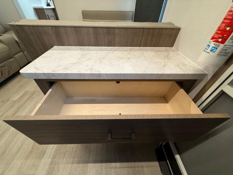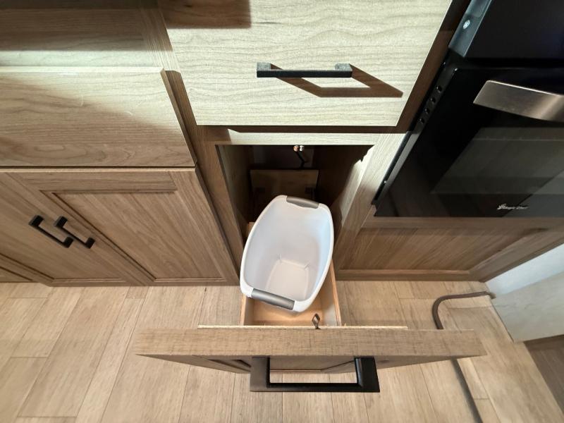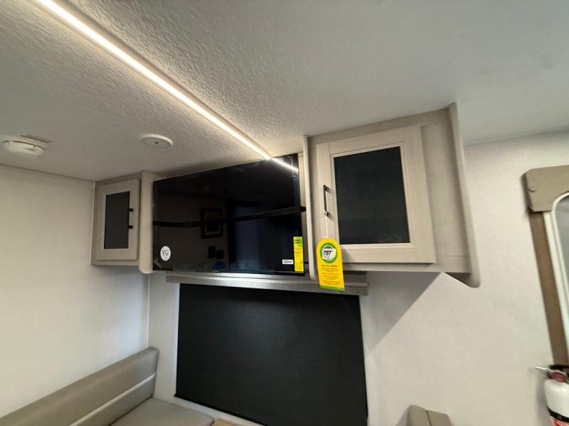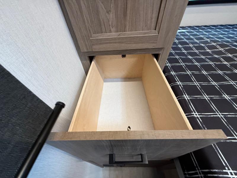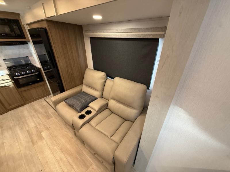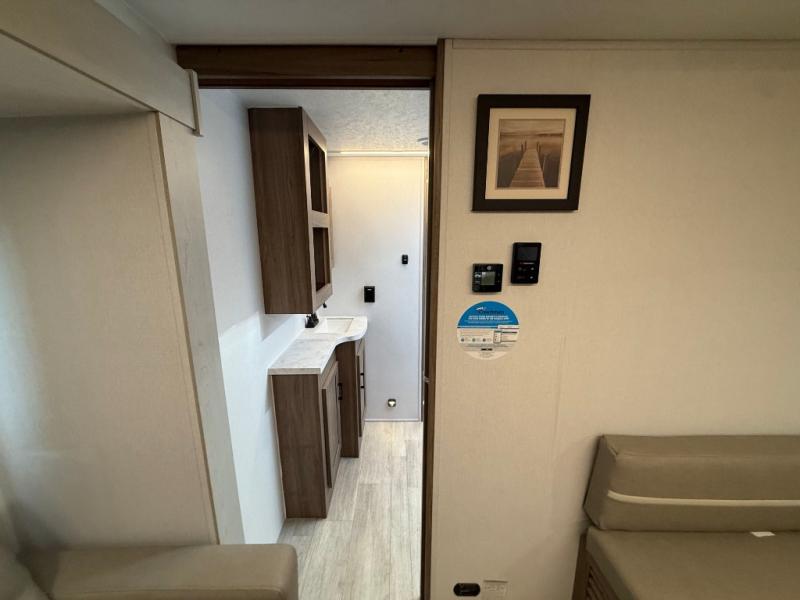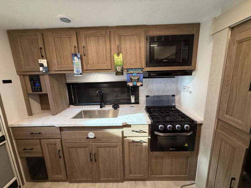 Check out this rear kitchen travel trailer that can sleep three to four each night. The front master bedroom includes a queen bed with vaulted under-bed storage for your belongings and dual wardrobes for even more storage. The theater seating within the large slide out and the booth dinette will provide comfortable seating space, and there is a Smart TV for those rainy camp days. This model also includes a three burner cooktop, a microwave oven, and an 10 cu. ft. double door refrigerator for your perishables. And don't forget about the power awning with LED lights!