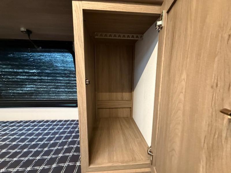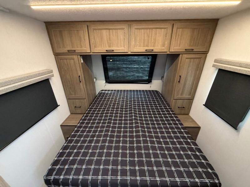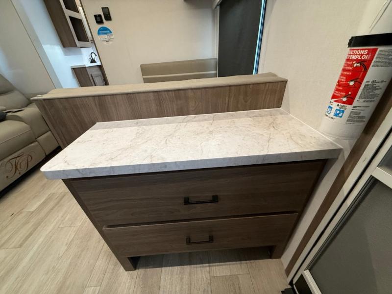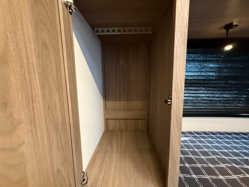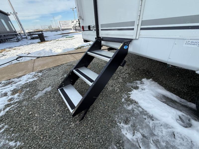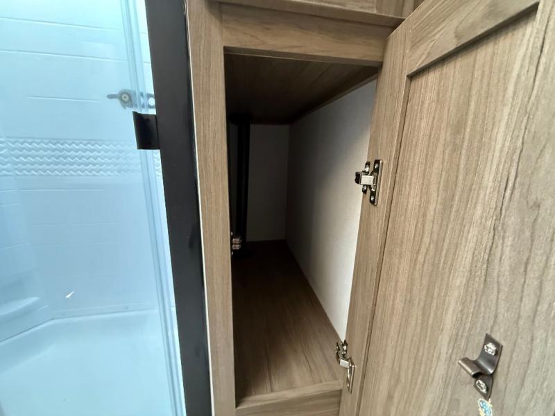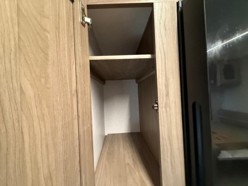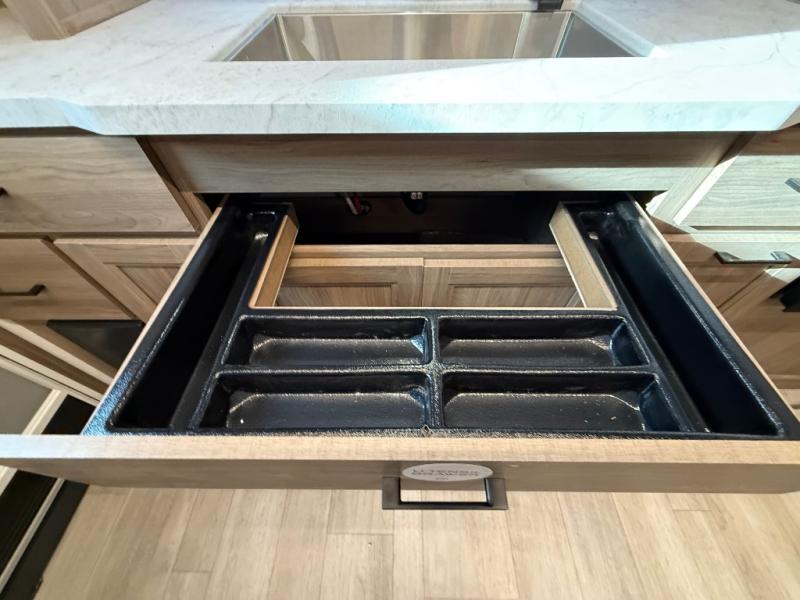 Check out this rear kitchen travel trailer that can sleep three to four each night. The front master bedroom includes a queen bed with vaulted under-bed storage for your belongings and dual wardrobes for even more storage. The theater seating within the large slide out and the booth dinette will provide comfortable seating space, and there is a Smart TV for those rainy camp days. This model also includes a three burner cooktop, a microwave oven, and an 10 cu. ft. double door refrigerator for your perishables. And don't forget about the power awning with LED lights!