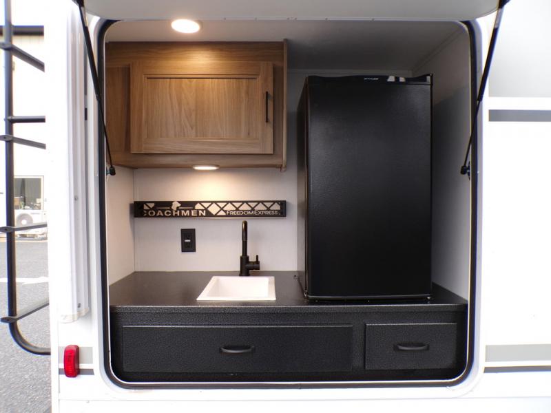 With any Freedom Express Ultra Lite travel trailer by Coachmen you will appreciate quality construction materials, such as vacuum bonded walls with Azdel composite, a 3/4 gel coated fiberglass cap with an automotive glass windshield, and a heated enclosed underbelly. Each model also features Tufflex PVC roofing, front rock guard, and E-Z Lube axles for smooth towing. Inside, you'll find kitchen backsplash, hidden hinge cabinetry, and wear-resistant vinyl flooring throughout. The power tongue jack included with the Ultra Lite Express Package will make set-up a breeze, and each model includes back-up camera prep and they are Freedom solar ready if you plan to go off-grid. Enjoy lightweight camping with a Freedom Express Ultra Lite travel trailer today!