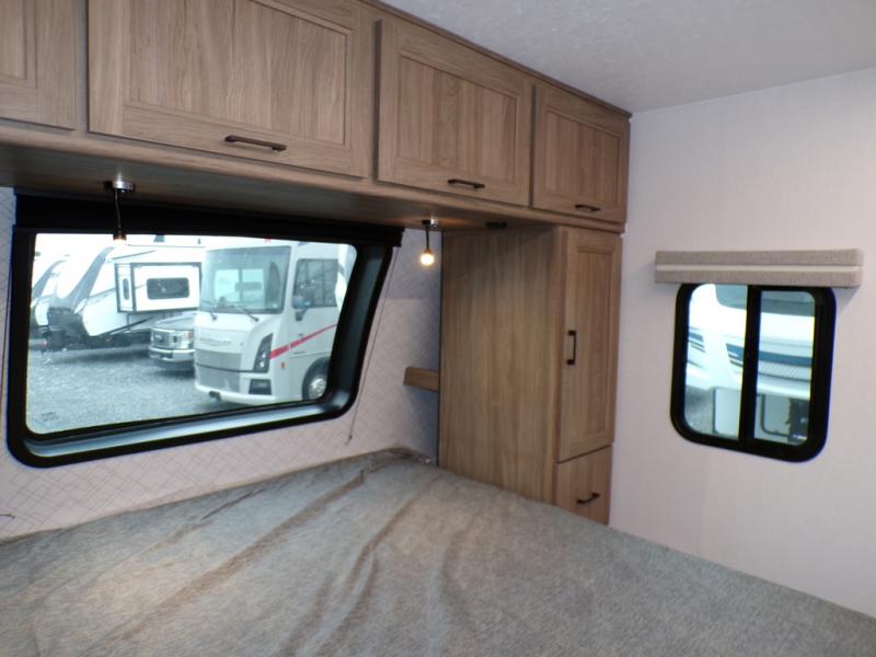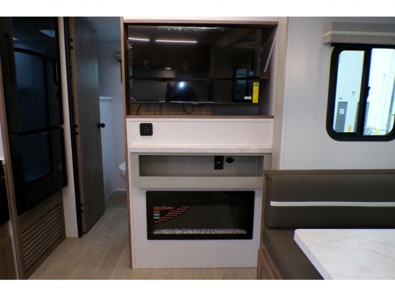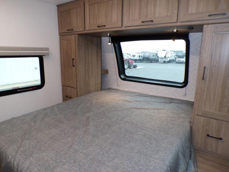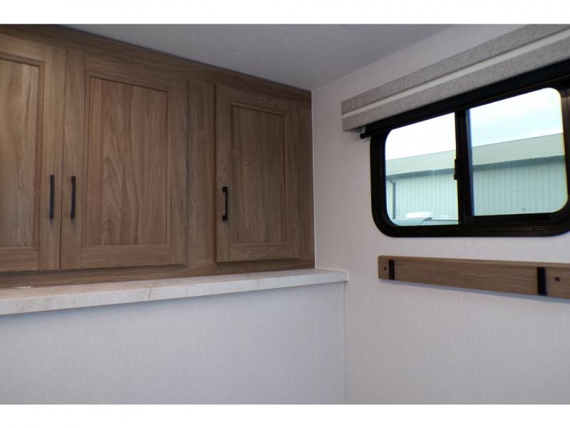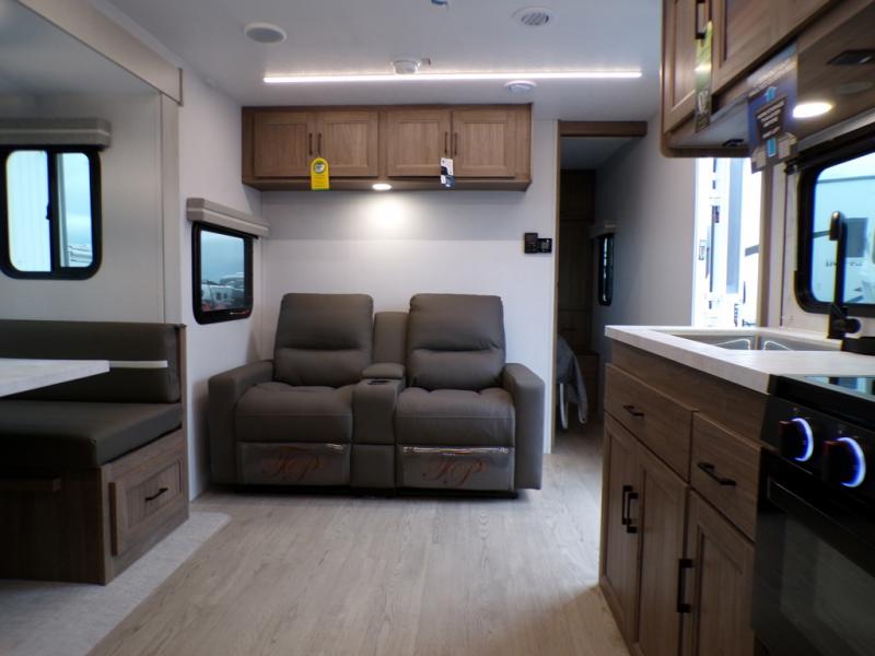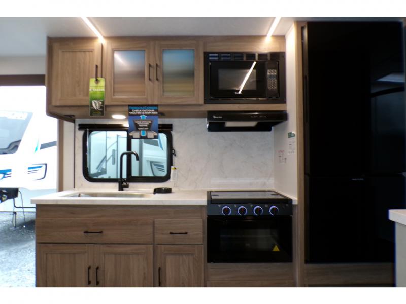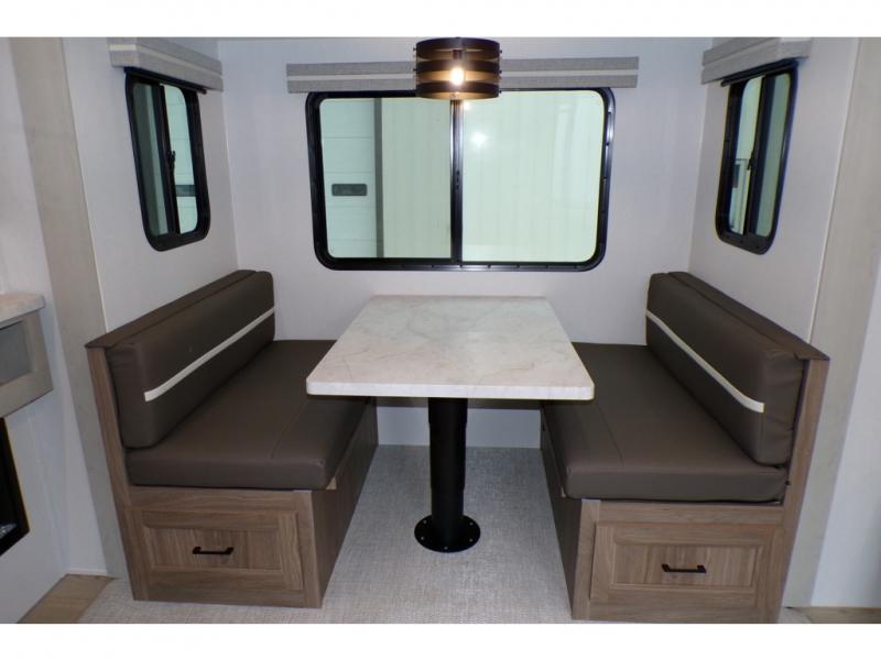 This travel trailer will feel just like home with its private bedroom and spacious full rear bath. You will appreciate the vaulted under-bed storage for extra blankets, shoes, and luggage, plus there are dual wardrobes on either side of the bed for your book and glasses. Get comfortable in the main living area on the sofa or at the booth dinette, or you can choose the optional theater seat or optional hide-a-bed sofa in place of the standard sofa. The chef of your group can prepare meals indoors or outdoors on the full camp kitchen, and check out the large 20' power awning with LED lights that will provide protection from the elements.
