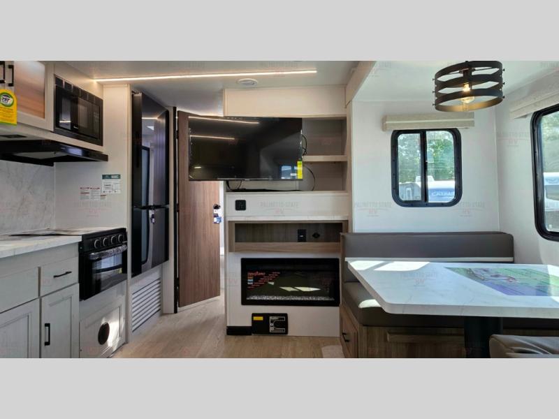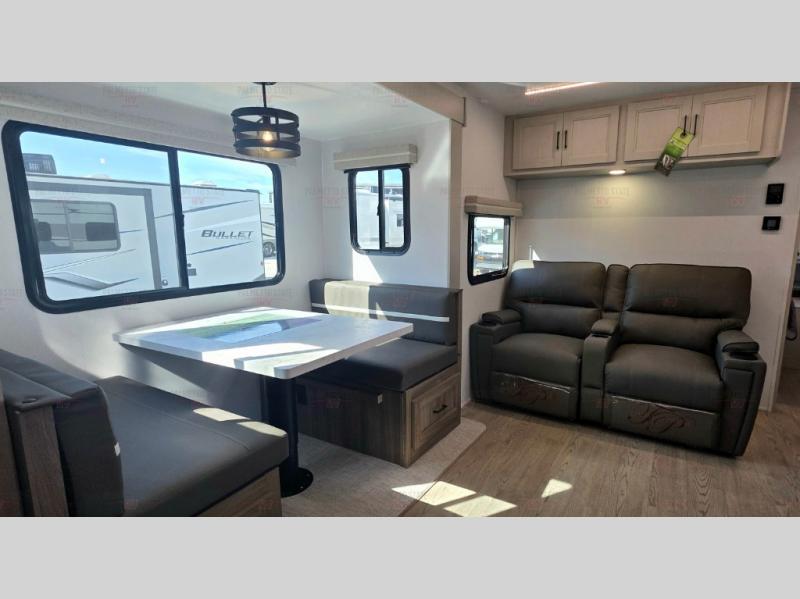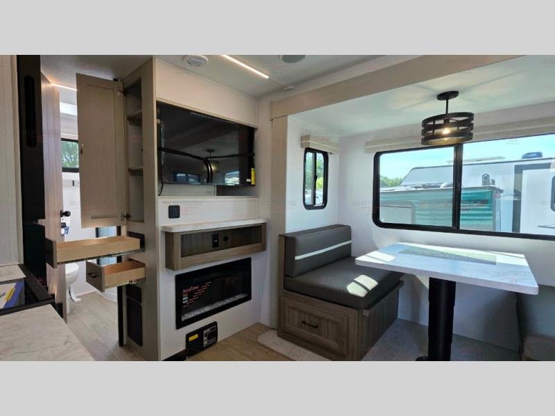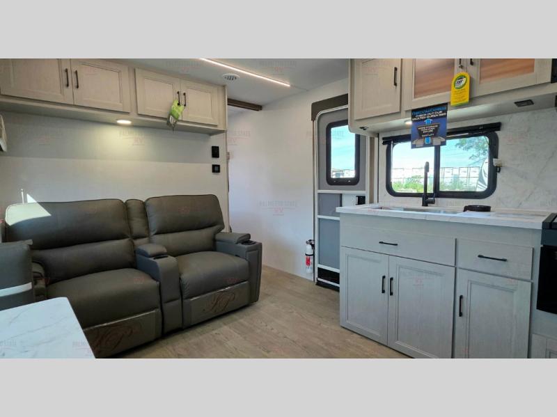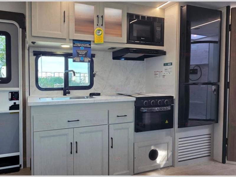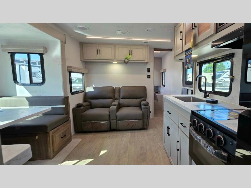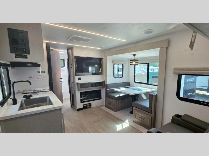 This travel trailer will feel just like home with its private bedroom and spacious full rear bath. You will appreciate the vaulted under-bed storage for extra blankets, shoes, and luggage, plus there are dual wardrobes on either side of the bed for your book and glasses. Get comfortable in the main living area on the sofa or at the booth dinette, or you can choose the optional theater seat or optional hide-a-bed sofa in place of the standard sofa. The chef of your group can prepare meals indoors or outdoors on the full camp kitchen, and check out the large 20' power awning with LED lights that will provide protection from the elements.