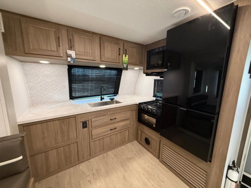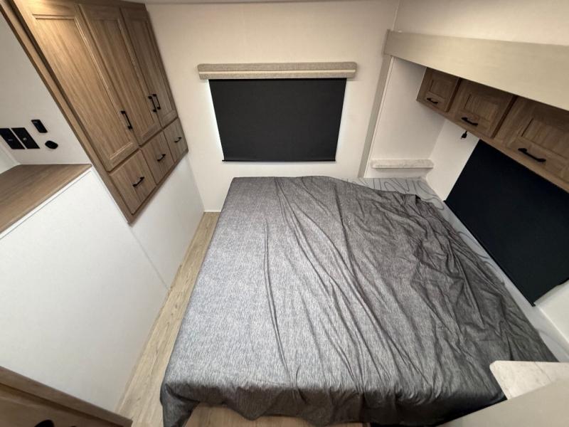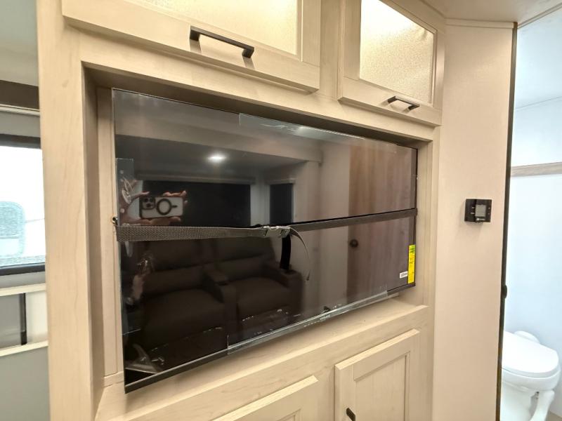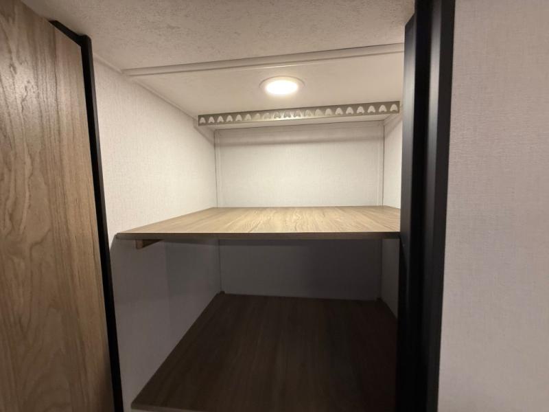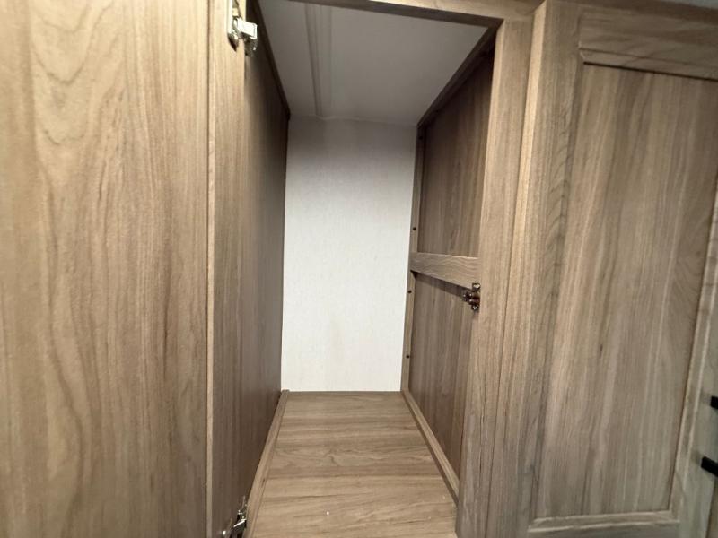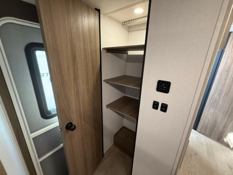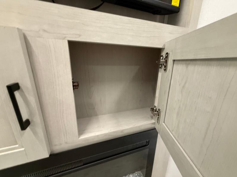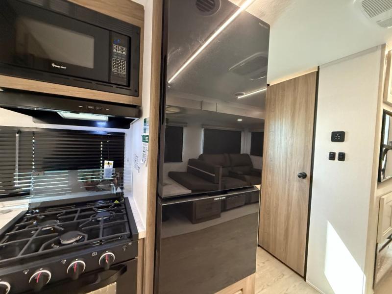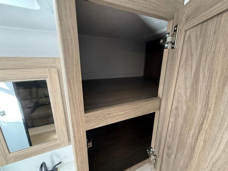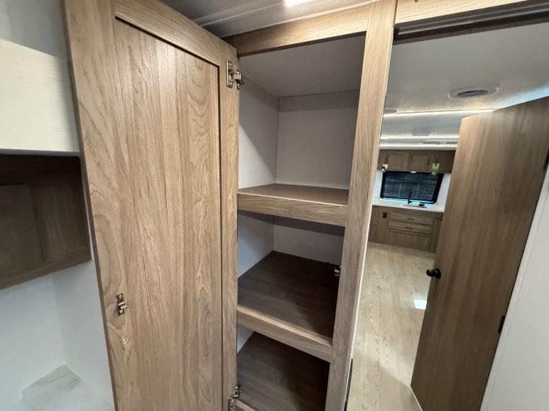 Comfort comes easy in this front kitchen travel trailer for four! You will love the rear master bedroom with its king bed slide out, spacious wardrobe, and a private entrance into the dual entry bath. There is a sofa that sits directly across from the fireplace and entertainment center, or you can choose the optional theater seat or optional hide-a-bed sofa in place of the standard sofa. The front kitchen features tons of counter space, an 8 cu. ft. double door refrigerator, plus a large pantry for dry good and snacks. There is also a pantry/closet just as you enter the trailer that will be perfect for shoes and jackets!