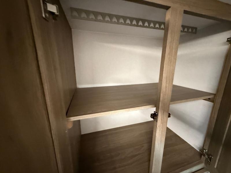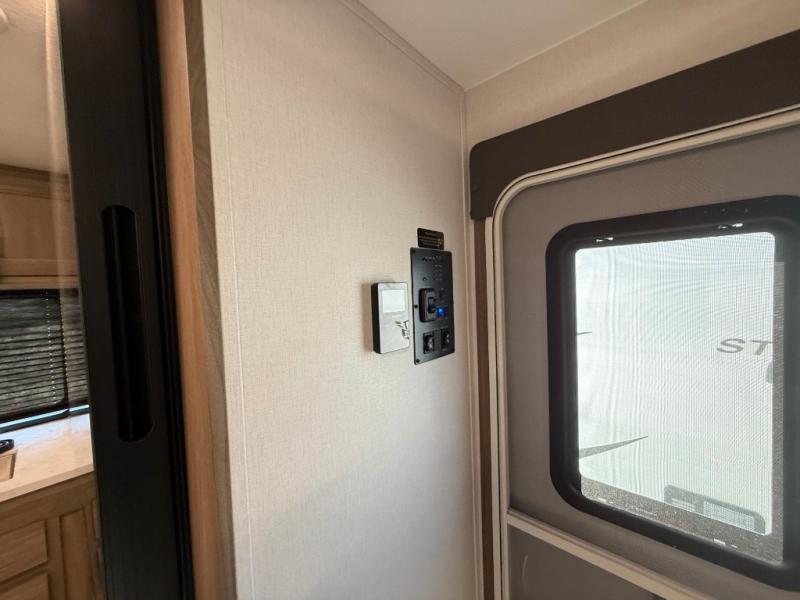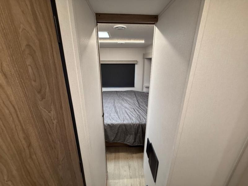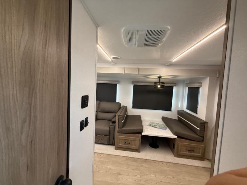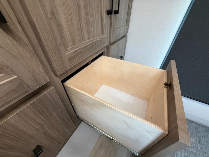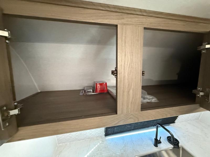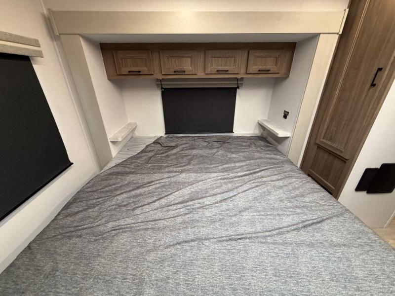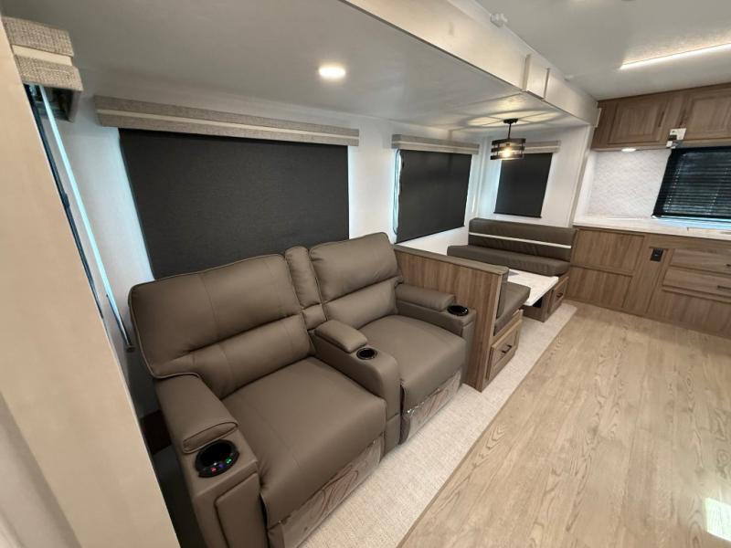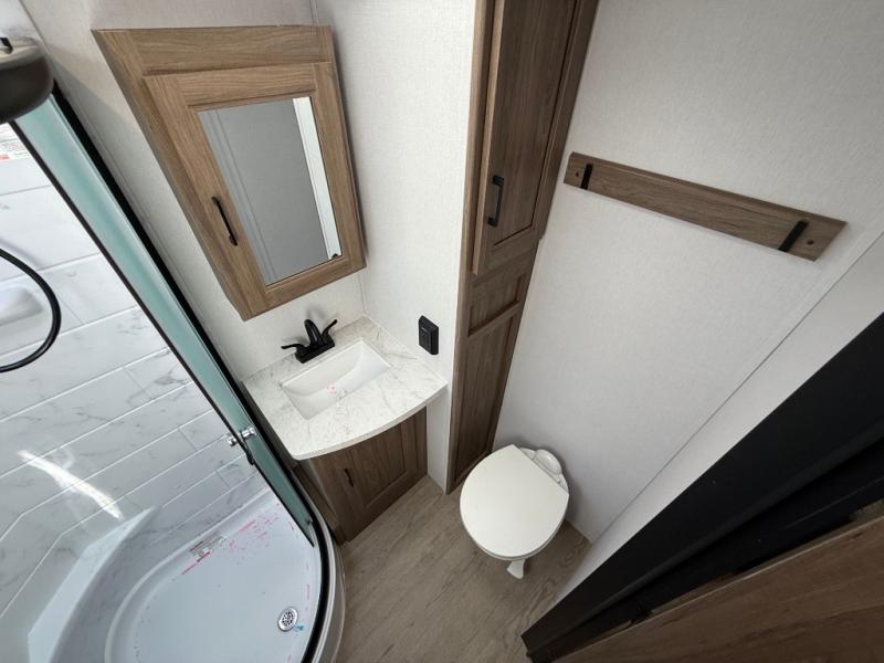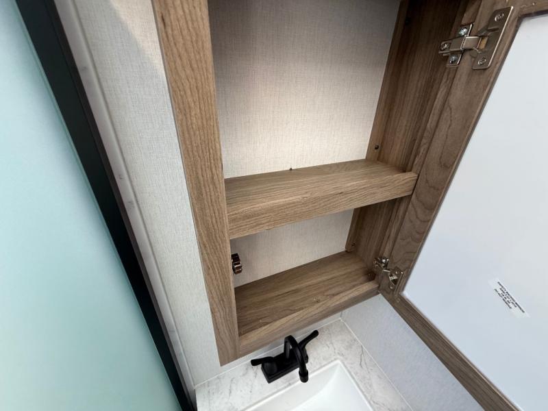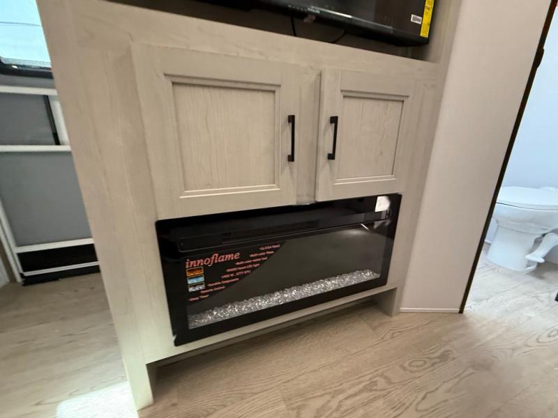 Comfort comes easy in this front kitchen travel trailer for four! You will love the rear master bedroom with its king bed slide out, spacious wardrobe, and a private entrance into the dual entry bath. There is a sofa that sits directly across from the fireplace and entertainment center, or you can choose the optional theater seat or optional hide-a-bed sofa in place of the standard sofa. The front kitchen features tons of counter space, an 8 cu. ft. double door refrigerator, plus a large pantry for dry good and snacks. There is also a pantry/closet just as you enter the trailer that will be perfect for shoes and jackets!