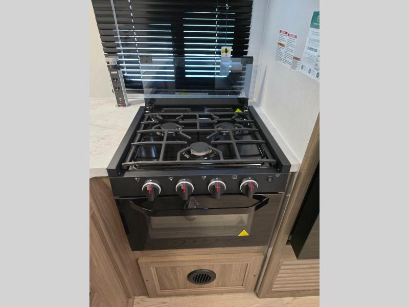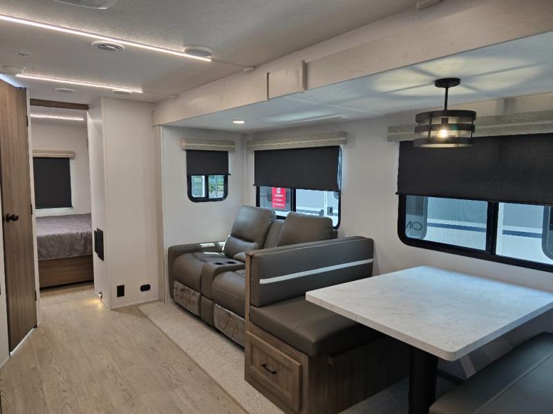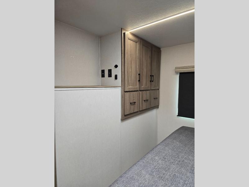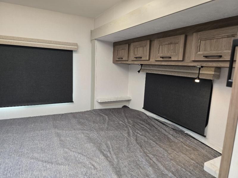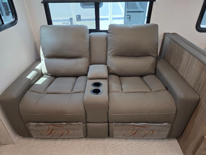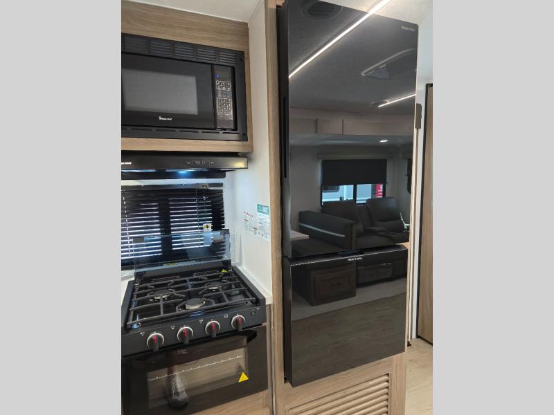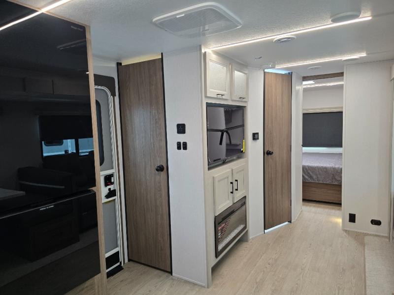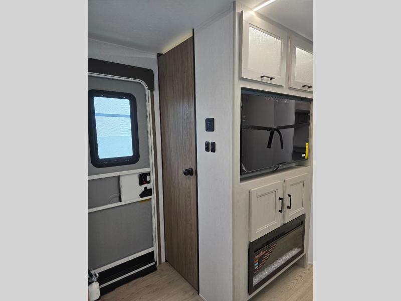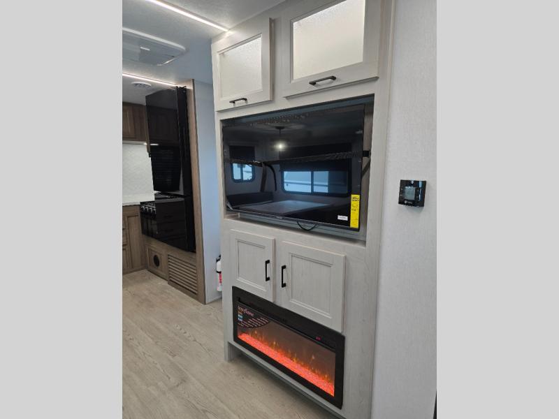 Comfort comes easy in this front kitchen travel trailer for four! You will love the rear master bedroom with its king bed slide out, spacious wardrobe, and a private entrance into the dual entry bath. There is a sofa that sits directly across from the fireplace and entertainment center, or you can choose the optional theater seat or optional hide-a-bed sofa in place of the standard sofa. The front kitchen features tons of counter space, an 8 cu. ft. double door refrigerator, plus a large pantry for dry good and snacks. There is also a pantry/closet just as you enter the trailer that will be perfect for shoes and jackets!