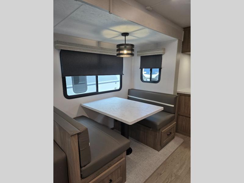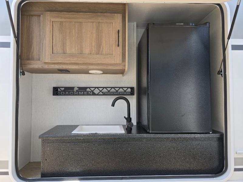 With any Freedom Express Ultra Lite travel trailer by Coachmen you will appreciate quality construction materials, such as vacuum bonded walls with Azdel composite, a 3/4 gel coated fiberglass cap with an automotive glass windshield, and a heated enclosed underbelly. Each model also features Tufflex PVC roofing, front rock guard, and E-Z Lube axles for smooth towing. Inside, you'll find kitchen backsplash, hidden hinge cabinetry, and wear-resistant vinyl flooring throughout. The power tongue jack included with the Ultra Lite Express Package will make set-up a breeze, and each model includes back-up camera prep and they are Freedom solar ready if you plan to go off-grid. Enjoy lightweight camping with a Freedom Express Ultra Lite travel trailer today!
