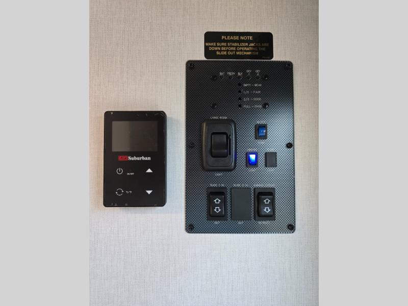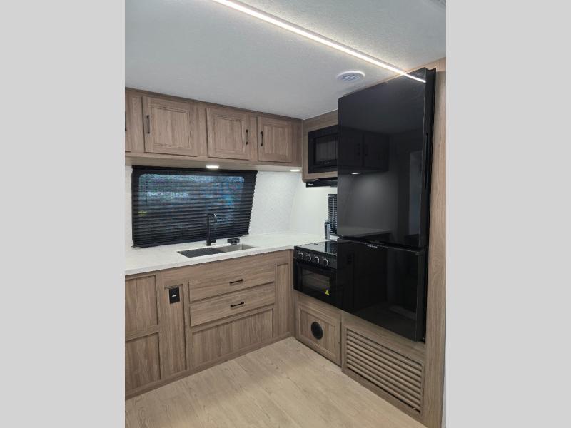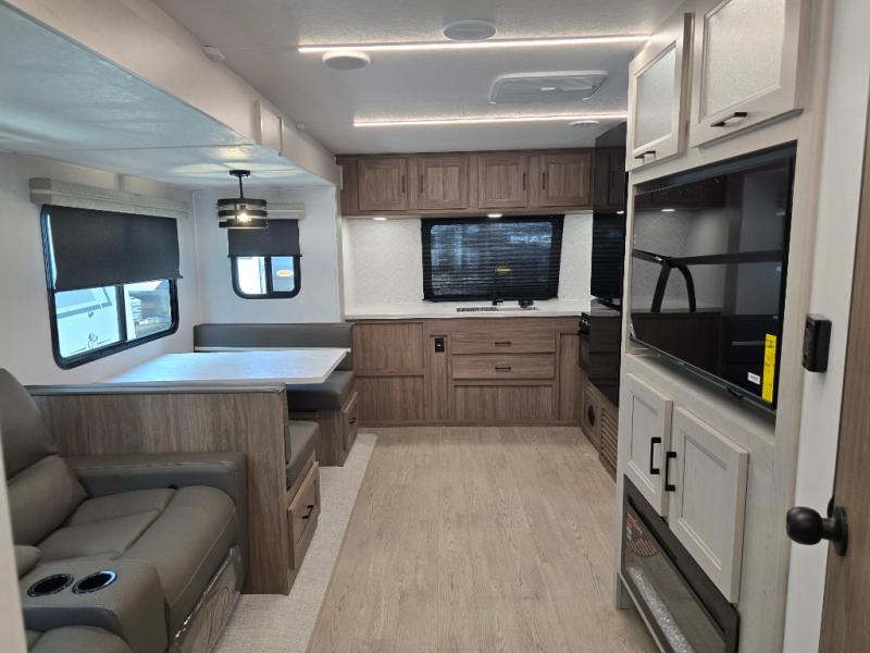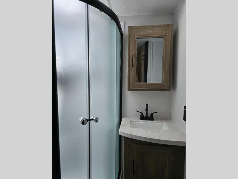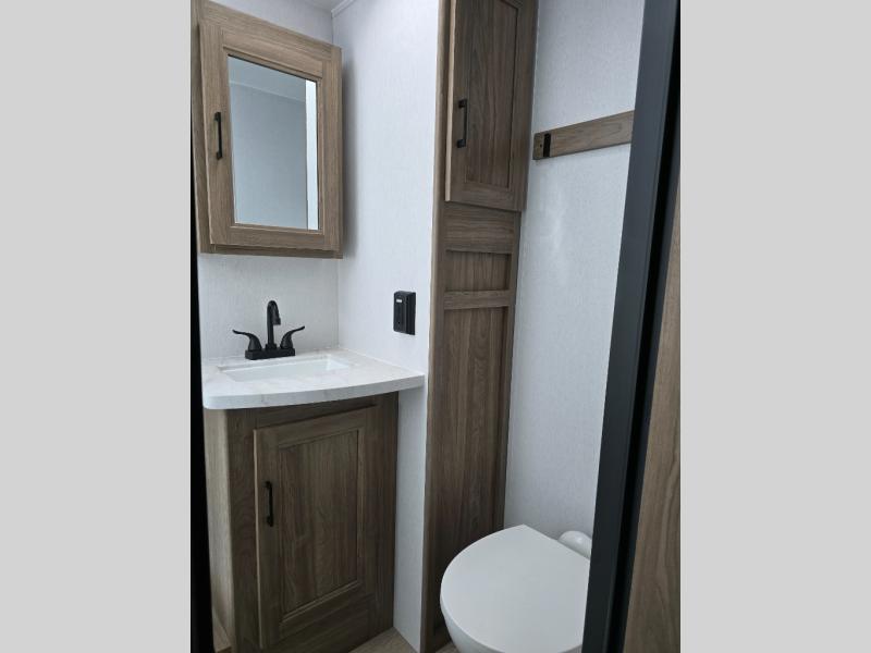 Comfort comes easy in this front kitchen travel trailer for four! You will love the rear master bedroom with its king bed slide out, spacious wardrobe, and a private entrance into the dual entry bath. There is a sofa that sits directly across from the fireplace and entertainment center, or you can choose the optional theater seat or optional hide-a-bed sofa in place of the standard sofa. The front kitchen features tons of counter space, an 8 cu. ft. double door refrigerator, plus a large pantry for dry good and snacks. There is also a pantry/closet just as you enter the trailer that will be perfect for shoes and jackets!