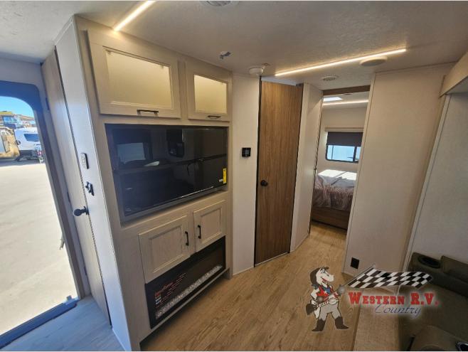 Comfort comes easy in this front kitchen travel trailer for four! You will love the rear master bedroom with its king bed slide out, spacious wardrobe, and a private entrance into the dual entry bath. There is a sofa that sits directly across from the fireplace and entertainment center, or you can choose the optional theater seat or optional hide-a-bed sofa in place of the standard sofa. The front kitchen features tons of counter space, an 8 cu. ft. double door refrigerator, plus a large pantry for dry good and snacks. There is also a pantry/closet just as you enter the trailer that will be perfect for shoes and jackets!