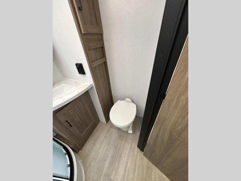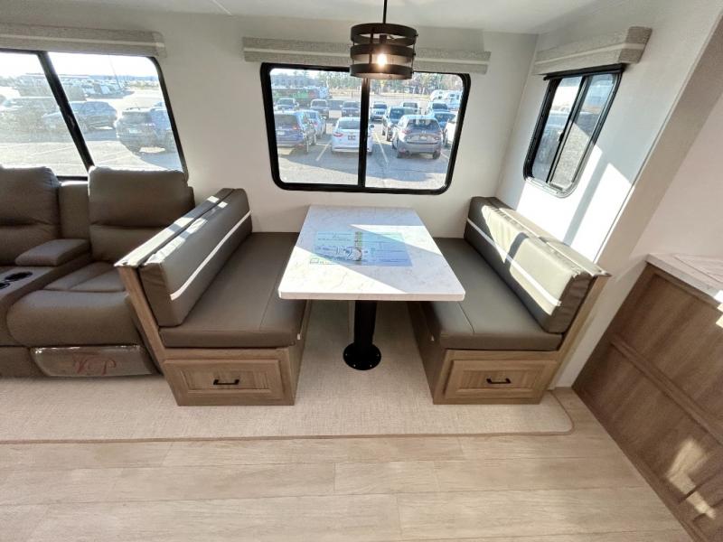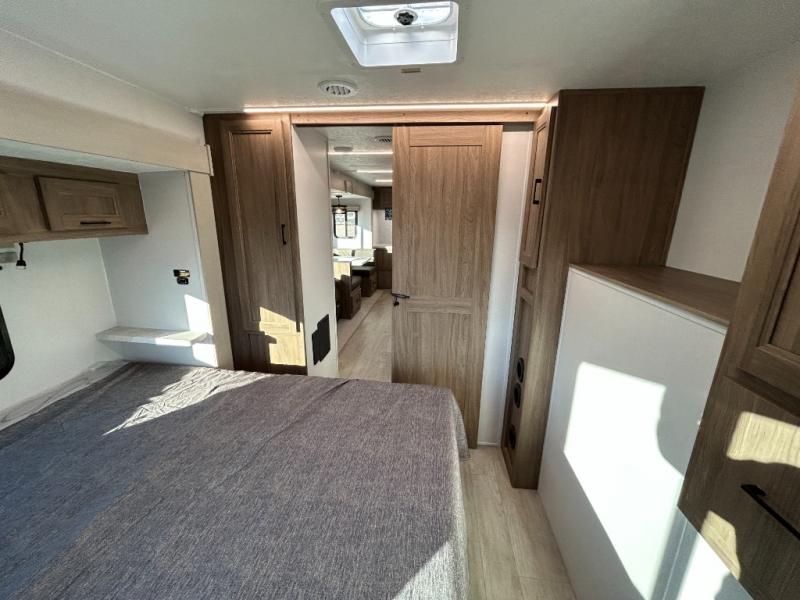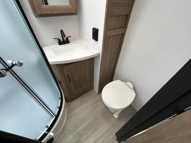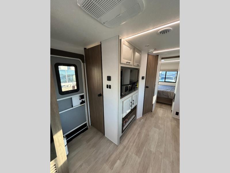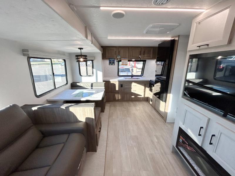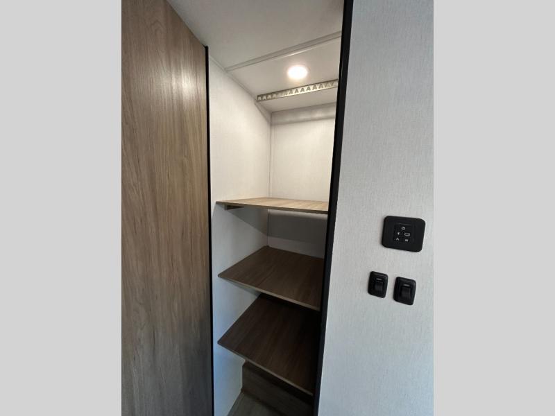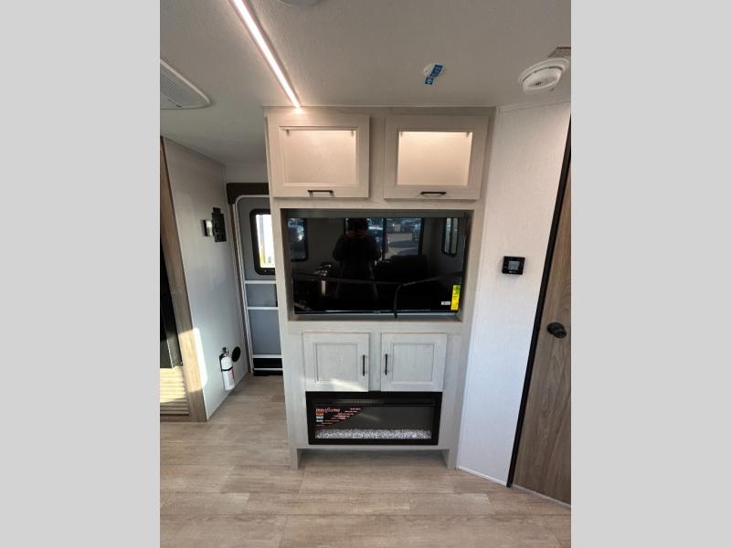 Comfort comes easy in this front kitchen travel trailer for four! You will love the rear master bedroom with its king bed slide out and spacious wardrobe. There is a sofa that sits directly across from the fireplace and entertainment center, or you can choose the optional theater seat or optional hide-a-bed sofa in place of the standard sofa. The front kitchen features tons of counter space, a 10 cu. ft. 12V refrigerator, plus a large pantry for dry good and snacks. There is also a pantry/closet just as you enter the trailer that will be perfect for shoes and jackets!