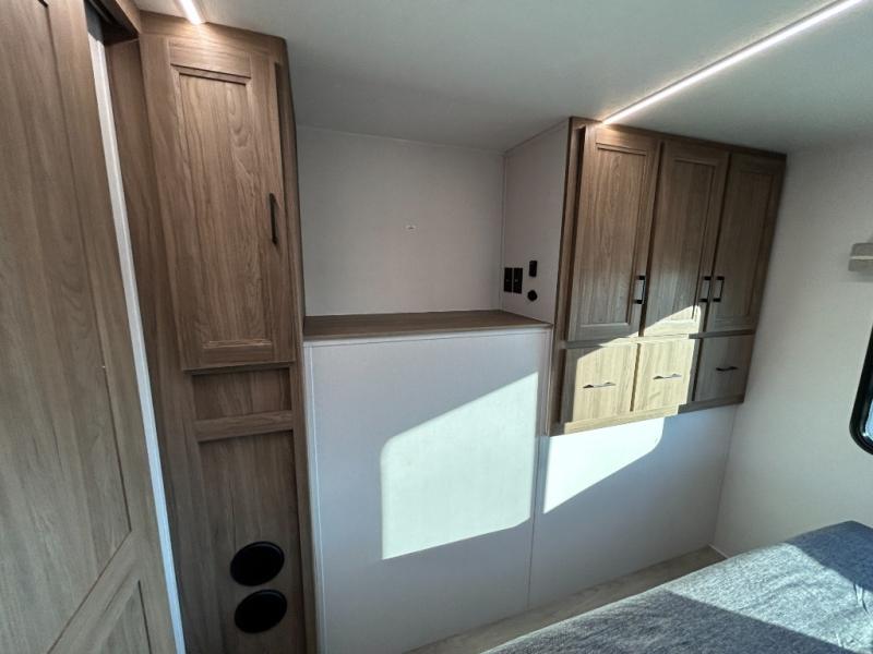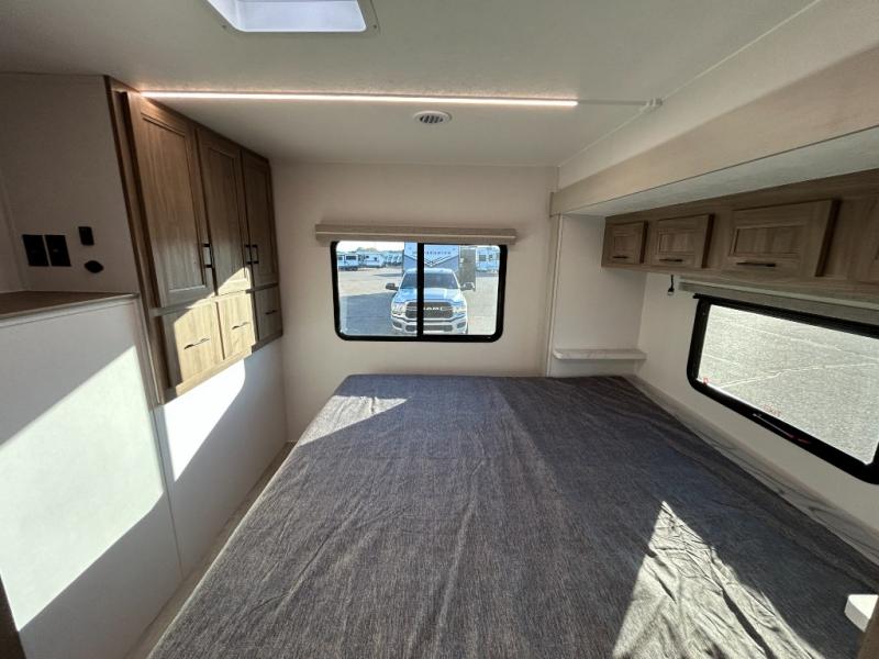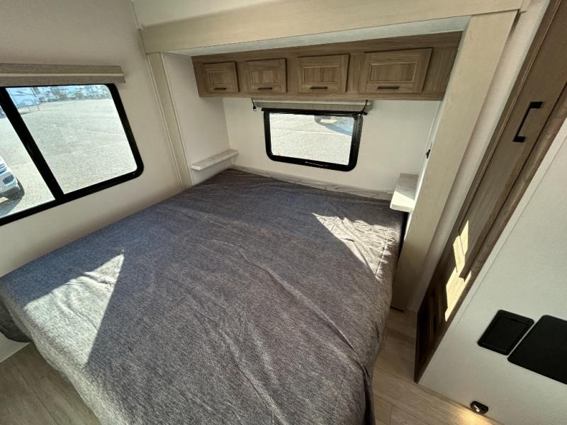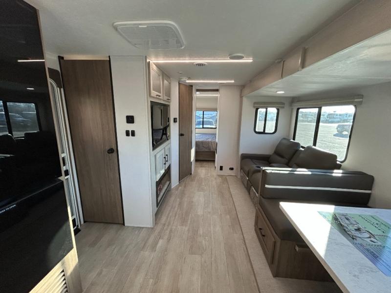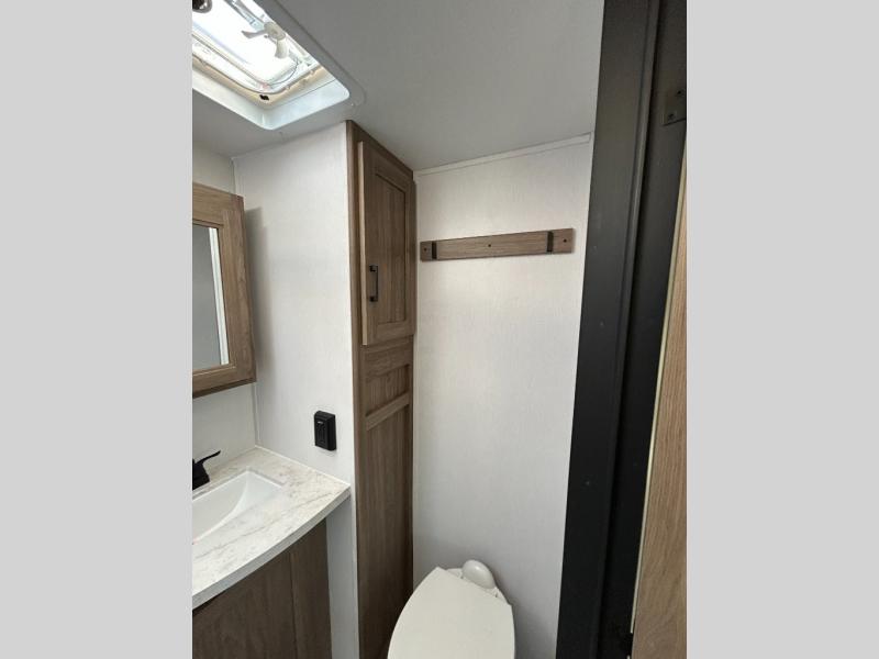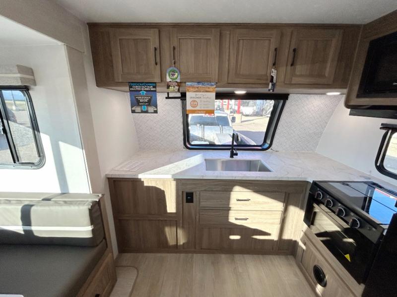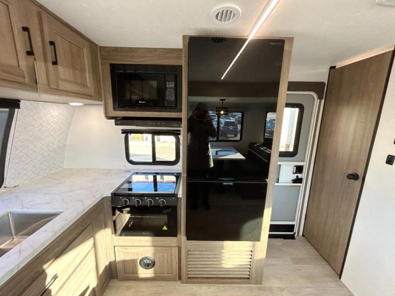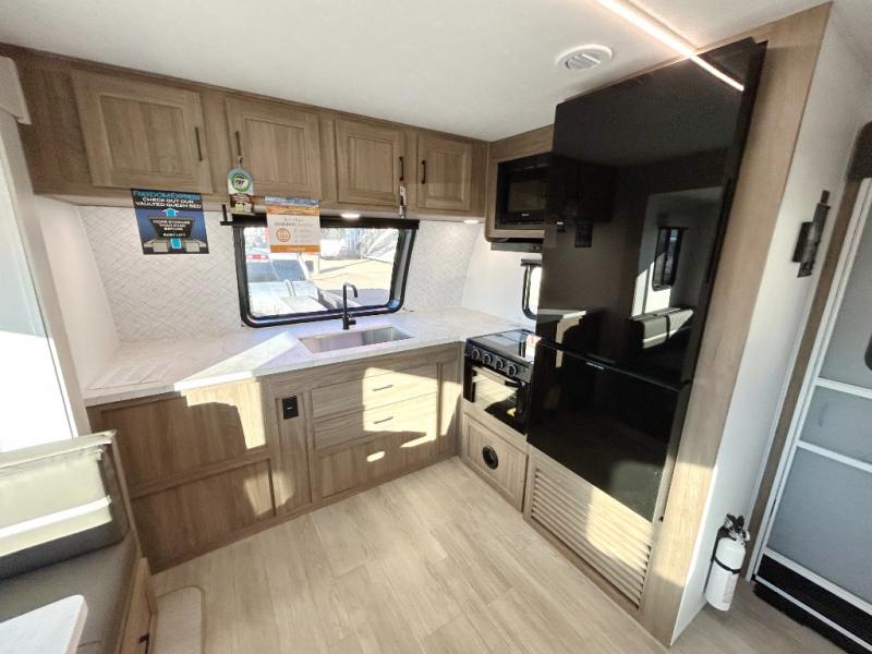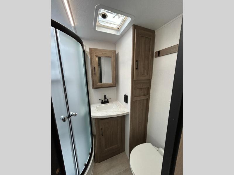 Comfort comes easy in this front kitchen travel trailer for four! You will love the rear master bedroom with its king bed slide out and spacious wardrobe. There is a sofa that sits directly across from the fireplace and entertainment center, or you can choose the optional theater seat or optional hide-a-bed sofa in place of the standard sofa. The front kitchen features tons of counter space, a 10 cu. ft. 12V refrigerator, plus a large pantry for dry good and snacks. There is also a pantry/closet just as you enter the trailer that will be perfect for shoes and jackets!