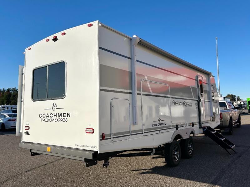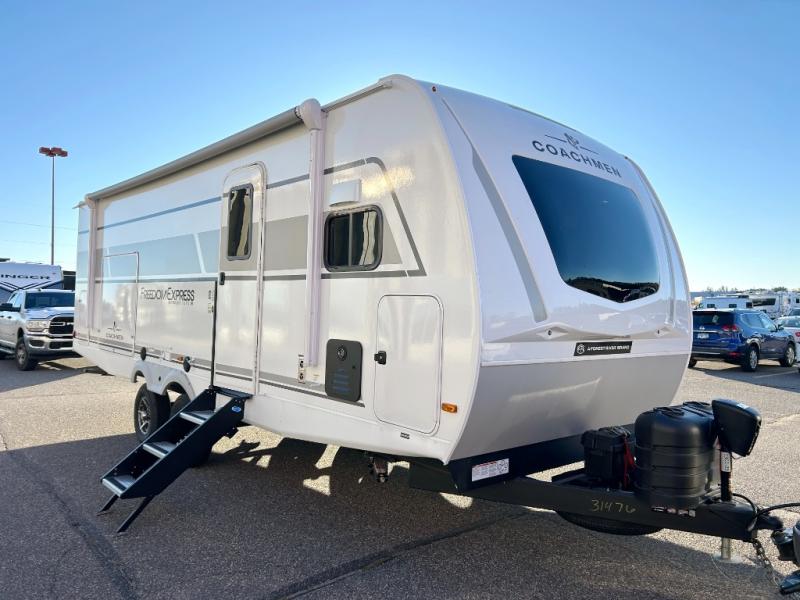 With any Freedom Express Ultra Lite travel trailer by Coachmen you will appreciate quality construction materials, such as vacuum bonded walls with Azdel composite, a 3/4 gel coated fiberglass cap with an automotive glass windshield, and a heated enclosed underbelly. Each model also features Tufflex PVC roofing, front rock guard, and E-Z Lube axles for smooth towing. Inside, you'll find kitchen backsplash, hidden hinge cabinetry, and wear-resistant vinyl flooring throughout. The power tongue jack included with the Ultra Lite Express Package will make set-up a breeze, and each model includes back-up camera prep and they are Freedom solar ready if you plan to go off-grid. Enjoy lightweight camping with a Freedom Express Ultra Lite travel trailer today!