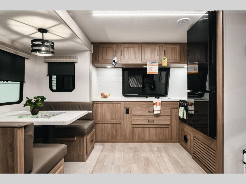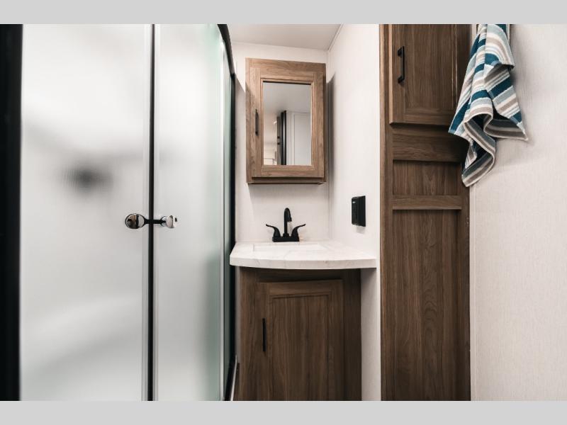 Comfort comes easy in this front kitchen travel trailer for four! You will love the rear master bedroom with its king bed slide out and spacious wardrobe. There is a sofa that sits directly across from the fireplace and entertainment center, or you can choose the optional theater seat or optional hide-a-bed sofa in place of the standard sofa. The front kitchen features tons of counter space, a 10 cu. ft. 12V refrigerator, plus a large pantry for dry good and snacks. There is also a pantry/closet just as you enter the trailer that will be perfect for shoes and jackets!