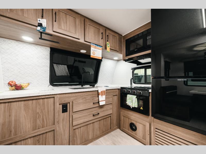 Comfort comes easy in this front kitchen travel trailer for four! You will love the rear master bedroom with its king bed slide out and spacious wardrobe. There is a sofa that sits directly across from the fireplace and entertainment center, or you can choose the optional theater seat or optional hide-a-bed sofa in place of the standard sofa. The front kitchen features tons of counter space, a 10 cu. ft. 12V refrigerator, plus a large pantry for dry good and snacks. There is also a pantry/closet just as you enter the trailer that will be perfect for shoes and jackets!
